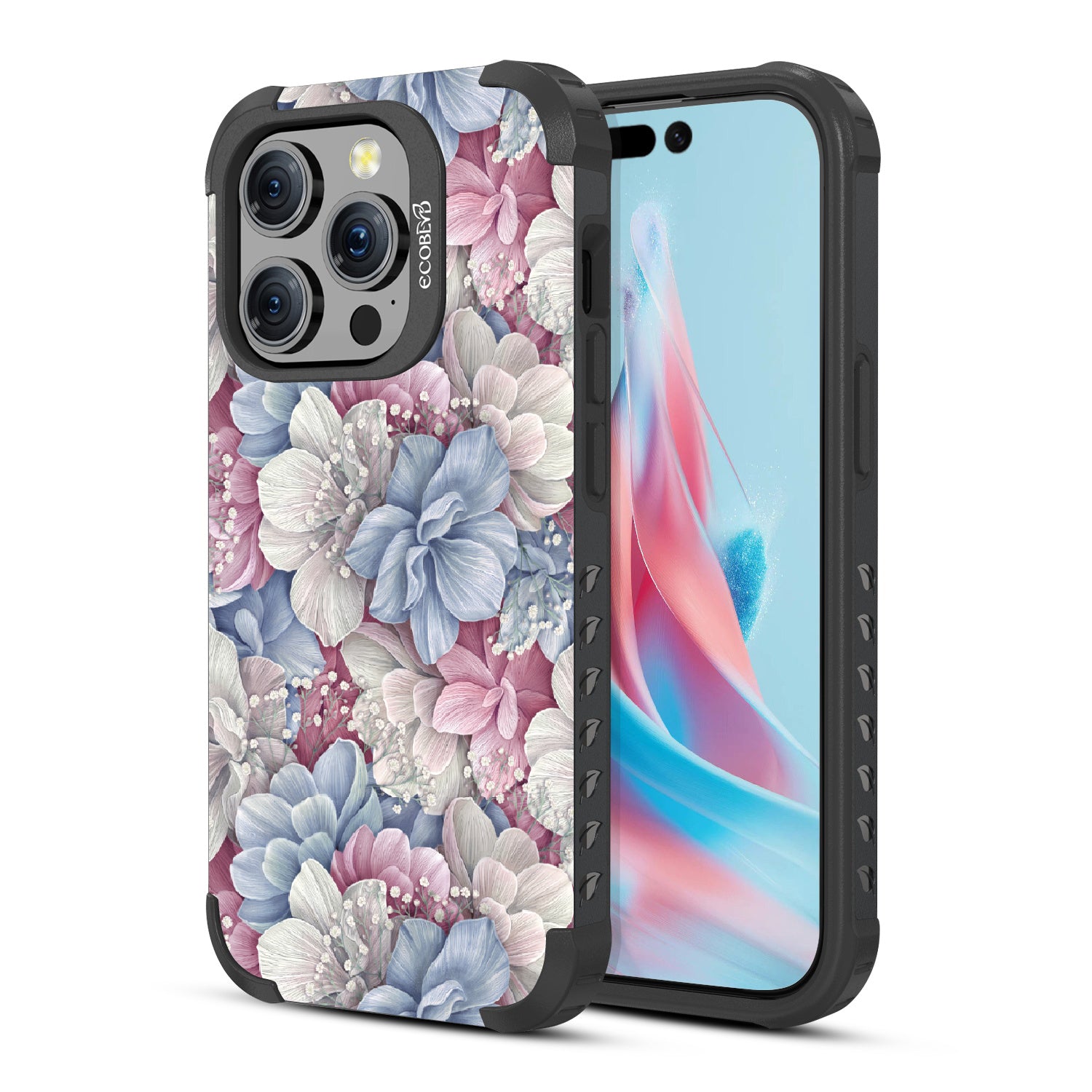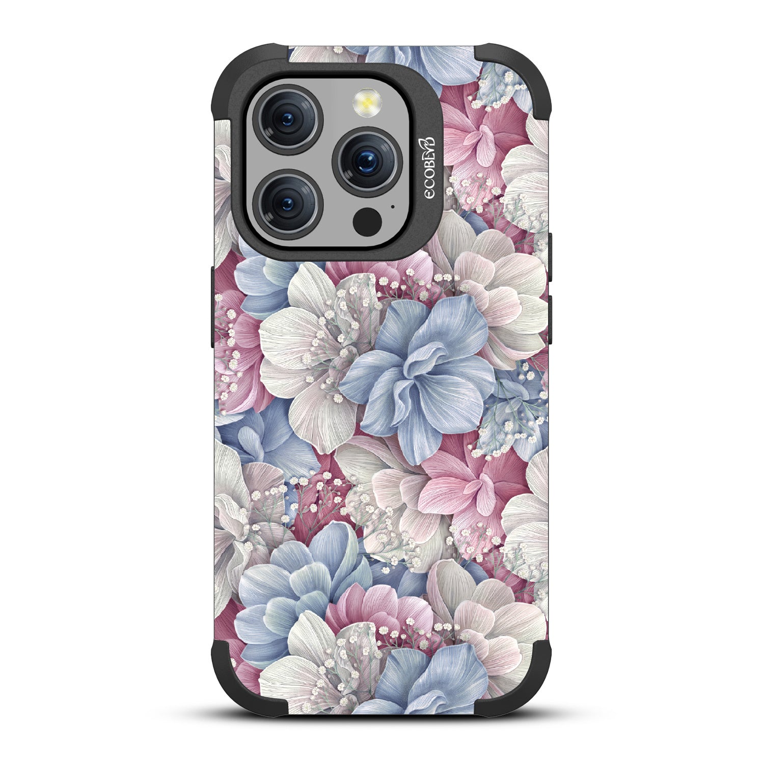 The Petals & Pearls design on our Mojave rugged and compostable iPhone 15 Pro case is like a melody of spring, its pastel colors swaying like a sweet tune and the water droplets on the petals ringing like pearls, harmoniously reflecting the blooming beauty of the season. Available in our bold Midnight Black colorway.