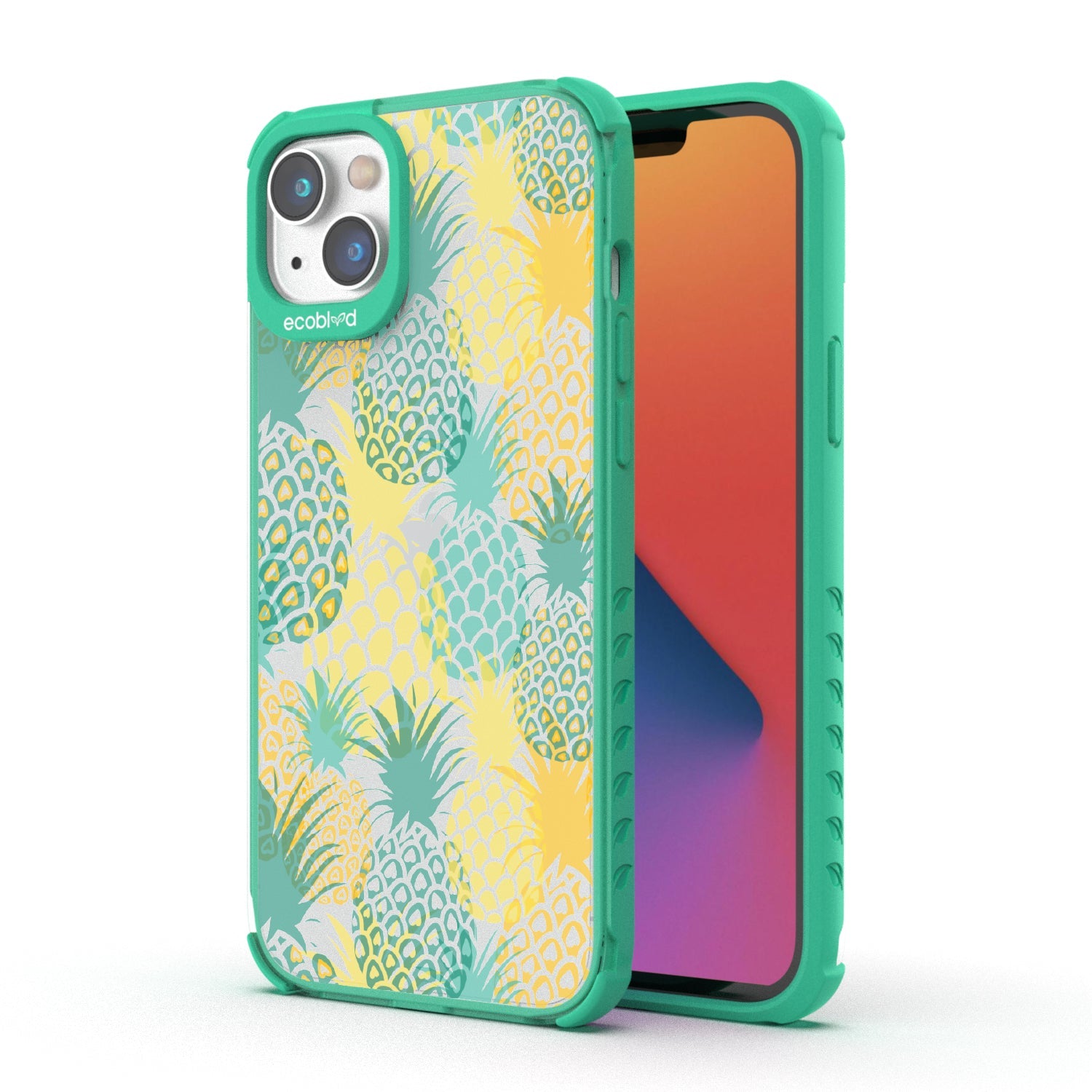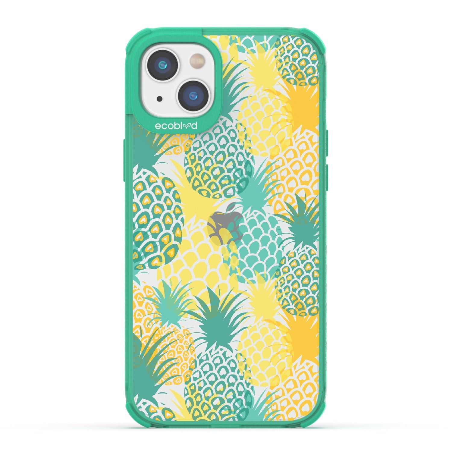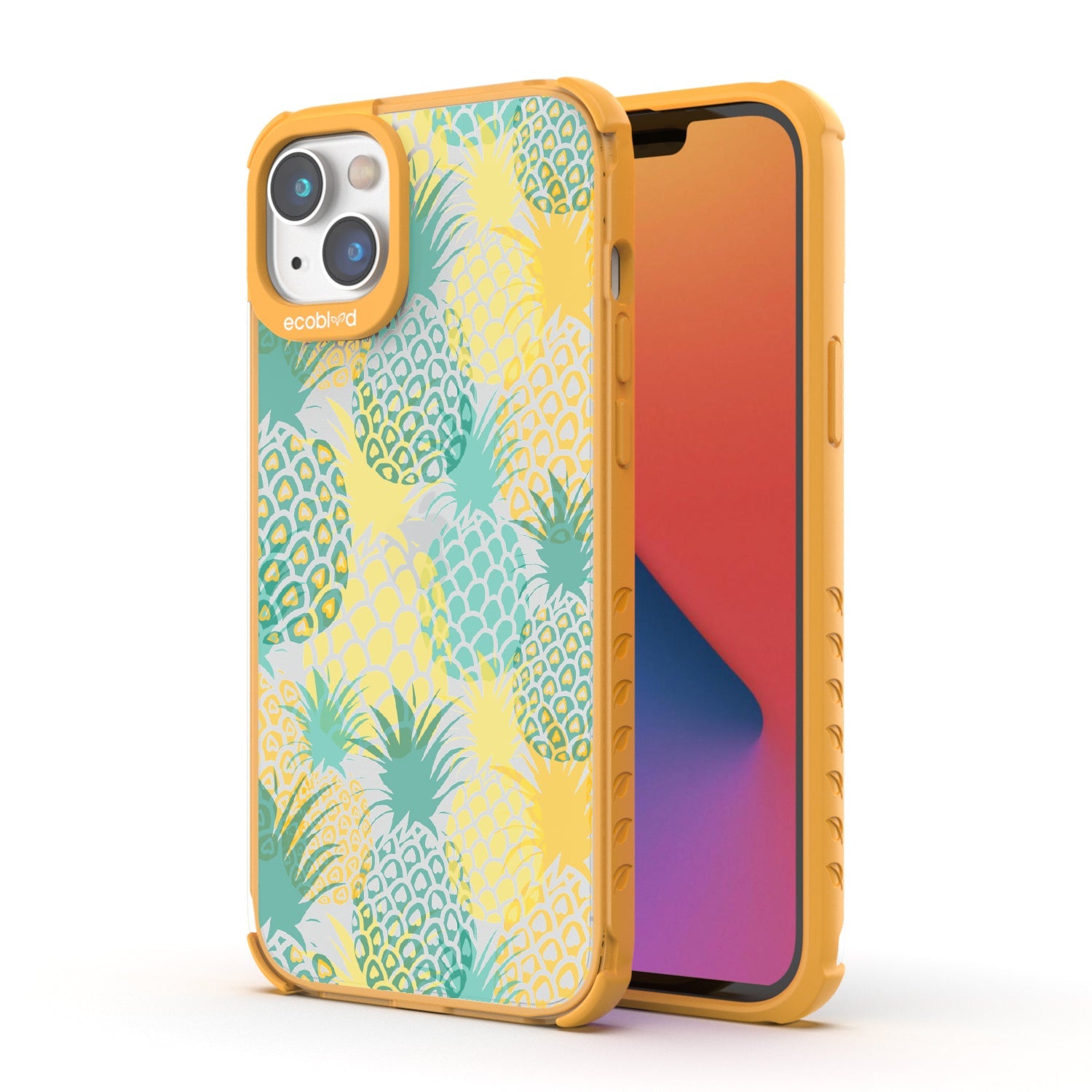 If you like Pina Coladas and getting caught in the sun, then this design on our Laguna clear iPhone 16e, iPhone 14, and iPhone 13 case is for you! Pineapple Breeze is a refreshing phone case that embodies the spirit of tropical relaxation. Its vibrant array of ripe pineapples will transport you to exotic shores, where the golden rays of the sun dance upon your skin.