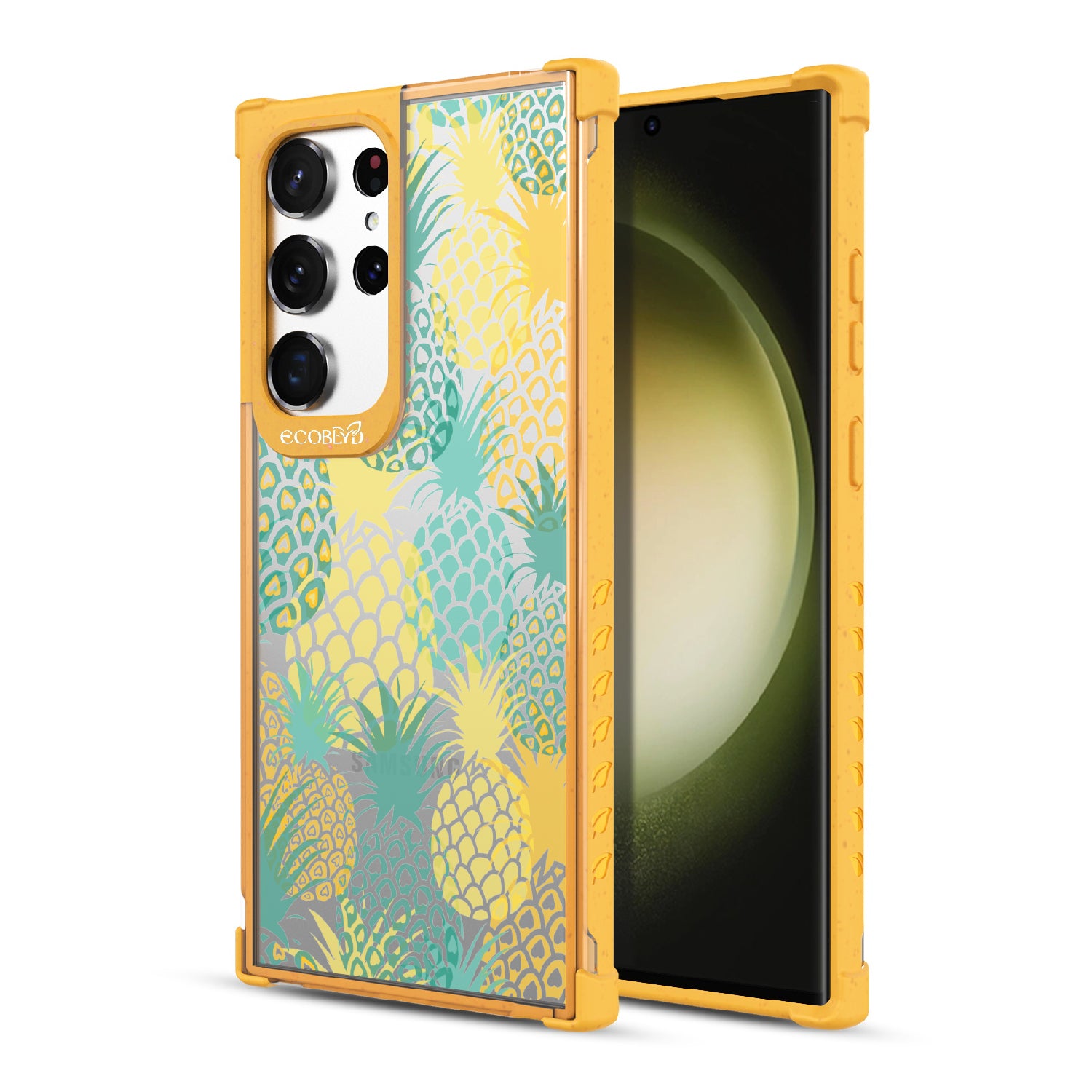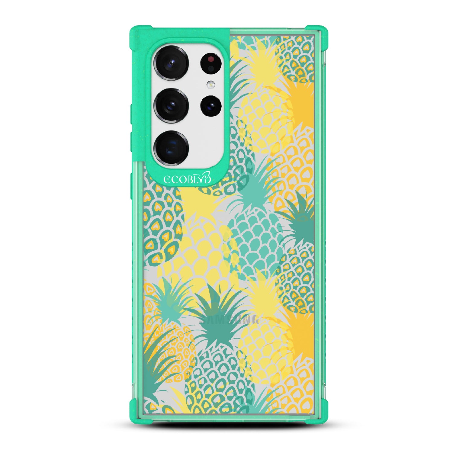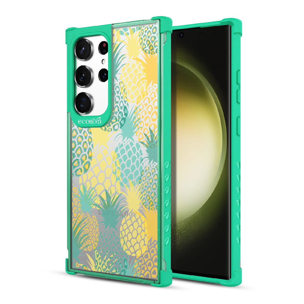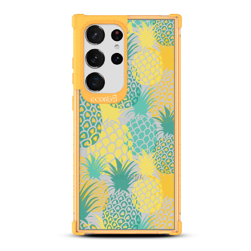 If you like Pina Coladas and getting caught in the sun, then this design on our Laguna clear Galaxy S23 Ultra case is for you! Pineapple Breeze is a refreshing phone case that embodies the spirit of tropical relaxation. Its vibrant array of ripe pineapples will transport you to exotic shores, where the golden rays of the sun dance upon your skin.
