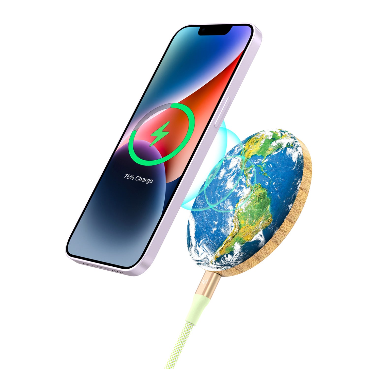 The charger's chip, connector, and internal components are meticulously crafted from reclaimed aluminum, steel, bamboo, and other sustainable materials, ensuring it meets the demands of 15W fast wireless charging without generating extra waste or using excess electricity.