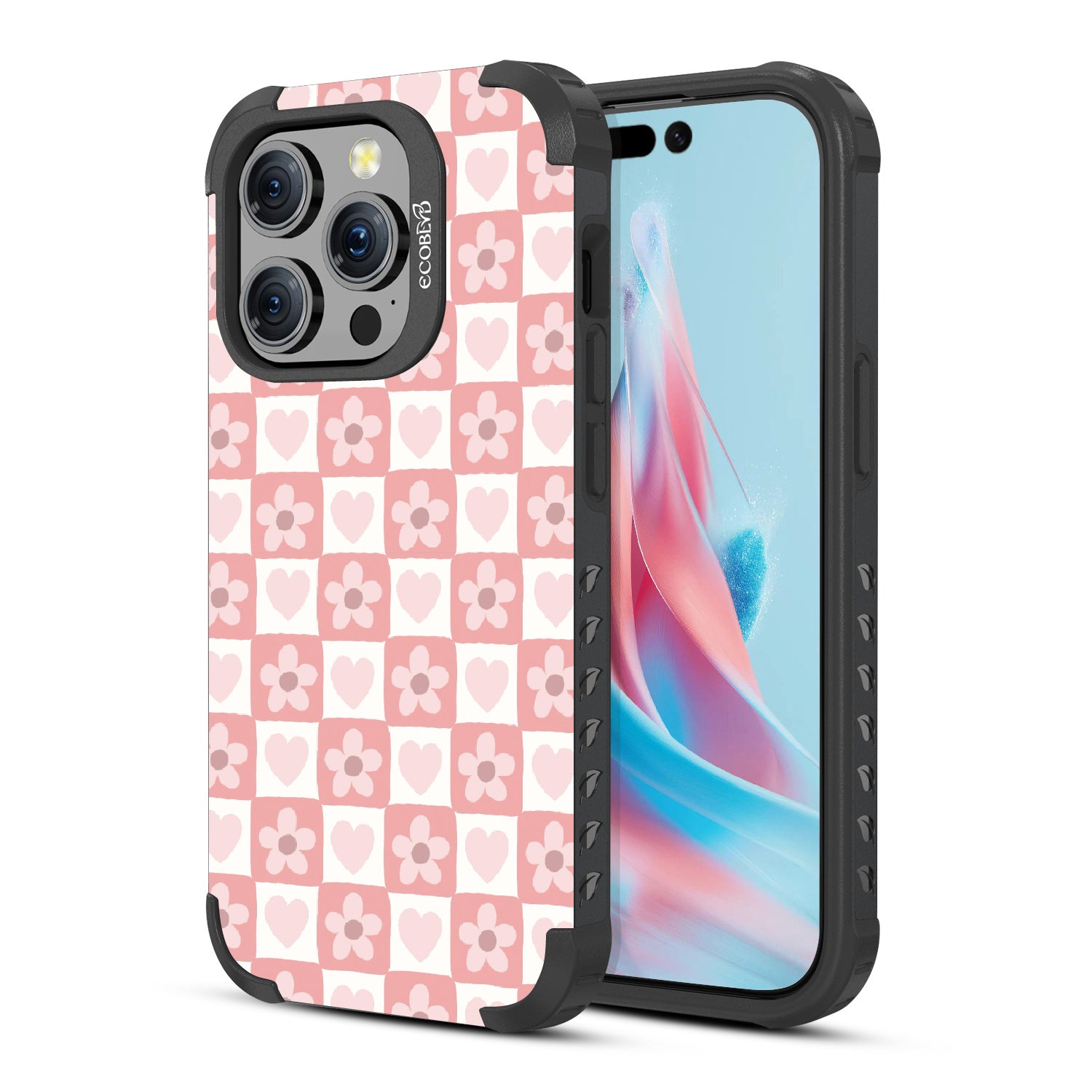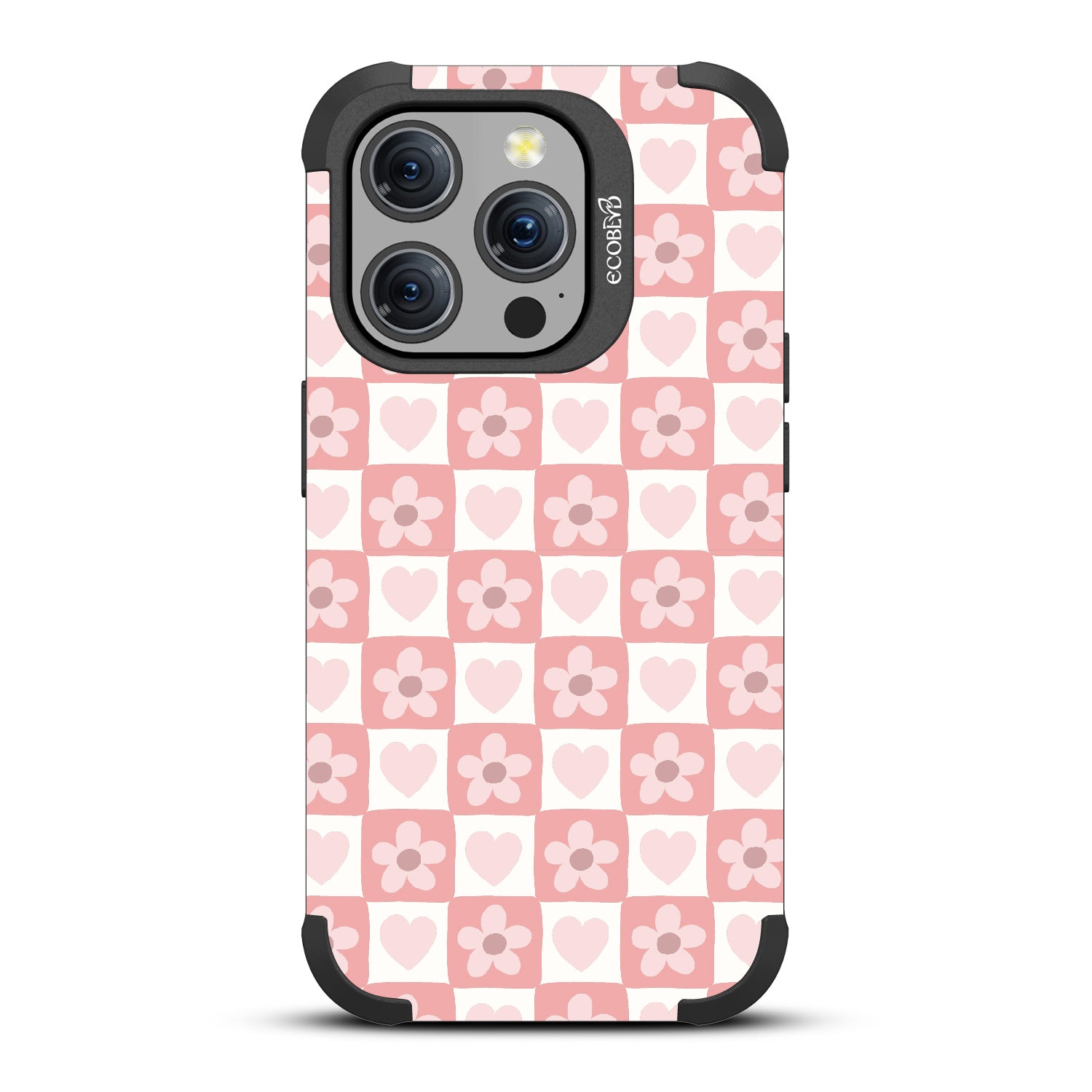 Play your style right and make every move count with the Pretty Moves design on our Mojave rugged and compostable iPhone 15 Pro MagSafe case. Adorned with hearts and flowers, this girly checker print pattern brings a sweet yet strategic flair to your phone. Each piece is a step towards fashion wins.