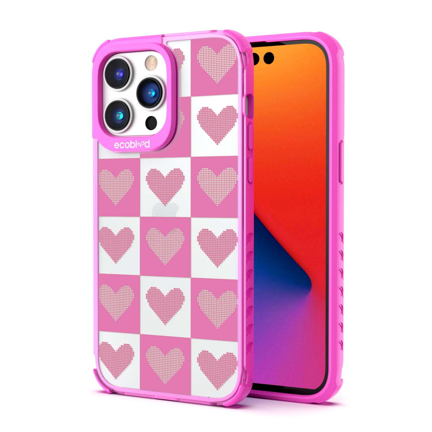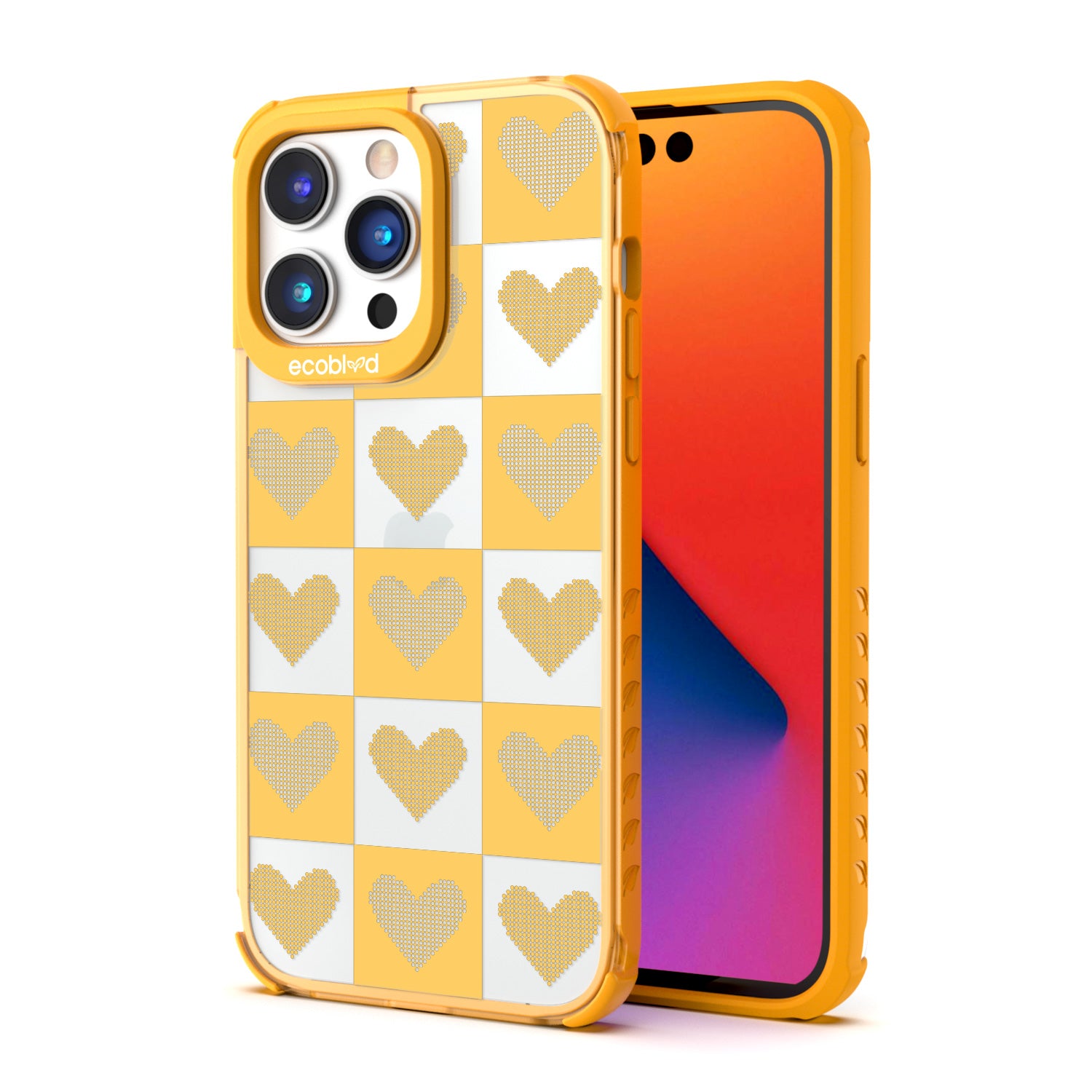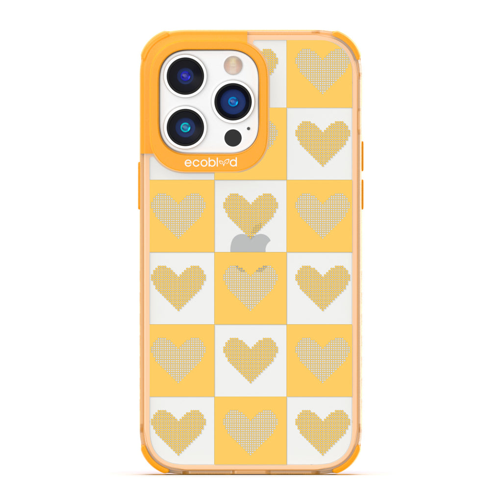 Soften up with the quilted hearts of the Quilty Pleasures design on our Laguna clear iPhone 14 Pro Max case, lovingly stitched and crafted with a gingham plaid pattern and hearts sewn inside to give you a warm embrace every time you look at your phone with 6 lovely colorways: Midnight Black, Red on Midnight Black, Cascade Blue, Foliage Green, Illuminating Yellow, and Wildflower Pink.