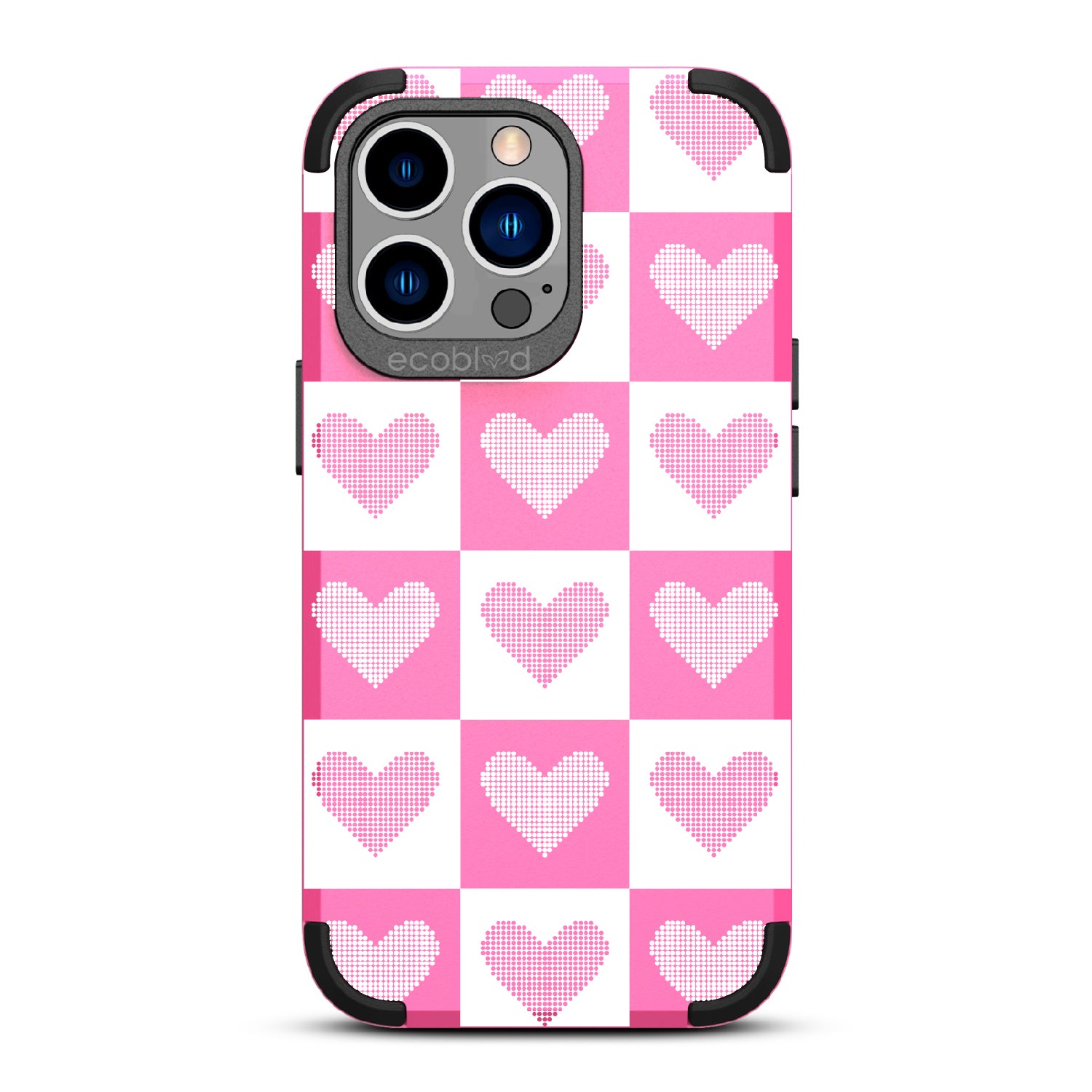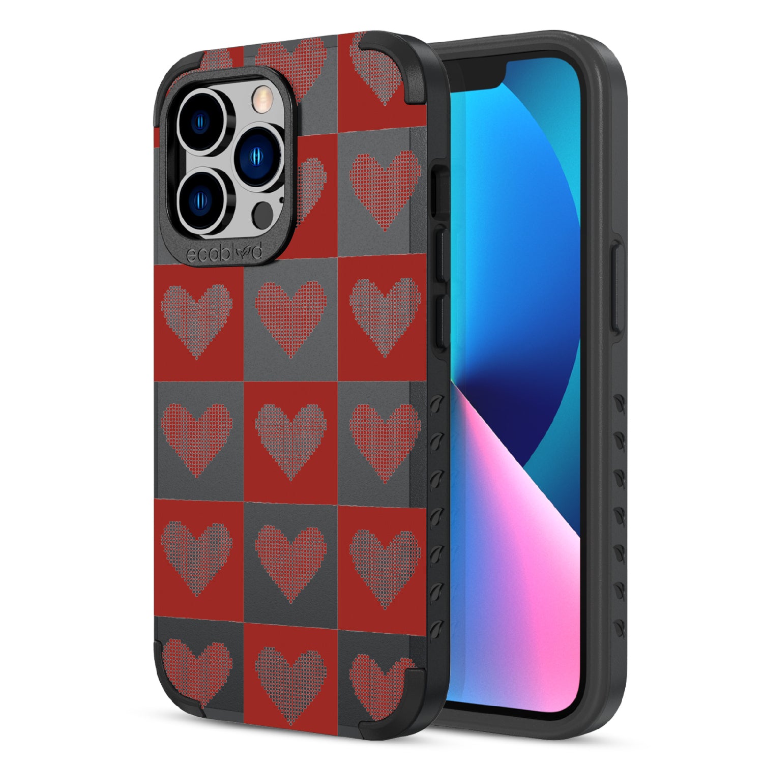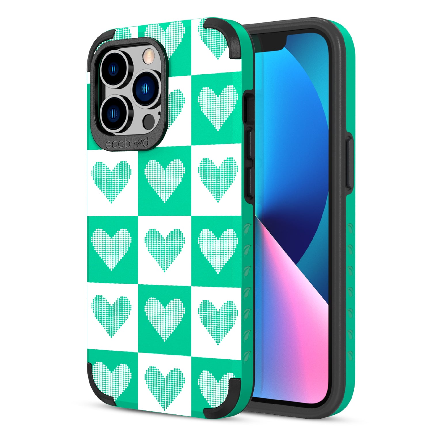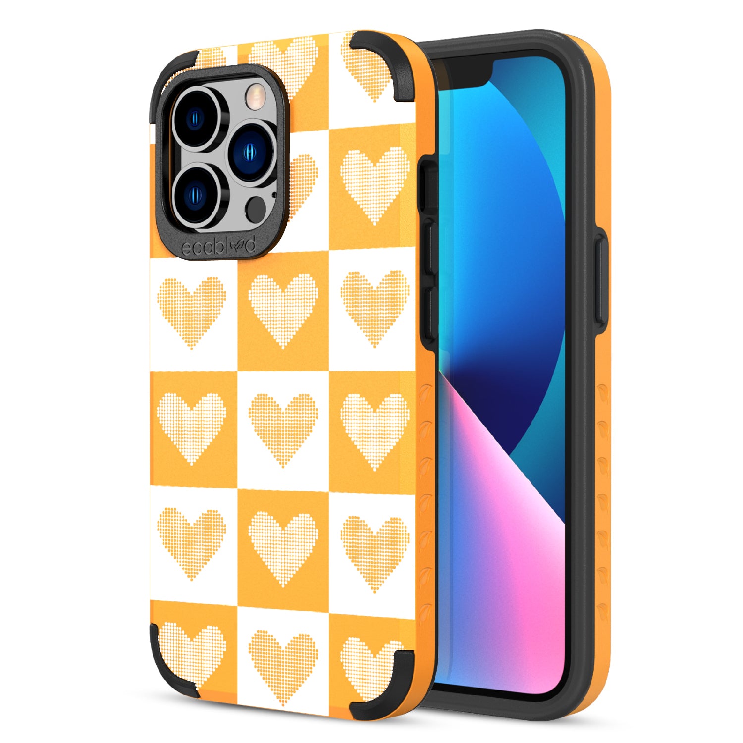 Soften up with the quilted hearts of Quilty Pleasures design on our Mojave rugged and compostable iPhone 12 Pro Max case & iPhone 13 Pro Max case, lovingly stitched and crafted with a gingham plaid pattern and hearts sewn inside to give you a warm embrace every time you look at your phone. Choose from five lovely colorways: Midnight Black, Cascade Blue, Foliage Green, Illuminating Yellow, and Wildflower Pink.