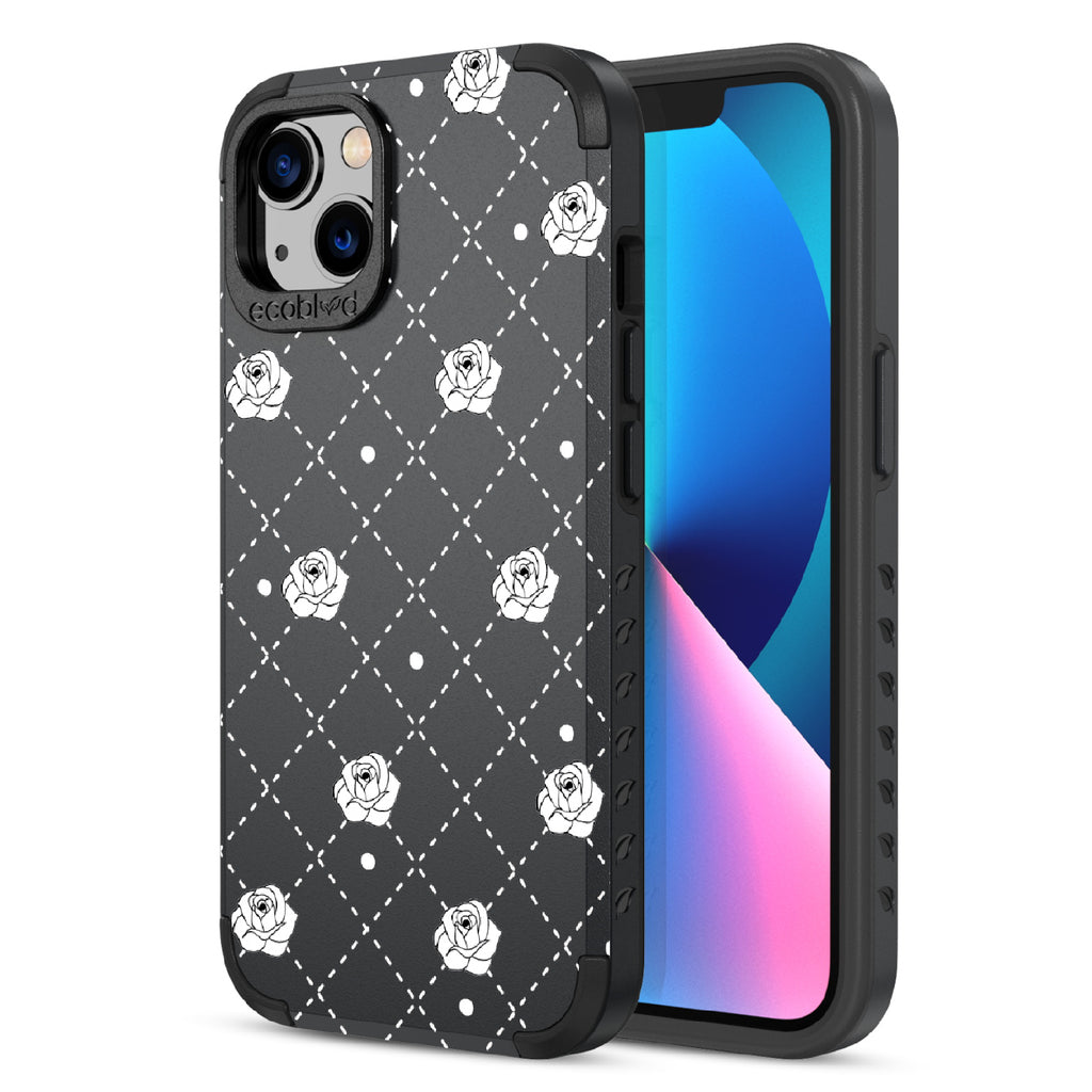 Roses are red, violets are blue, but with this Rose To The Occasion design on our Mojave rugged and compostable iPhone 13 case, your phone and style will be nothing but fresh and new with its white roses and polka dots on a stitched argyle background, adding that extra oomph to your style especially while on our Midnight Black colorway.
