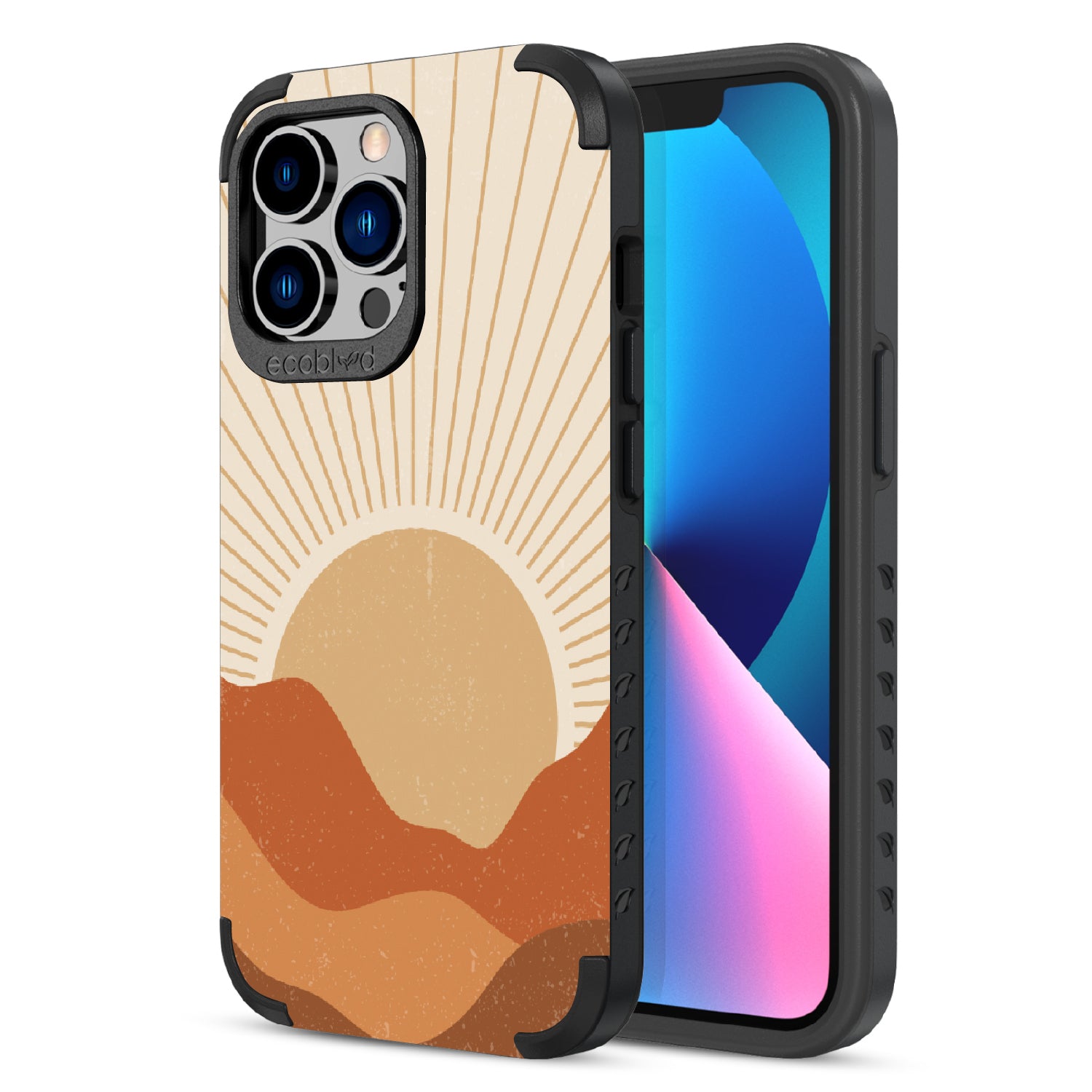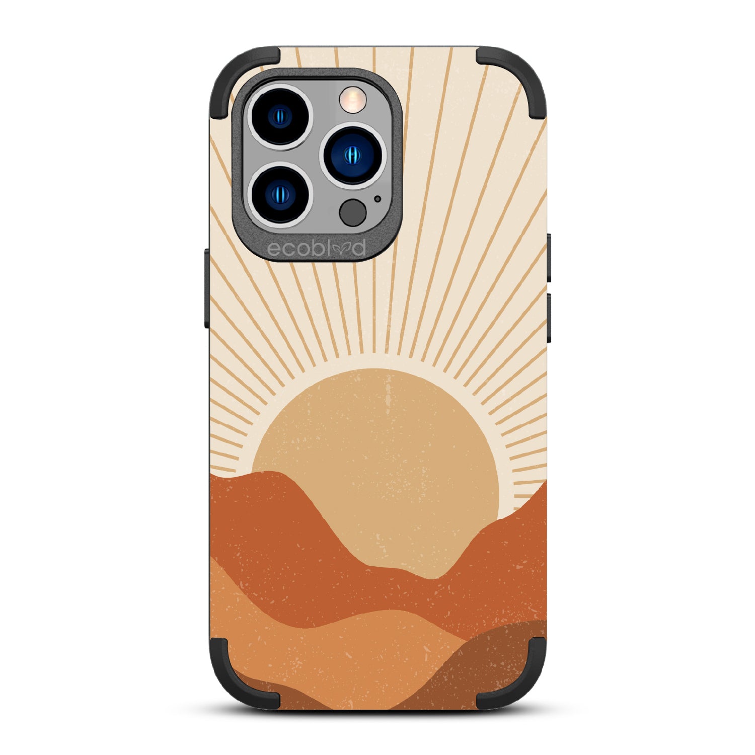 Take in the breathtaking beauty of the Rustic Sunrise design on our Mojave rugged and compostable iPhone 12 Pro Max case & iPhone 13 Pro Max case, as it mirrors the magnificent fall sunrise with rich tones of gold, orange, tan, and brown. The warm hues come to life, radiating over rolling hills and capturing the essence of an autumn morning. Add a touch of rustic charm to your day.