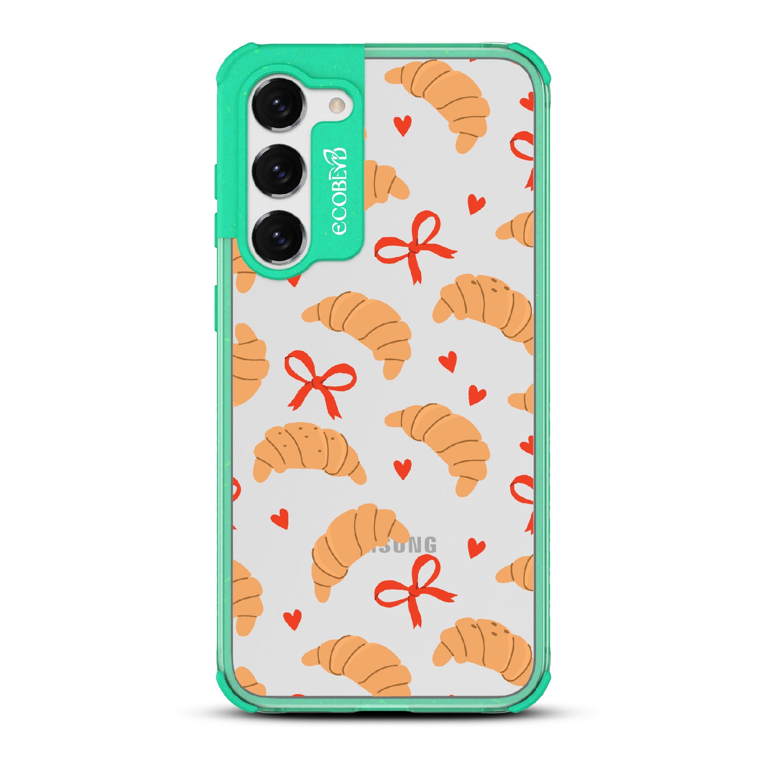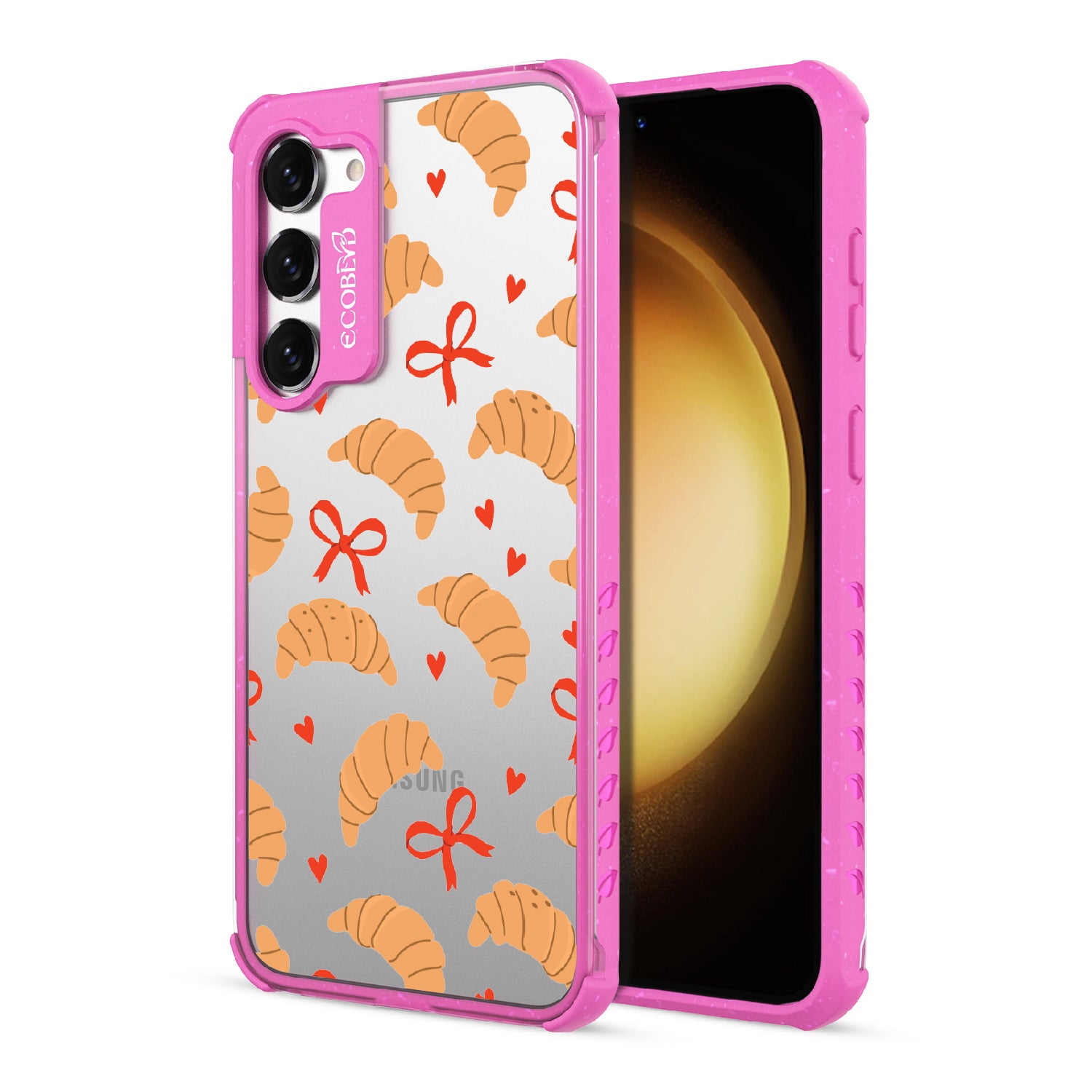 Good taste deserves the perfect recipe like the Croissant Couture design on our Laguna clear Galaxy S23 case! Softly folded croissants, tied with dainty red bows and sprinkled with sweet hearts, evoke the lightness and care of a true delicacy.