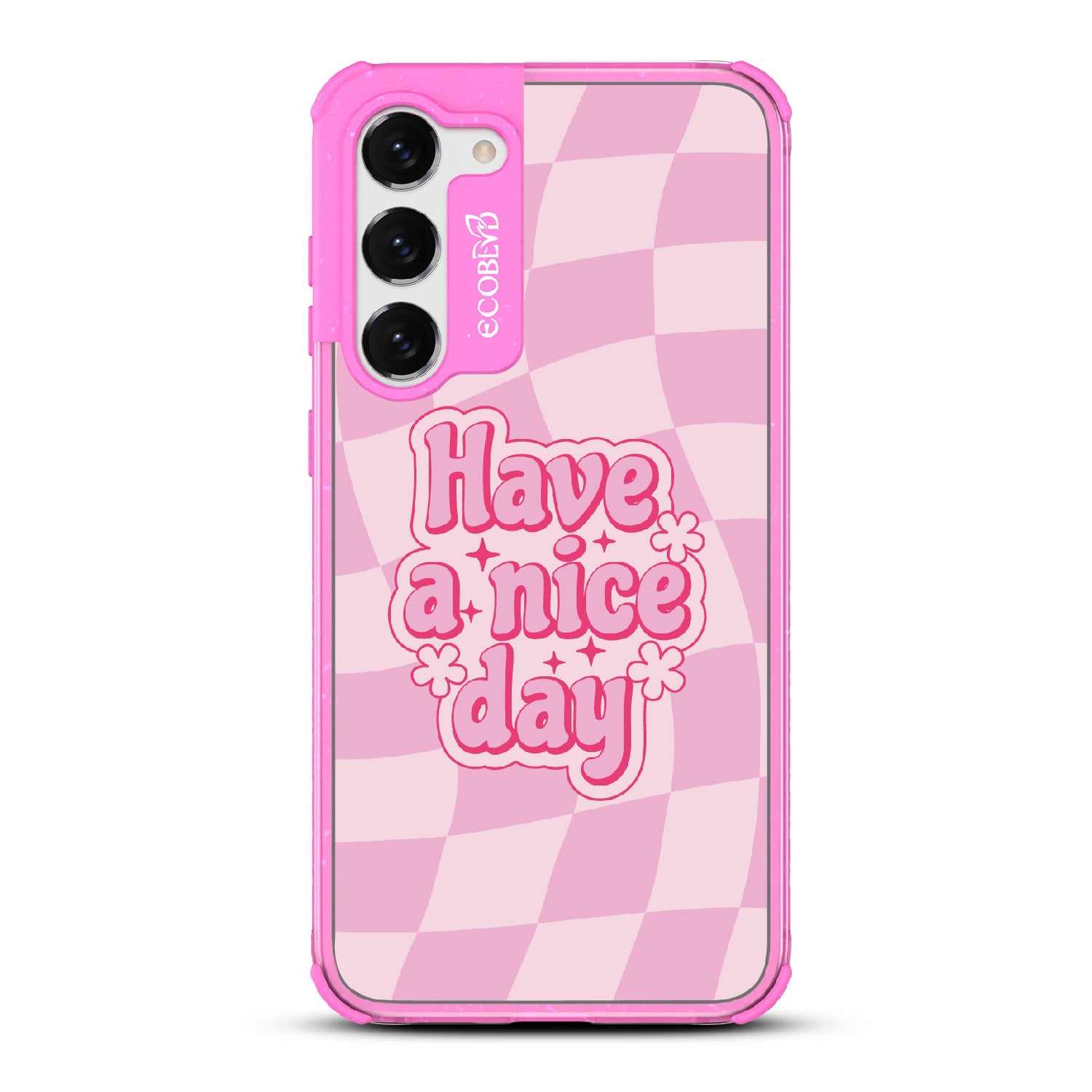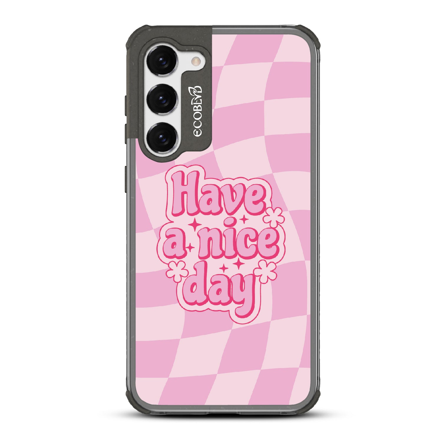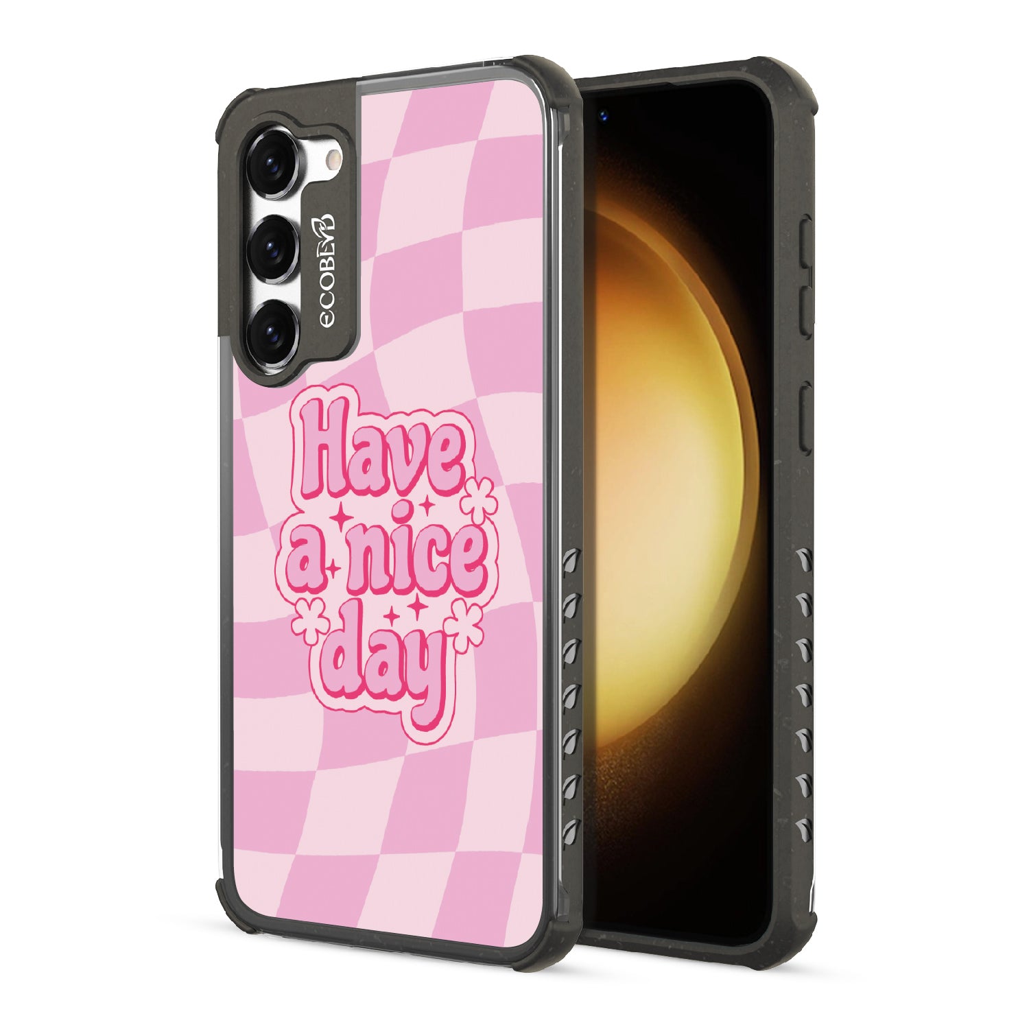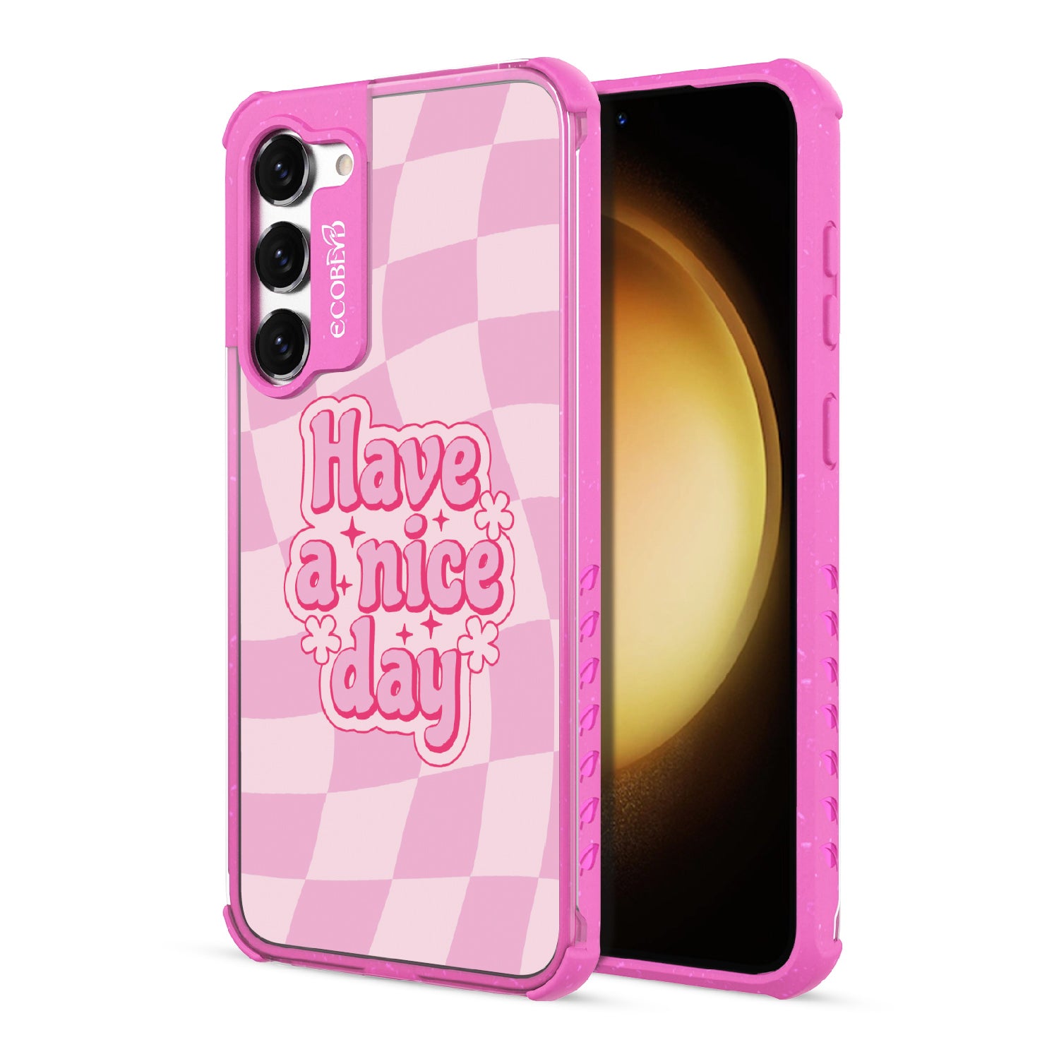Set the stage for a brighter day with the Have A Nice Day design on our Laguna clear Galaxy S23 phone case, featuring an eye-catching wavy checker print pattern. This daily reminder gives an uplifting atmosphere your phone needs, making every day a nice day filled with positivity.
