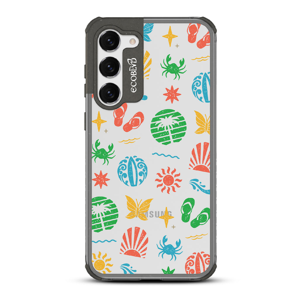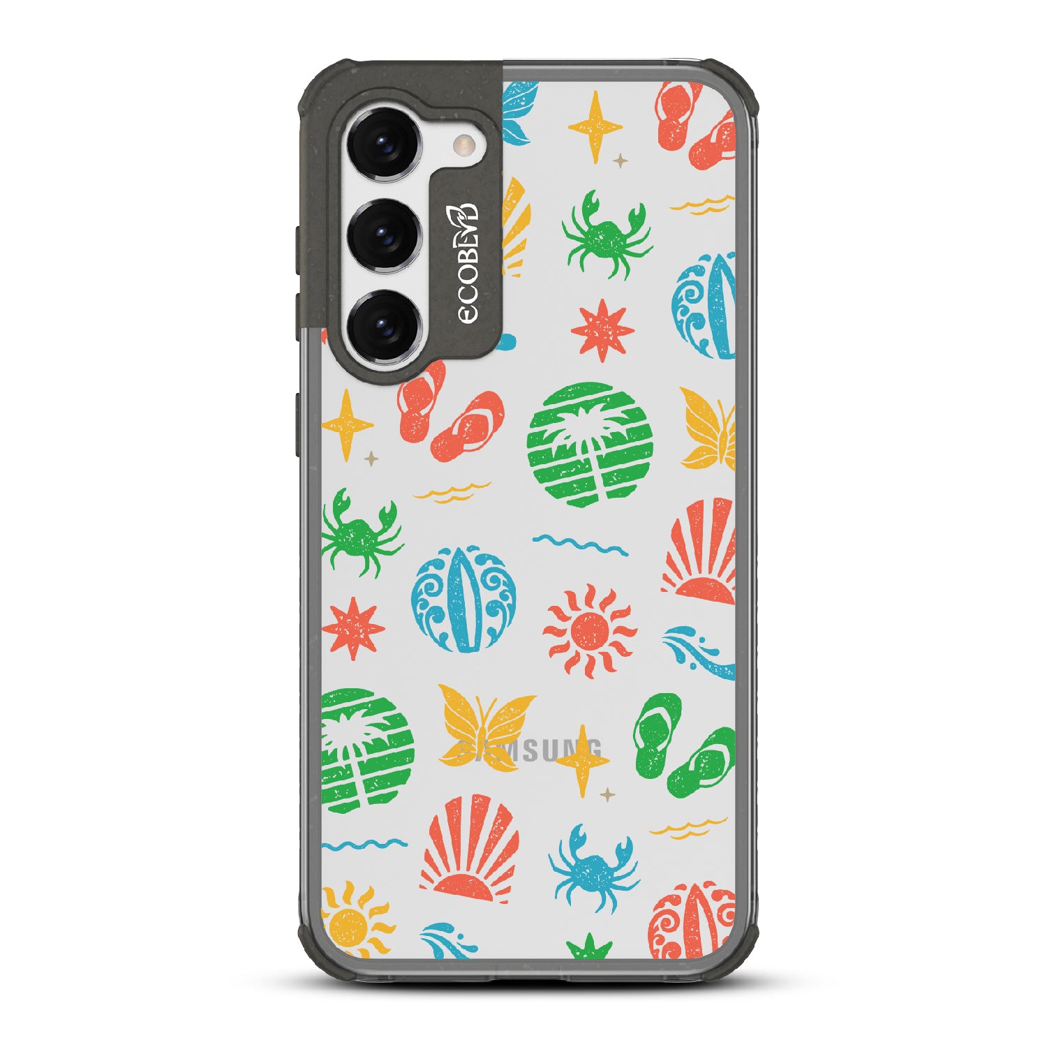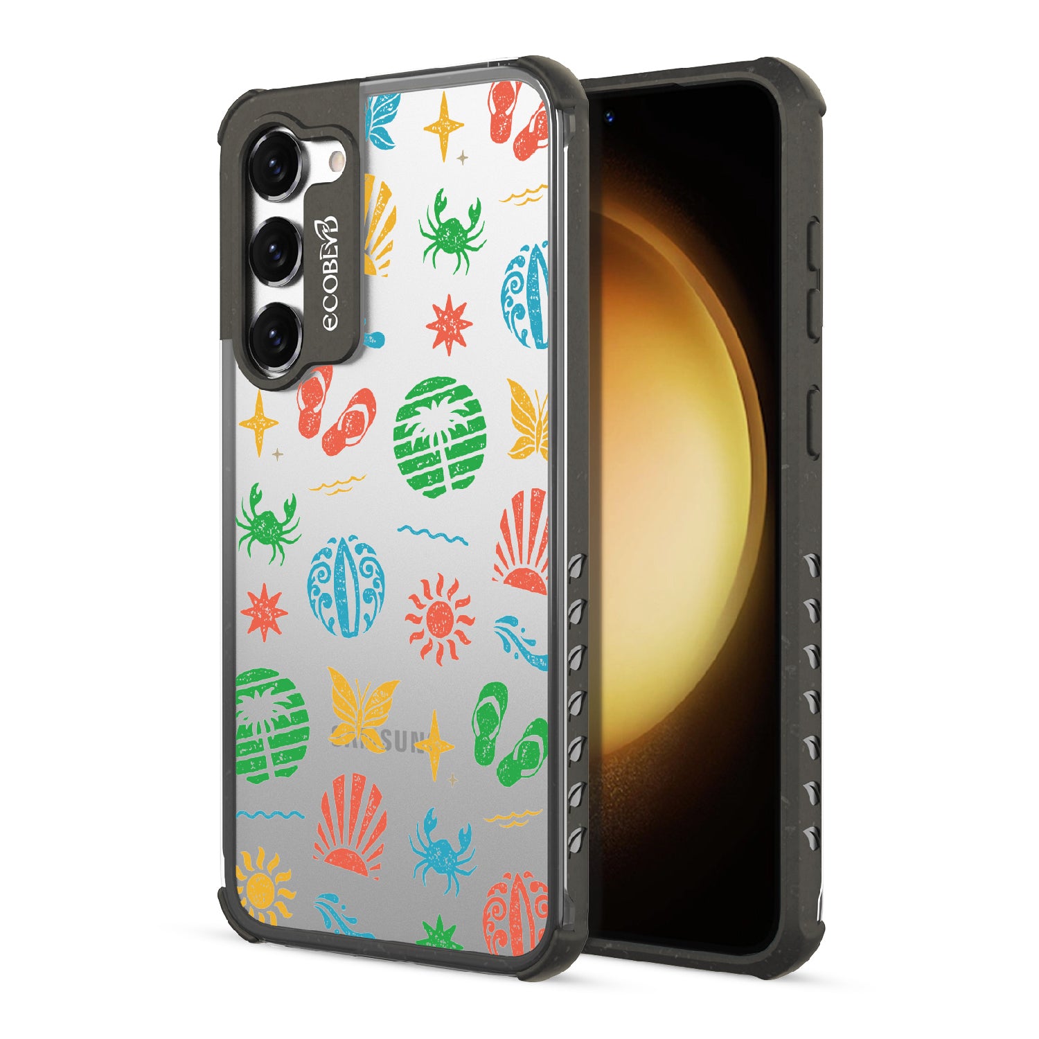 Get lost in a moment of escape with the Island Time design on our Laguna clear Galaxy S23 phone case. Its surfboard stencil art featuring flip-flops, crabs, palm trees, the sun, stars, and waves invites you to slip into a laid-back state of mind. You'll be transported to a place where worries fade away and enjoying the present moment is all that matters. Let your phone be your passport to the carefree vibes.