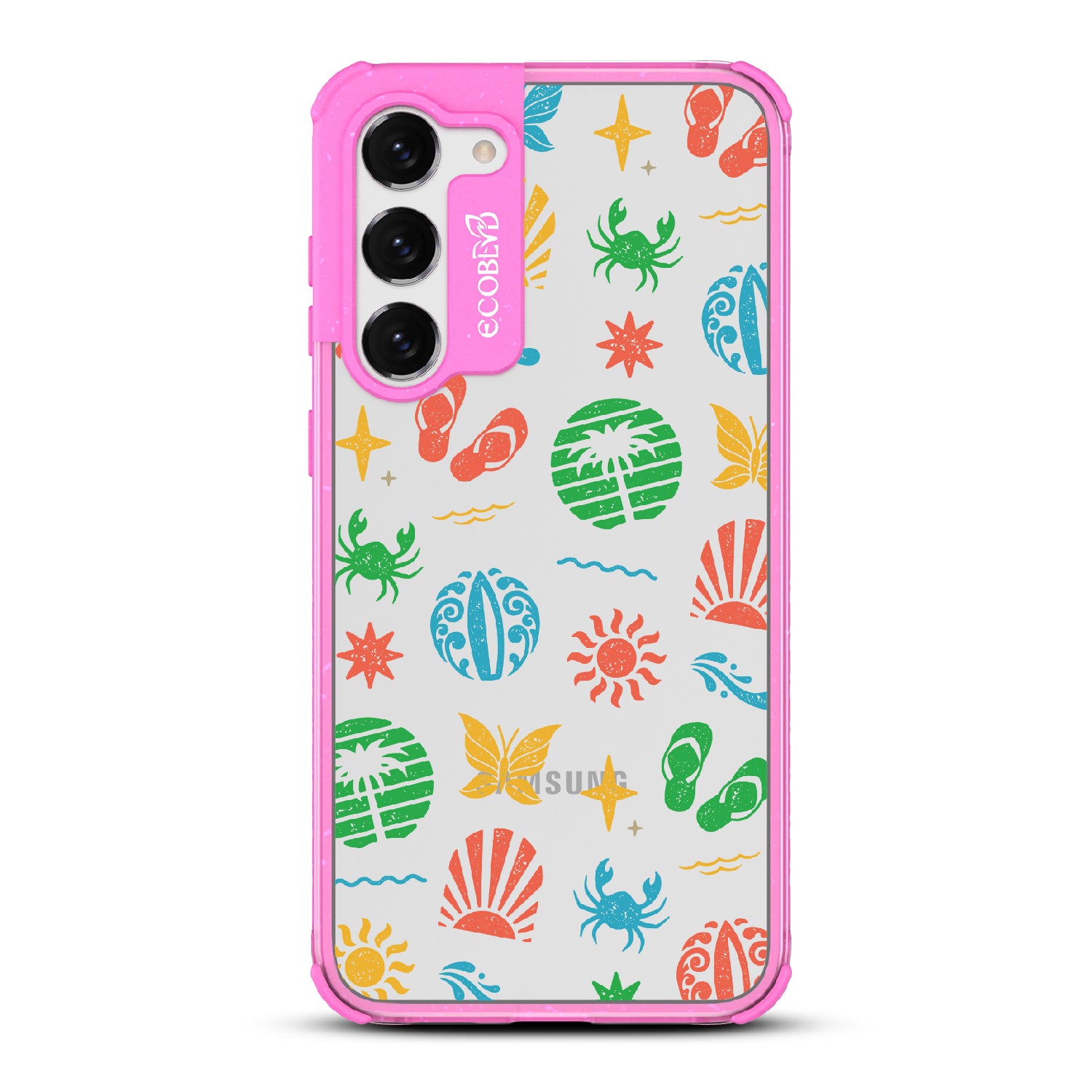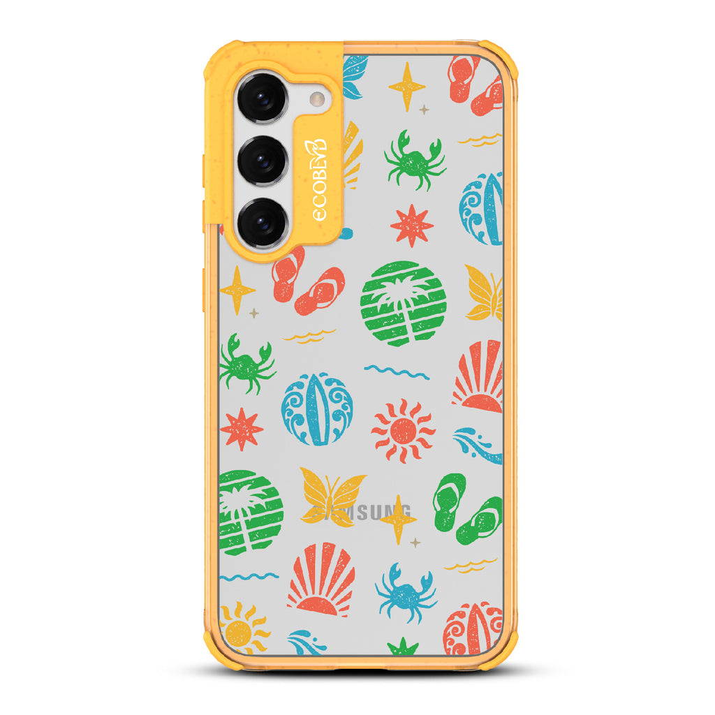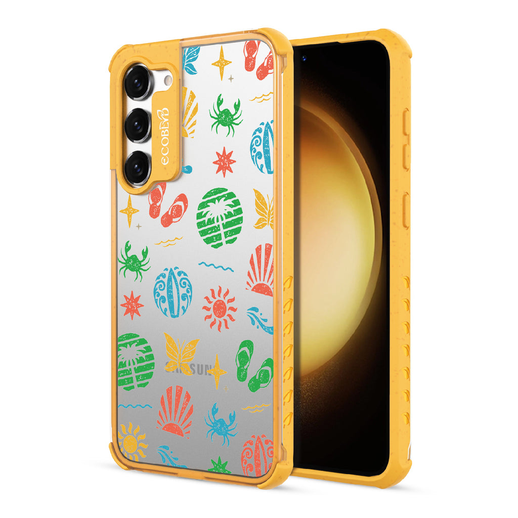 Get lost in a moment of escape with the Island Time design on our Laguna clear Galaxy S23 phone case. Its surfboard stencil art featuring flip-flops, crabs, palm trees, the sun, stars, and waves invites you to slip into a laid-back state of mind. You'll be transported to a place where worries fade away and enjoying the present moment is all that matters. Let your phone be your passport to the carefree vibes.