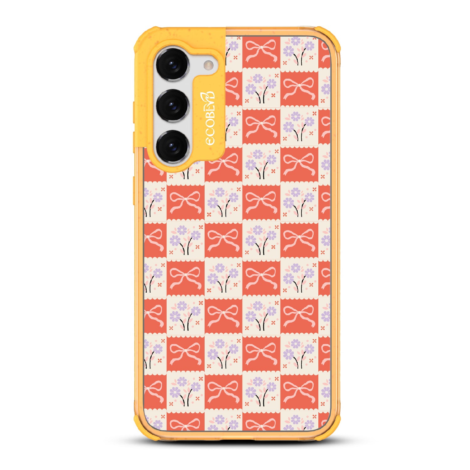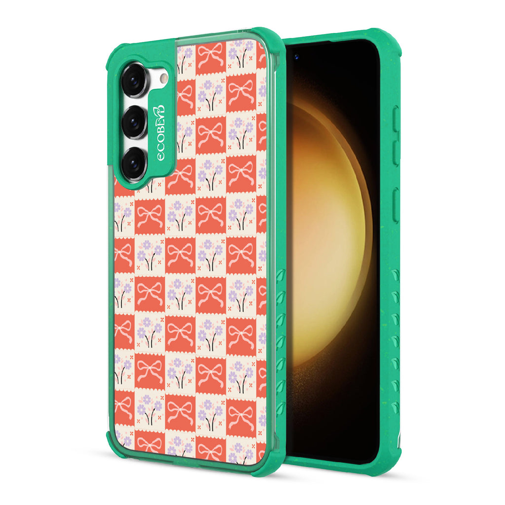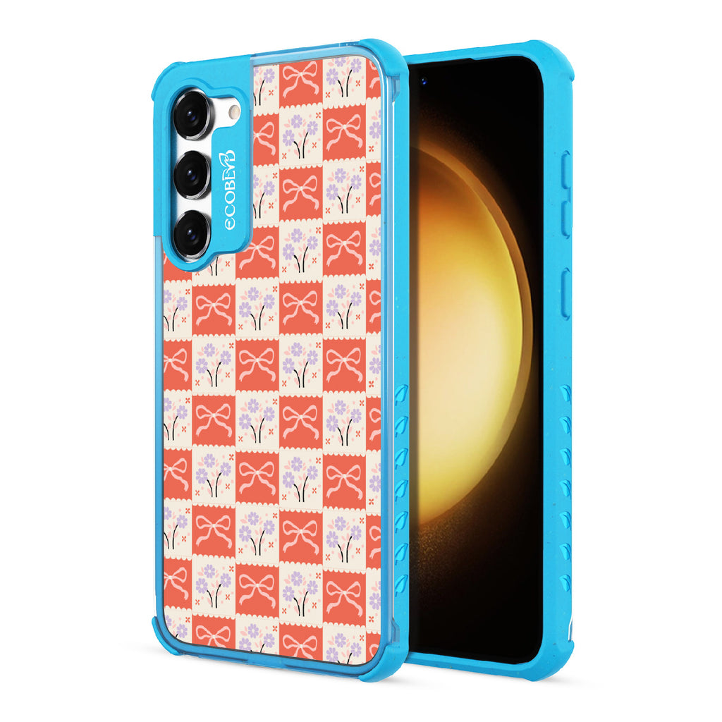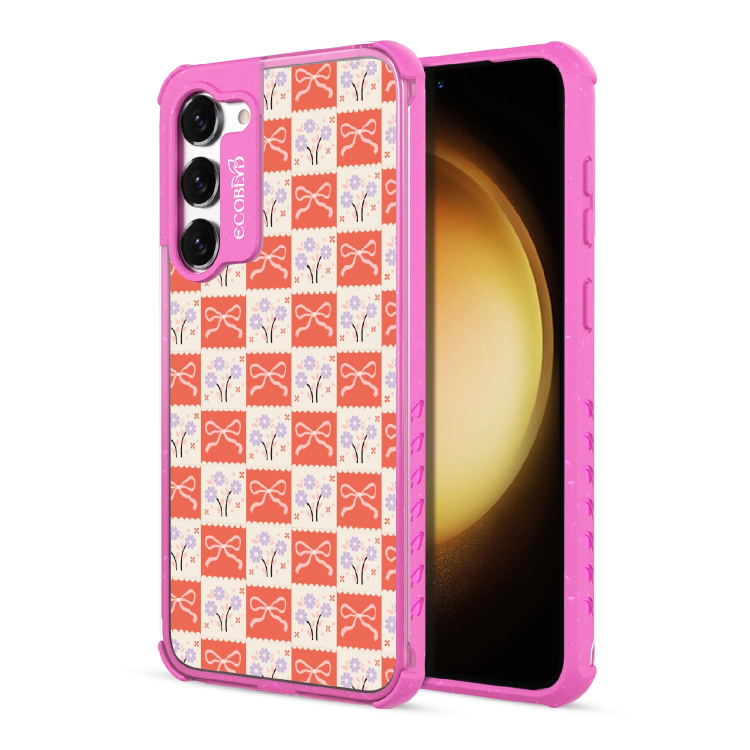 Galaxy S23 phone case, featuring a playful mix of stamps with pink bows and purple flowers, evoking the sweet anticipation of receiving a letter. Each stamp-like detail adds a touch of feminine flair, turning your phone into a delightful coquette parcel. Let your phone be the prettiest package in the room.