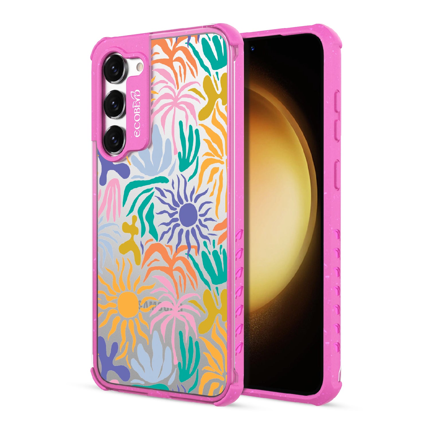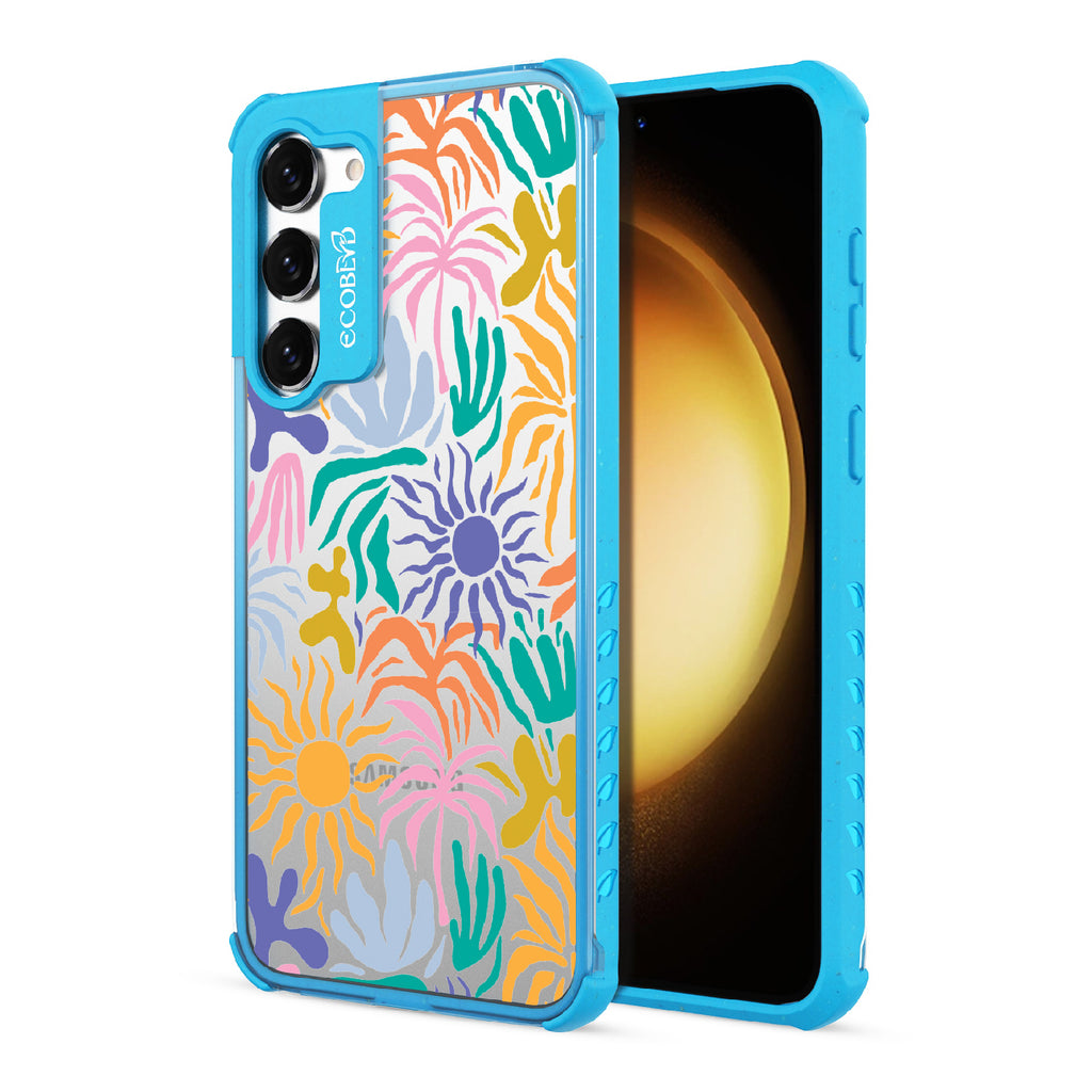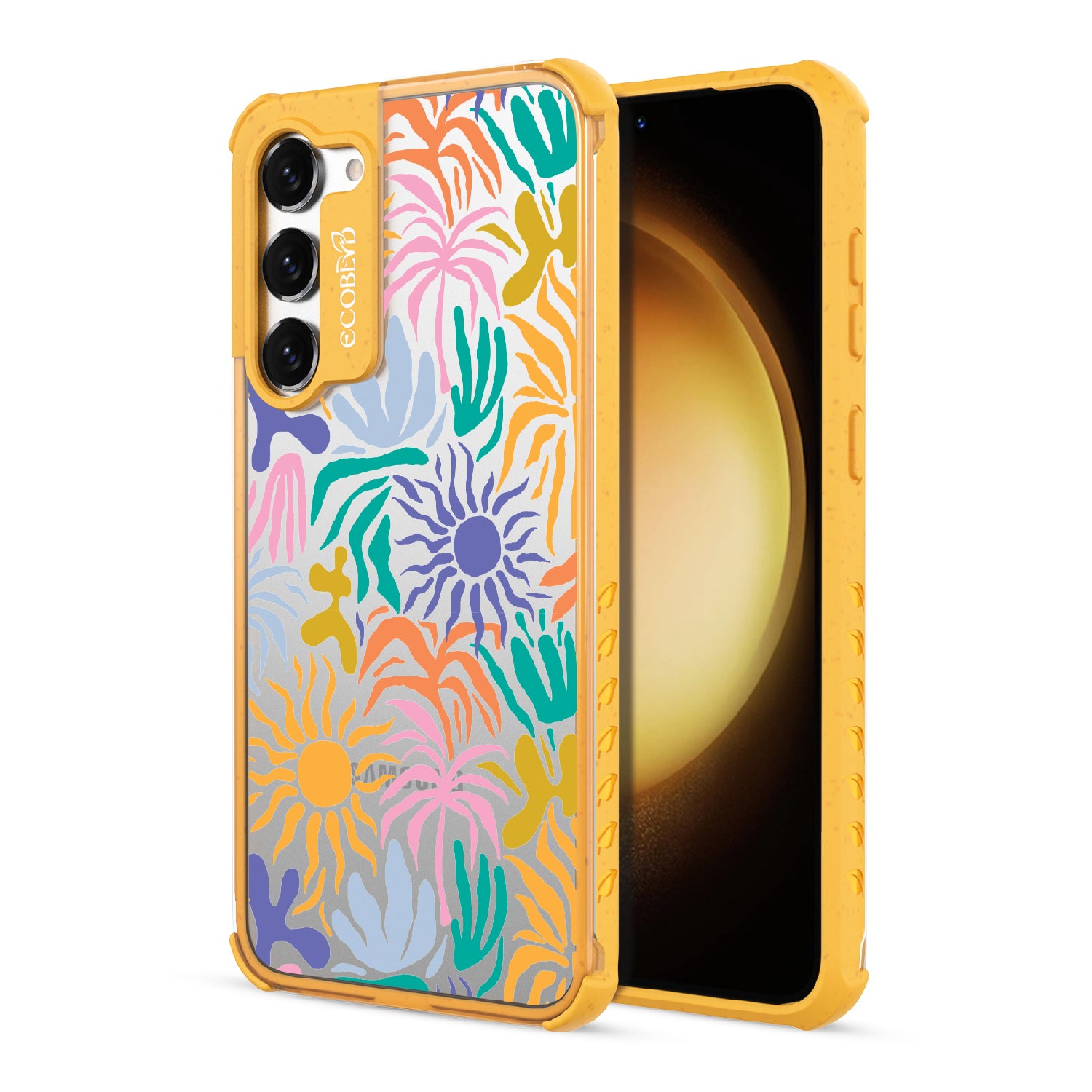 Set your phone aglow with our bright Sun-Kissed design on our Laguna clear Galaxy S23 case. With its sun-shaped bud and colorful petals, this device becomes a moving canvas, radiating joy and positivity. This design embodies the warmth and vibrancy of sunflowers, capturing the essence of sun-kissed days and infusing every moment with a cheerful and uplifting energy.