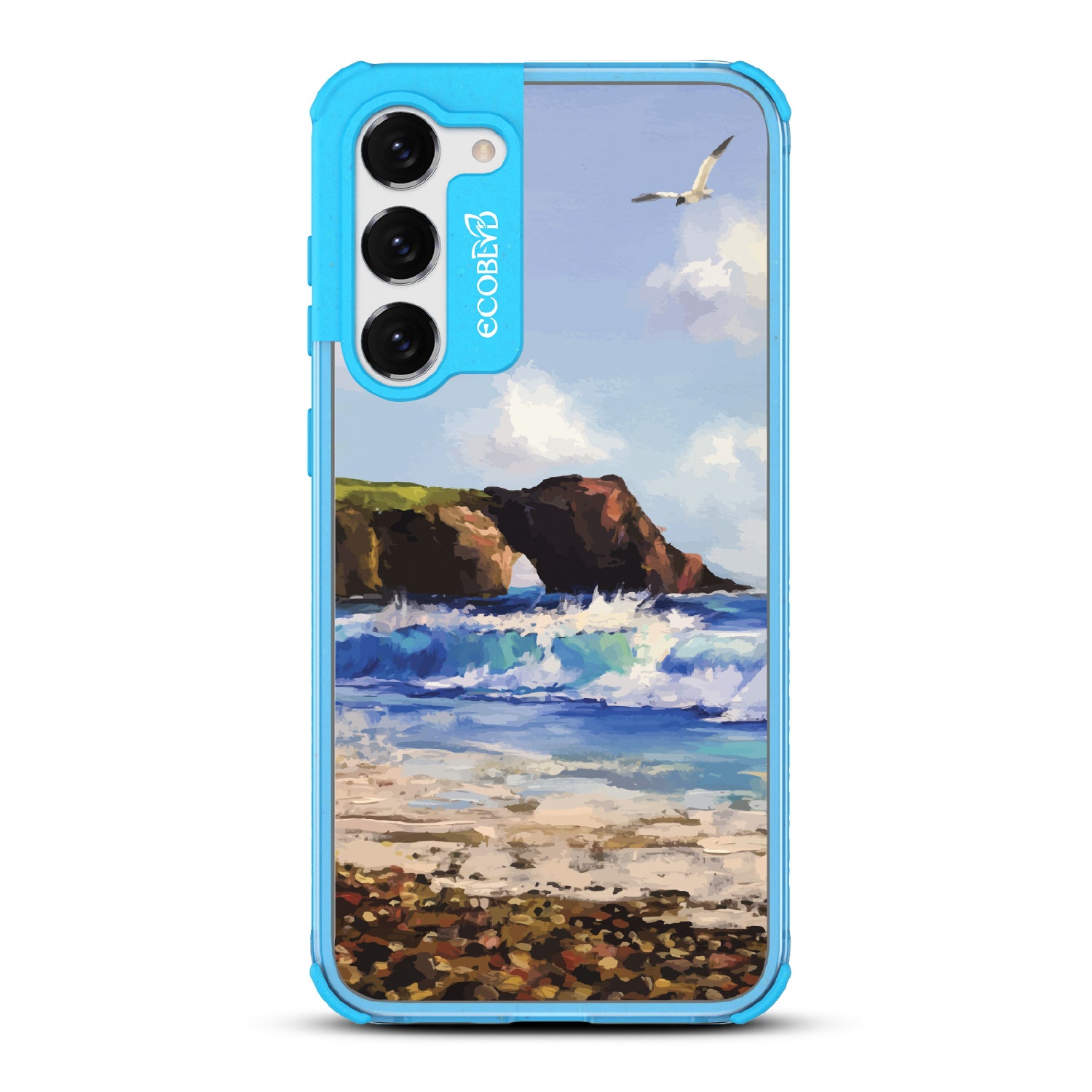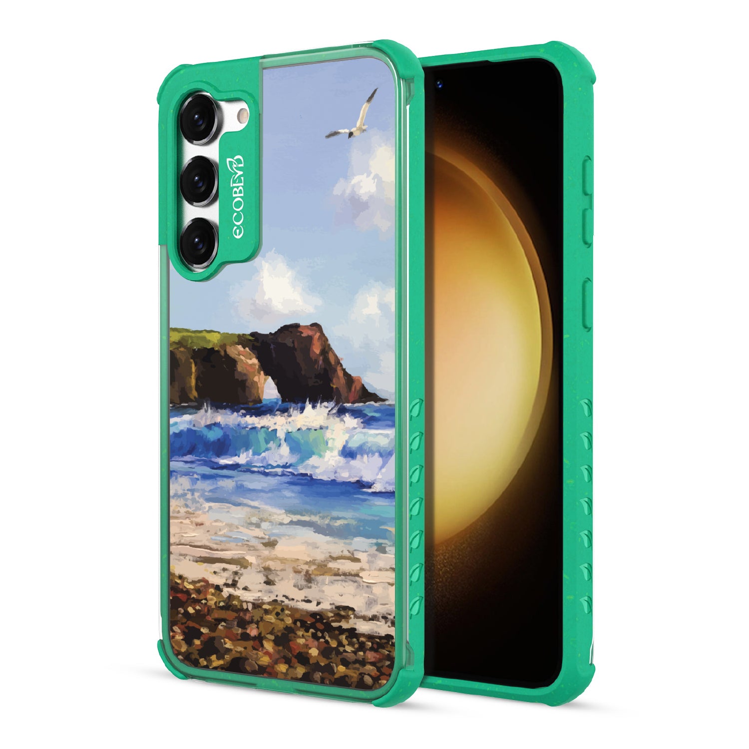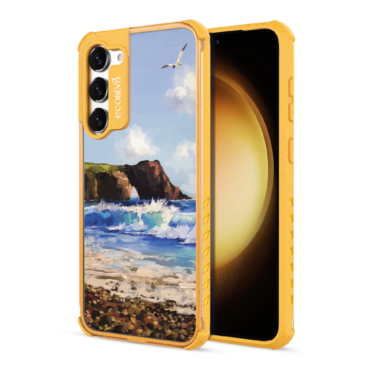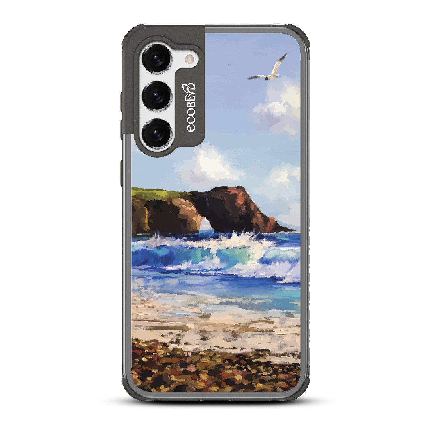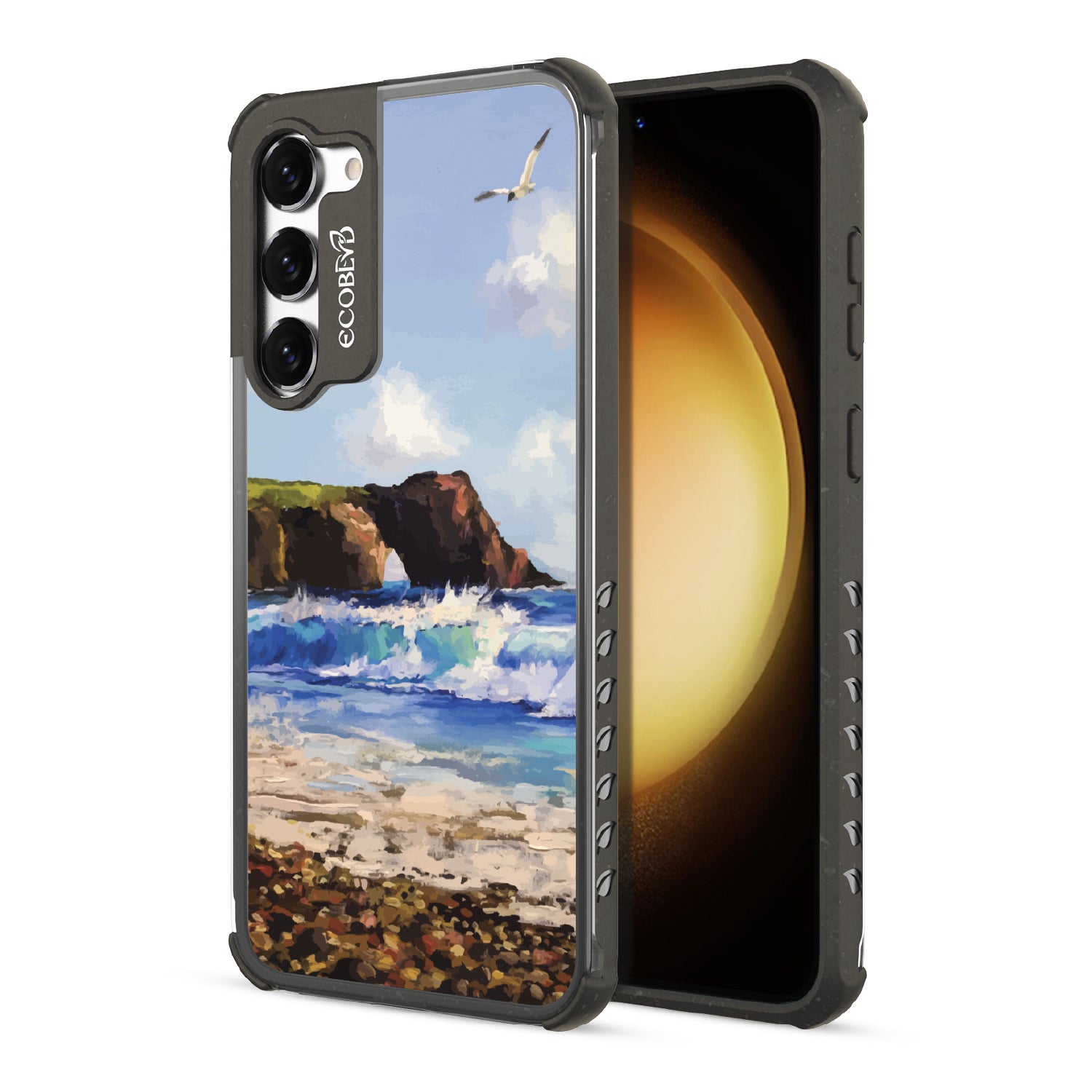 The calm before…. The Cliffhanger design on our Laguna clear Galaxy S23 case holds a moment of painted suspense—brushed cliffs, churning tides, and a palette that builds to the brink. A story captured at its turning point.