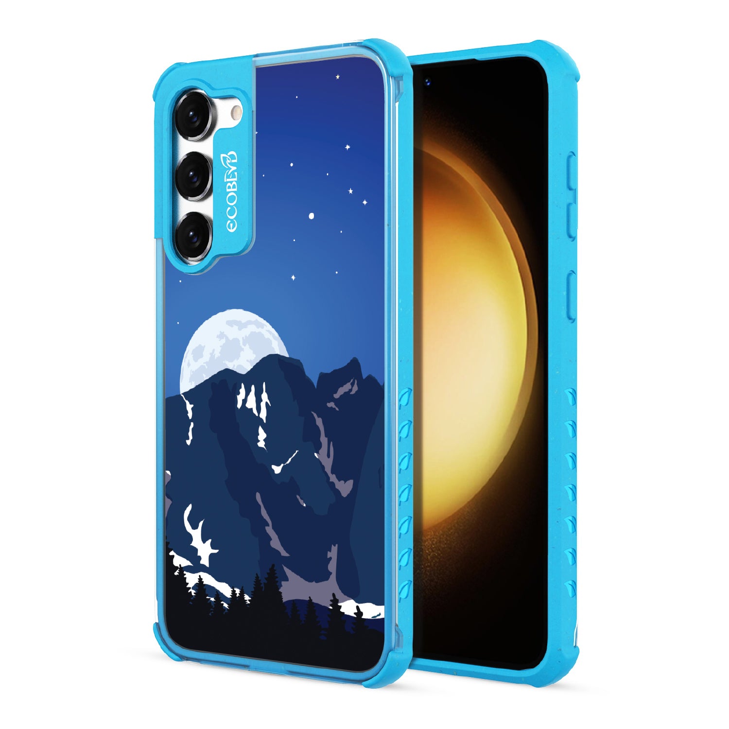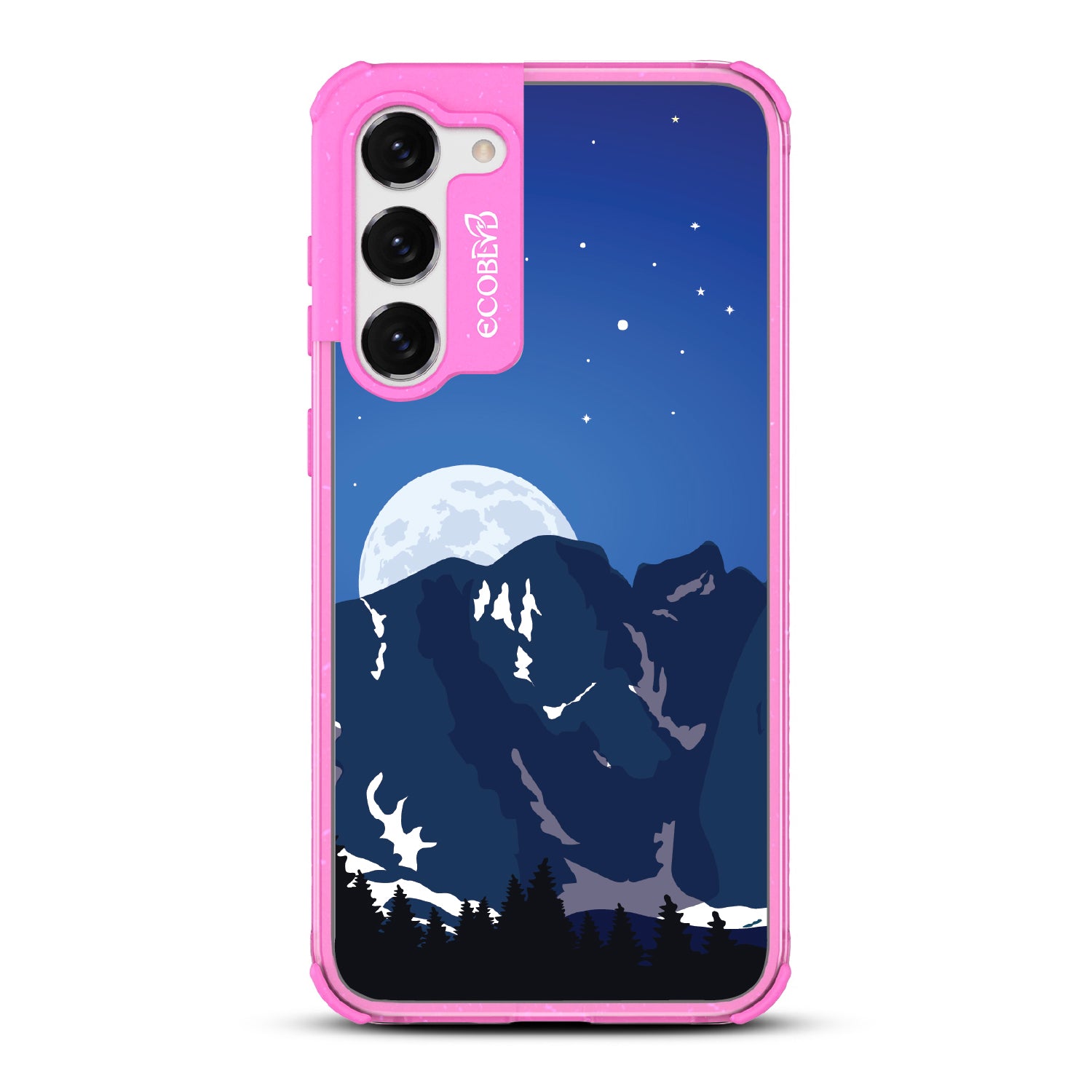 Bask in the ethereal glow of our Alpine Moon design on our Laguna clear Galaxy S23 Plus case, where the moon hangs like a luminous pearl against the velvet canvas of the night sky, casting its soft radiance upon the rugged terrain below.