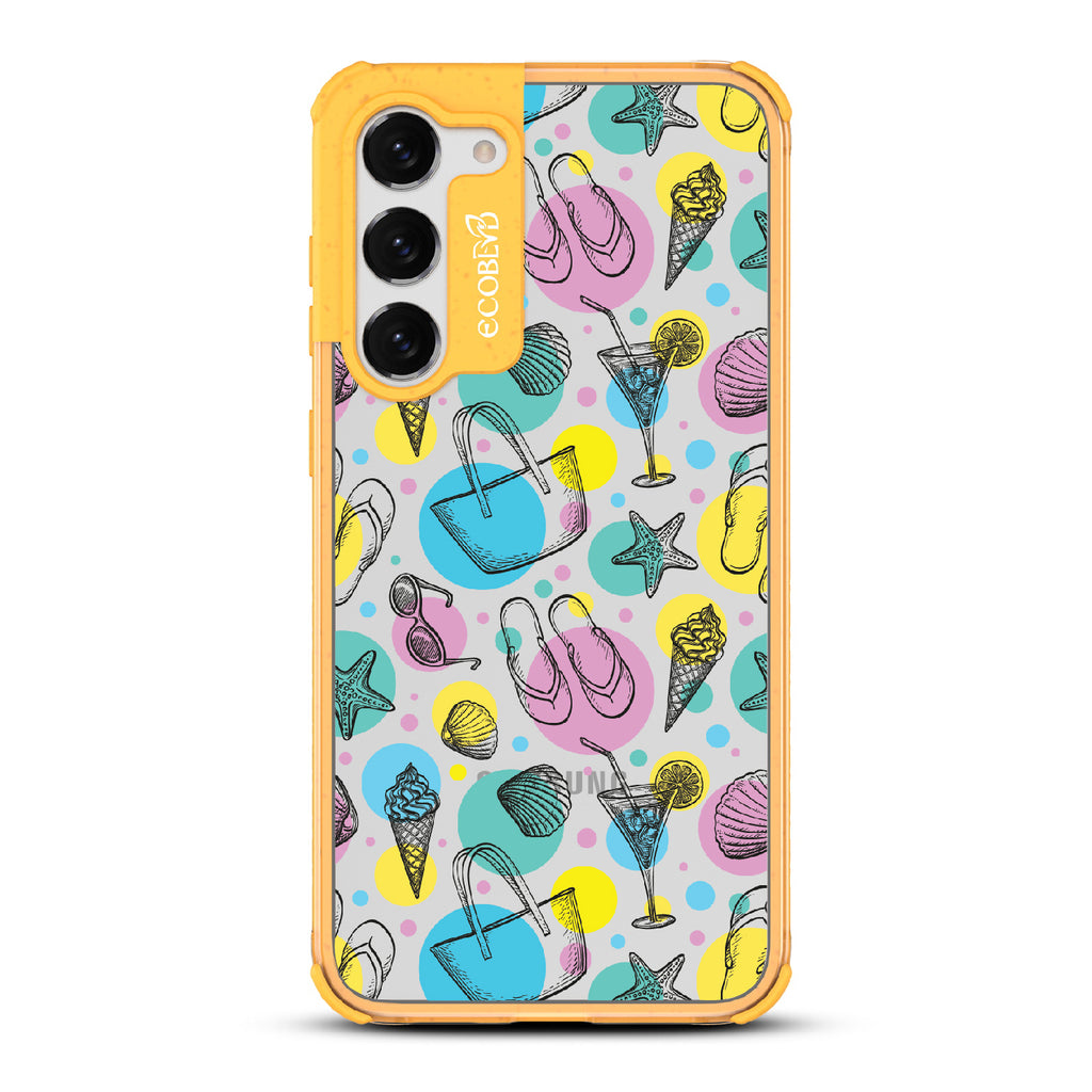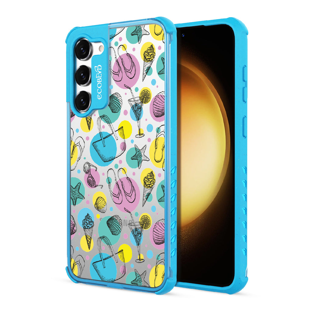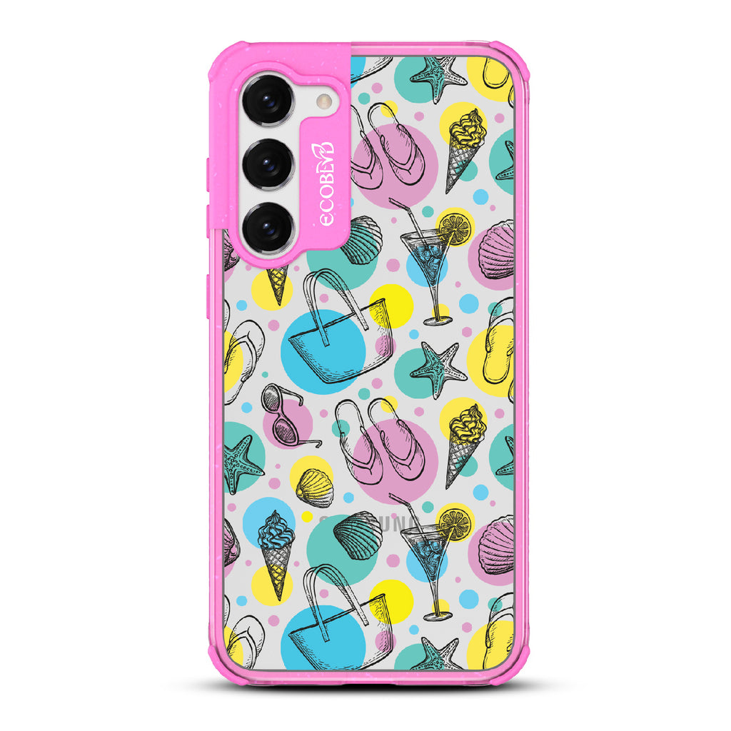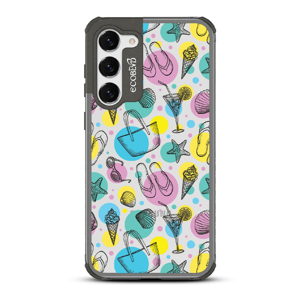 Beach Please, it's time to turn up the heat and bring your summer swagger to the forefront with this beach-ready design on our Laguna clear Galaxy S23 Plus case. This phone case design is a bold fusion of beach essentials, featuring a trendy beach tote that holds your Beach Please-ure, a cocktail glass brimming with tropical vibes and a hint of cheekiness, seashells that carry the whispers of unforgettable beach moments, sunglasses that say "I'm too fabulous for the shade," mouthwatering ice cream that satisfies your sweet and sassy cravings, starfish ready to be your beachside companions, and flip flops that strut with an attitude that demands attention.