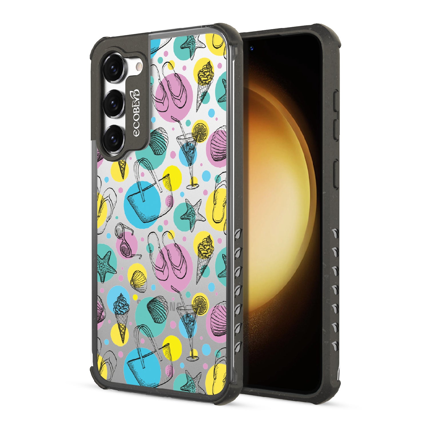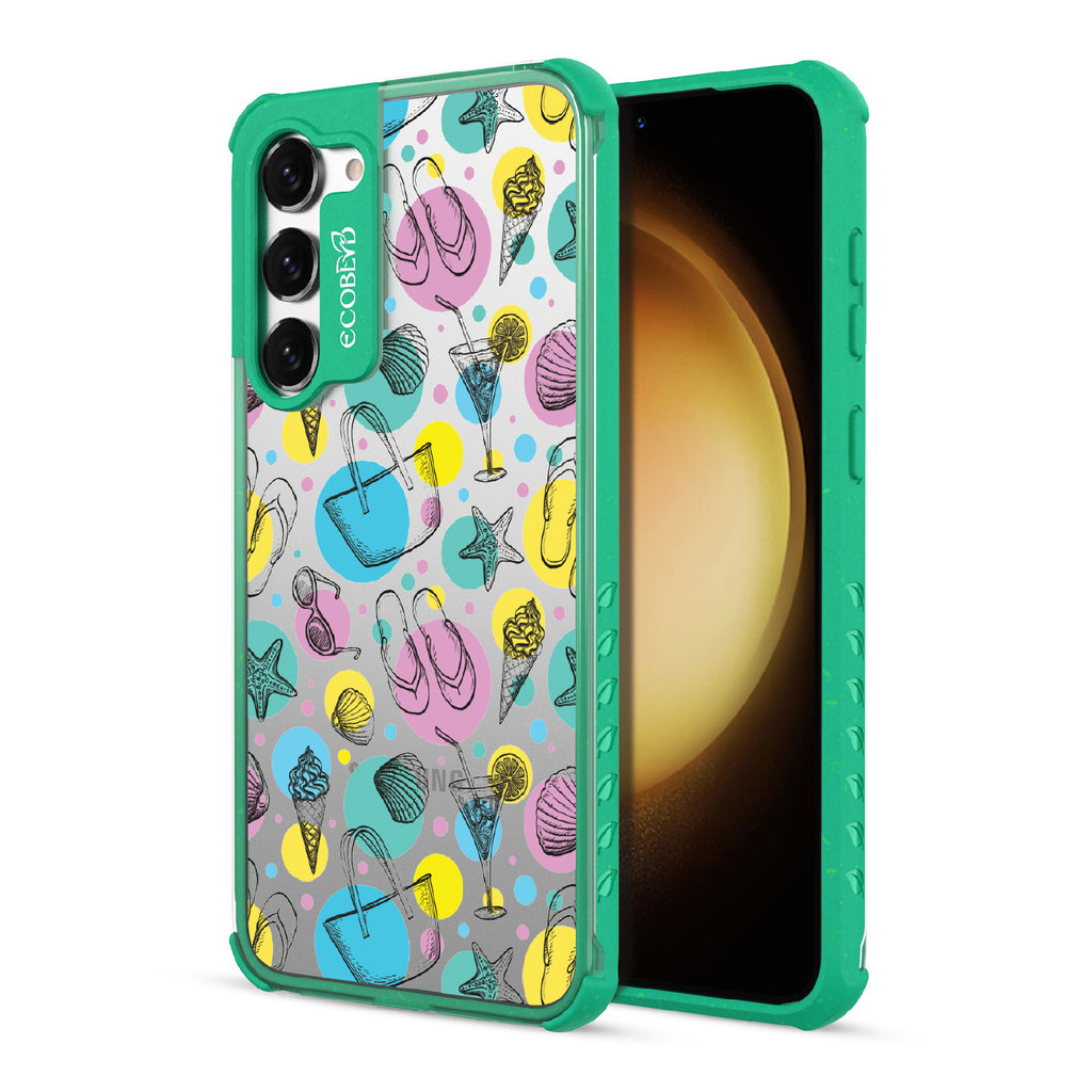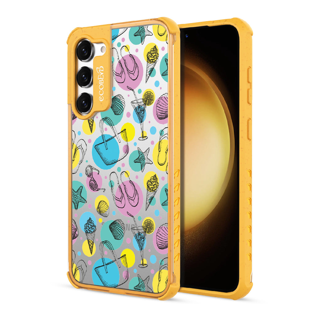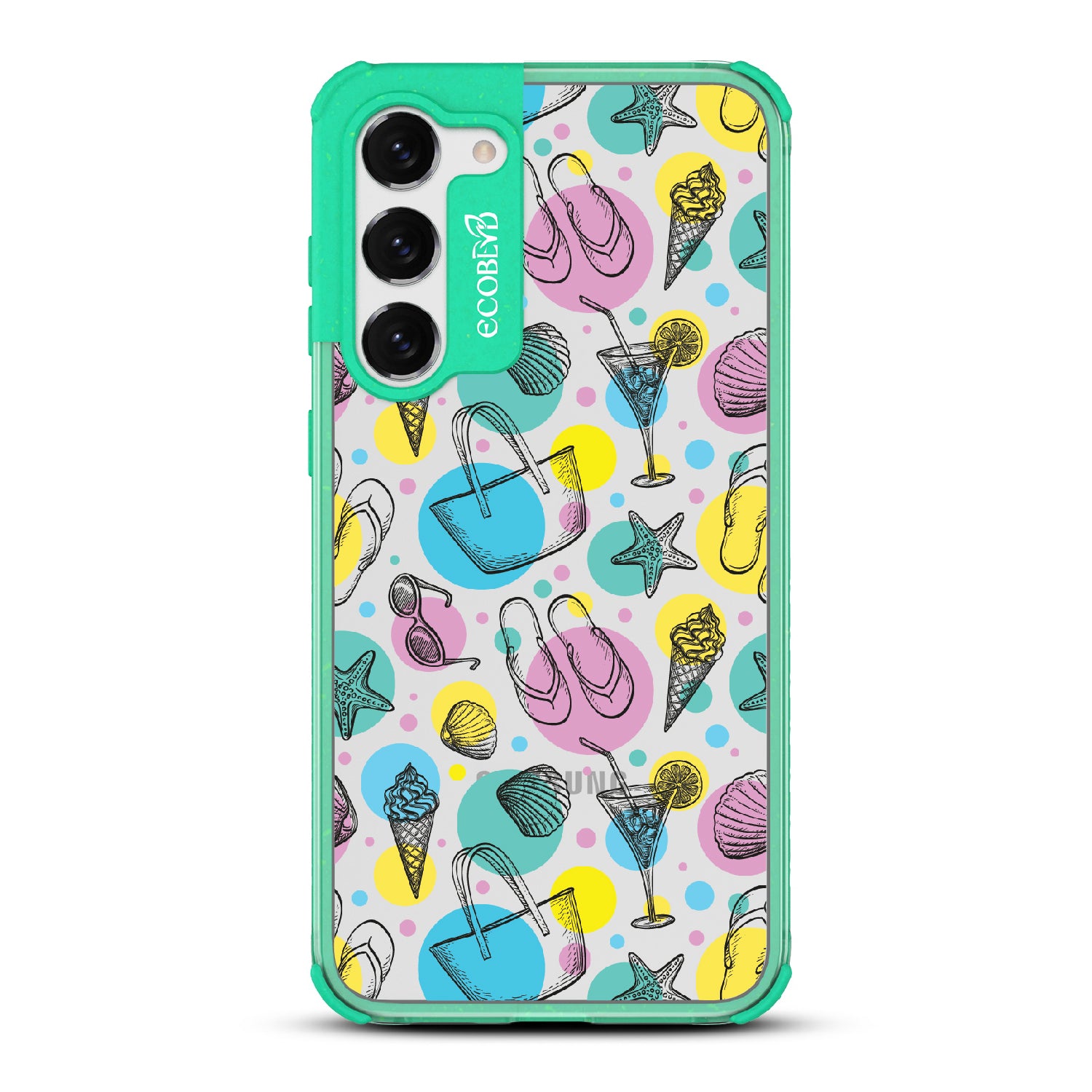 Beach Please, it's time to turn up the heat and bring your summer swagger to the forefront with this beach-ready design on our Laguna clear Galaxy S23 Plus case. This phone case design is a bold fusion of beach essentials, featuring a trendy beach tote that holds your Beach Please-ure, a cocktail glass brimming with tropical vibes and a hint of cheekiness, seashells that carry the whispers of unforgettable beach moments, sunglasses that say "I'm too fabulous for the shade," mouthwatering ice cream that satisfies your sweet and sassy cravings, starfish ready to be your beachside companions, and flip flops that strut with an attitude that demands attention.