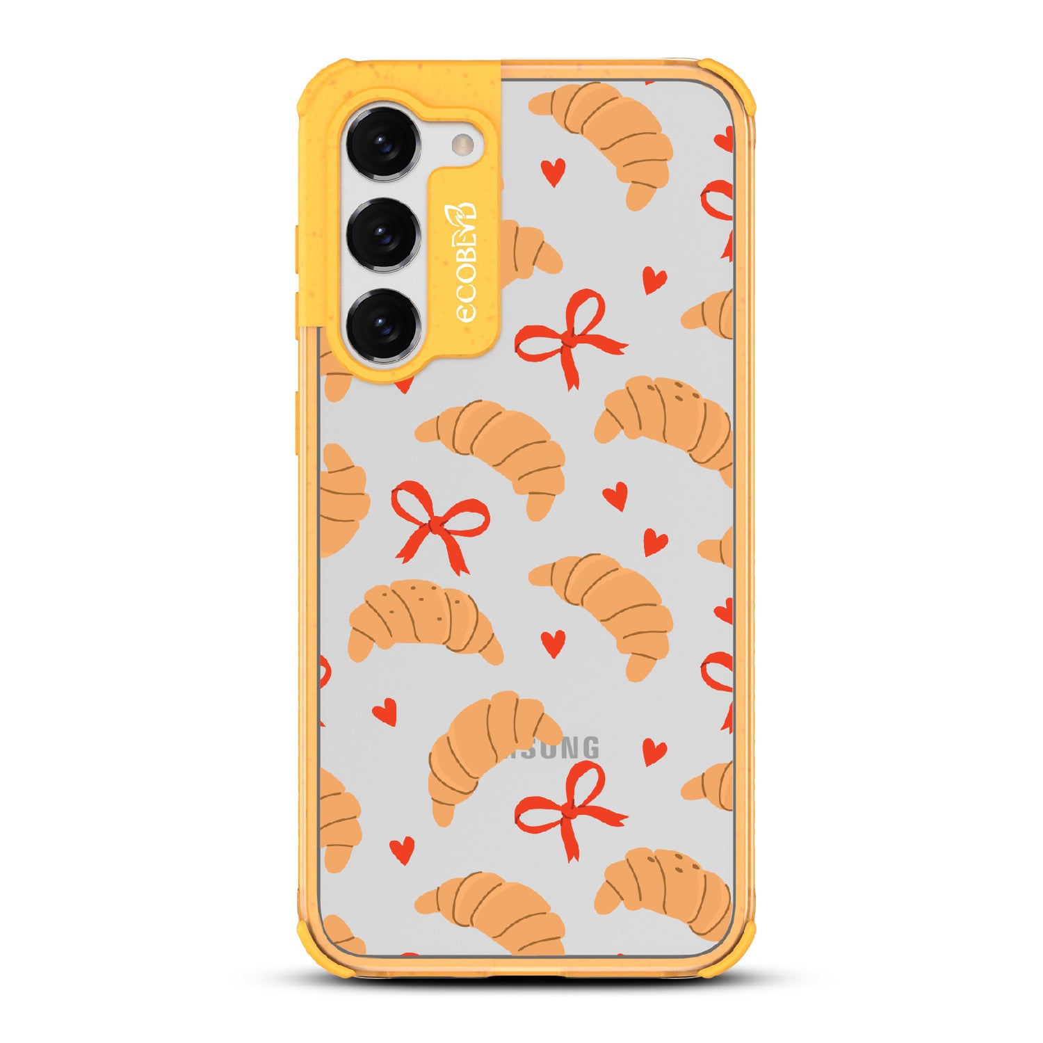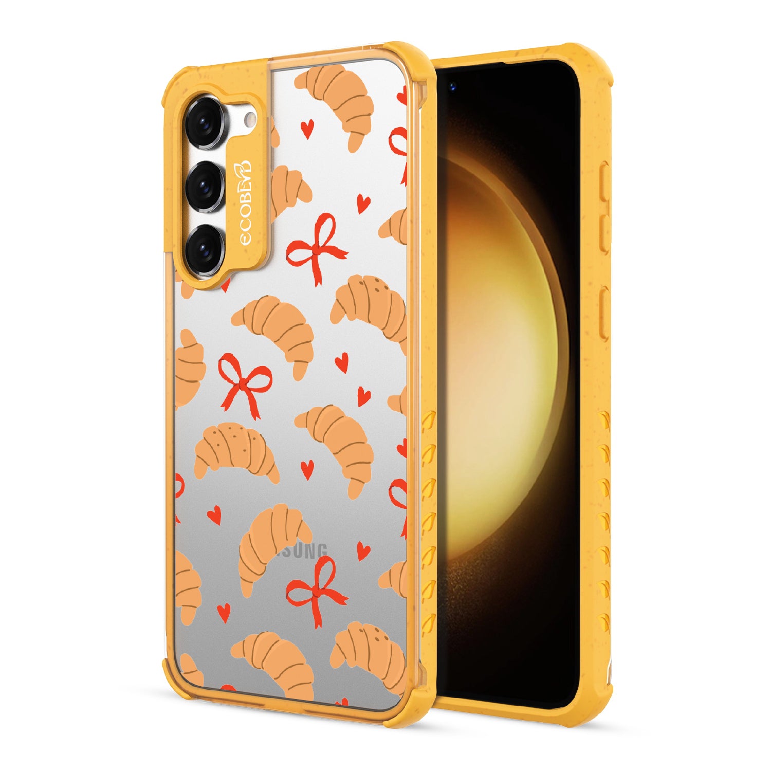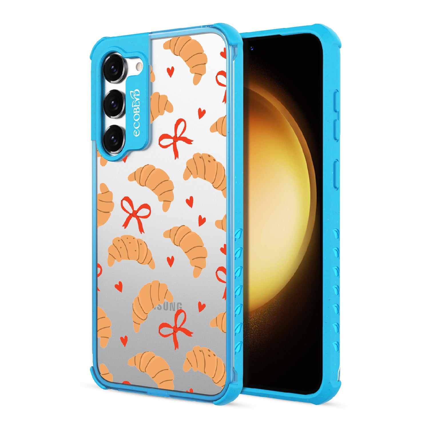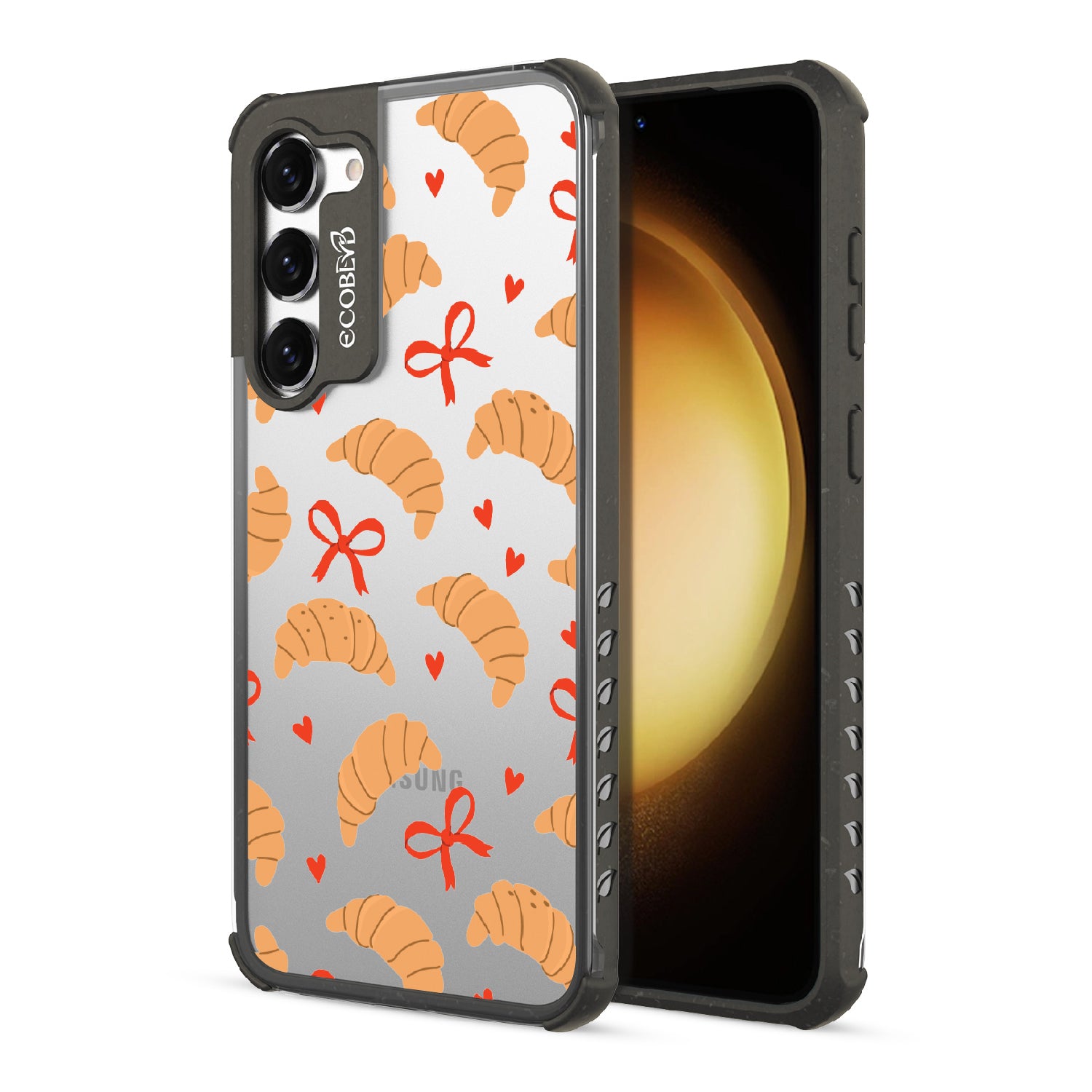 Good taste deserves the perfect recipe like the Croissant Couture design on our Laguna clear Galaxy S23 Plus case! Softly folded croissants, tied with dainty red bows and sprinkled with sweet hearts, evoke the lightness and care of a true delicacy.