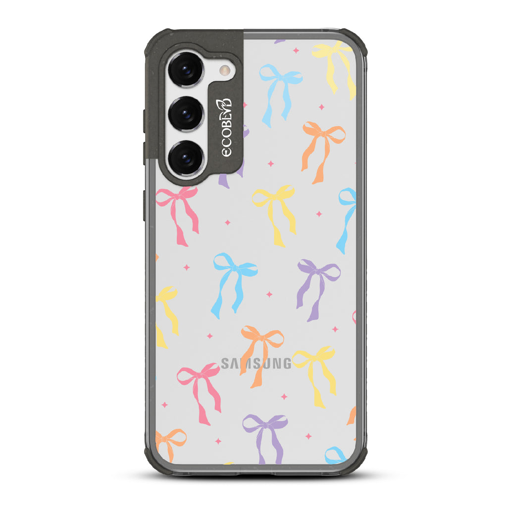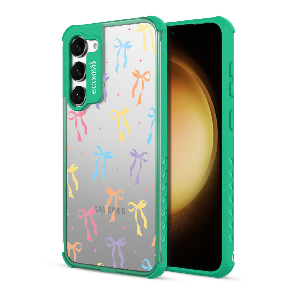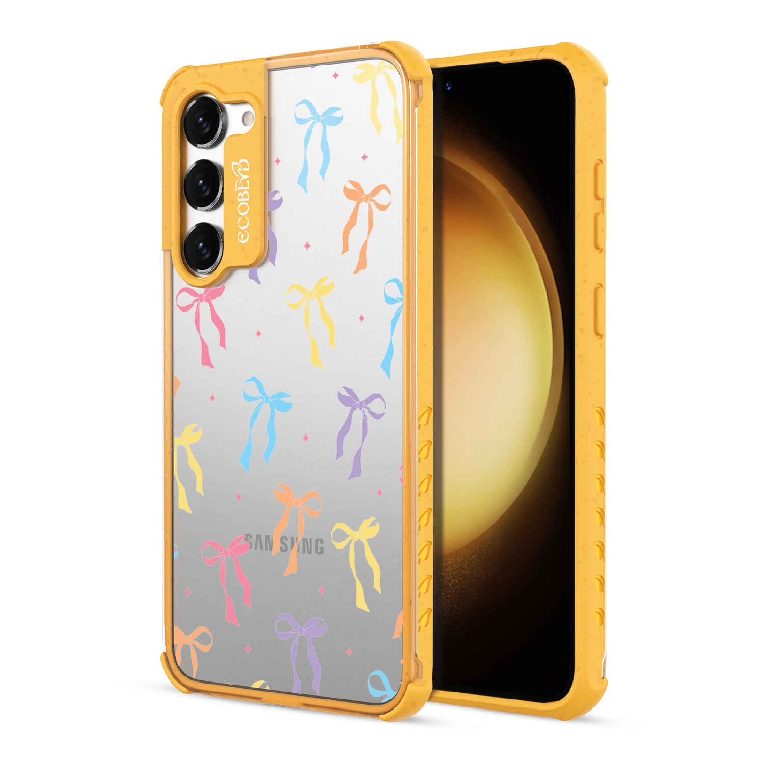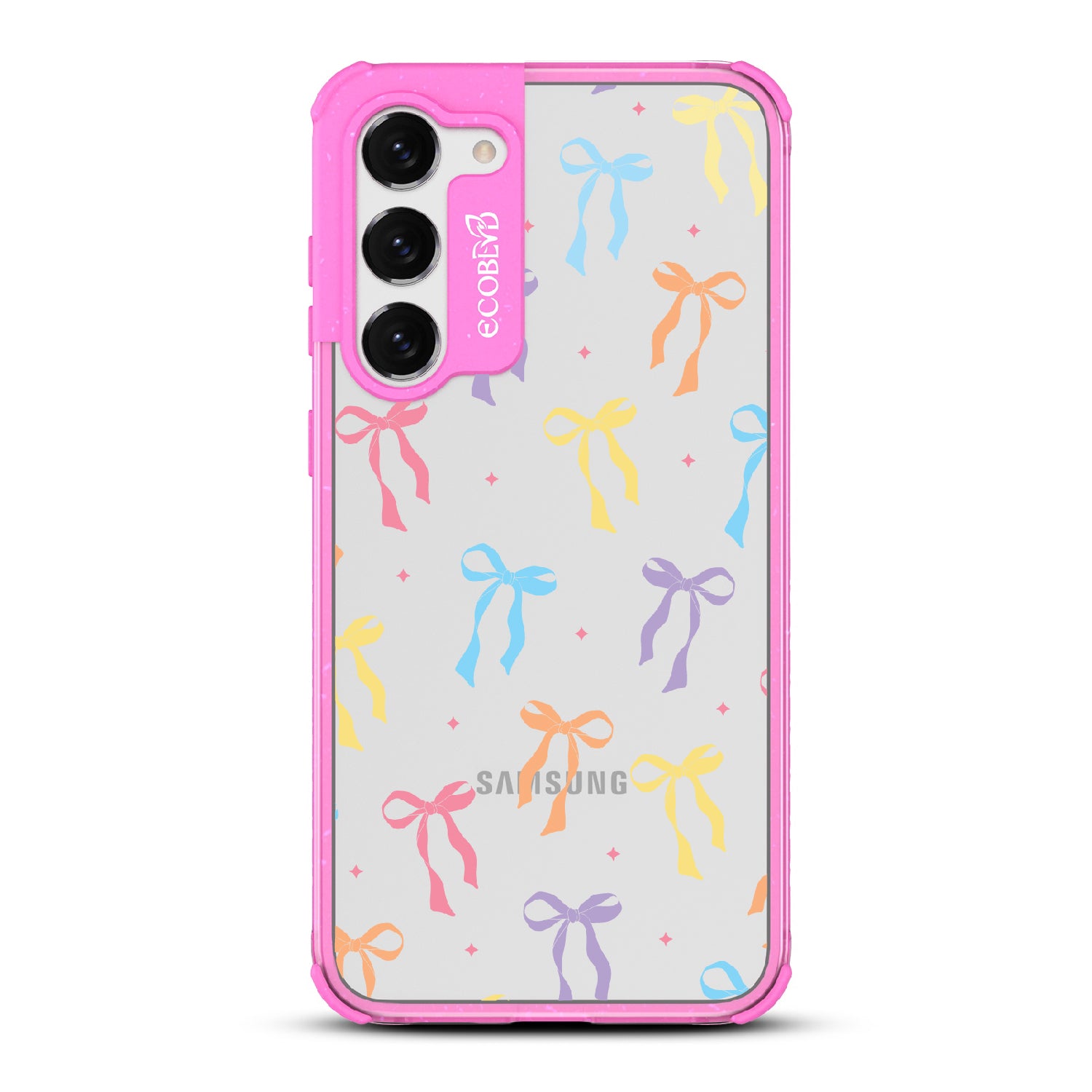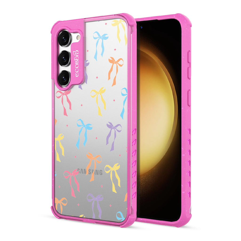 Galaxy S23 Plus phone case. Showcasing pastel bows that seem to float effortlessly on a delicate backdrop, this design brings a flirty, soft girl aesthetic to your phone, making it a perfect accessory for expressing your playful and sophisticated side. Choose Ribbon Dreams and let your phone reflect your dreamiest, most charming self.