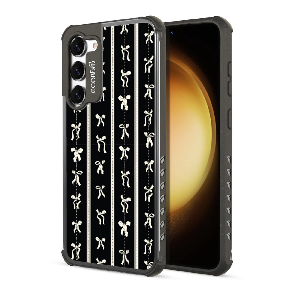 Galaxy S23 Plus phone case. Ribbons gracefully swirl on a sleek black lace backdrop, infusing your look with dainty sophistication. These twirling ribbons will make every step feel like a stylish dance.