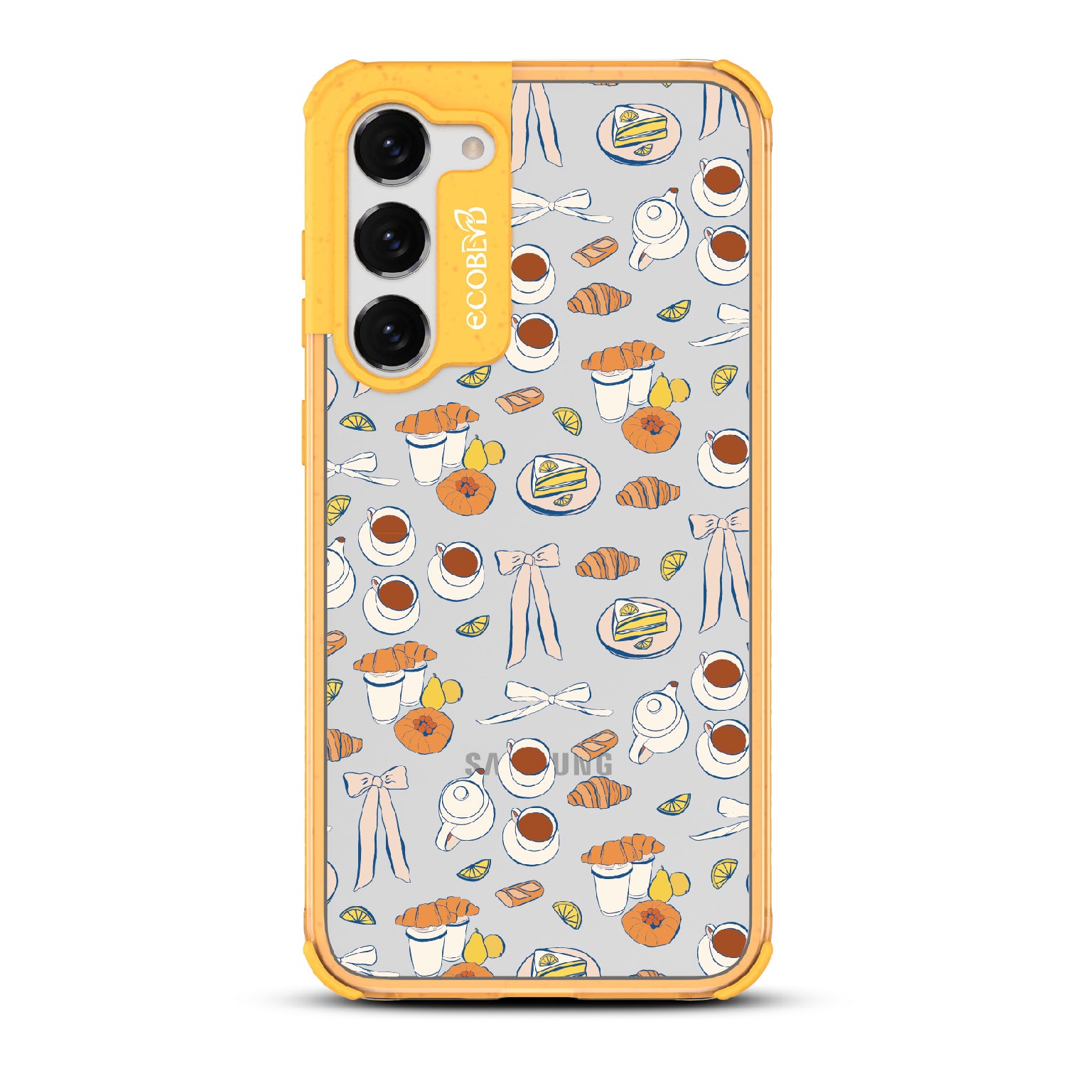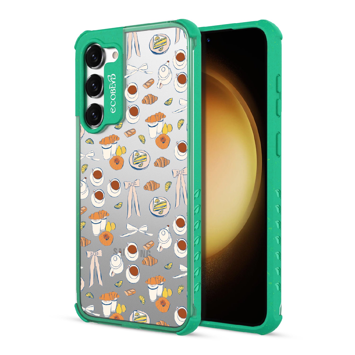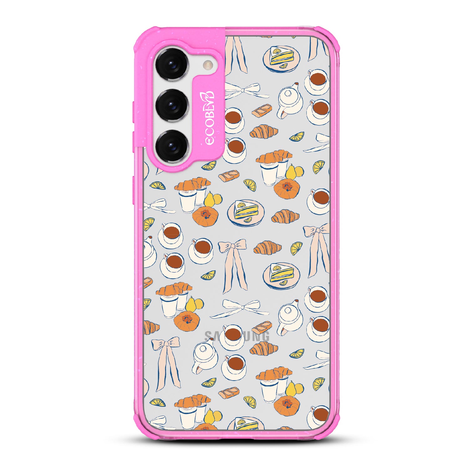 Tea time is the new happy hour. This design on our Laguna clear Galaxy S23 Plus case combines whimsical teacups, dainty bows, and sweet pastel pastries in style as delightful as a perfect afternoon break. A tribute to making time for yourself with a touch of elegance.