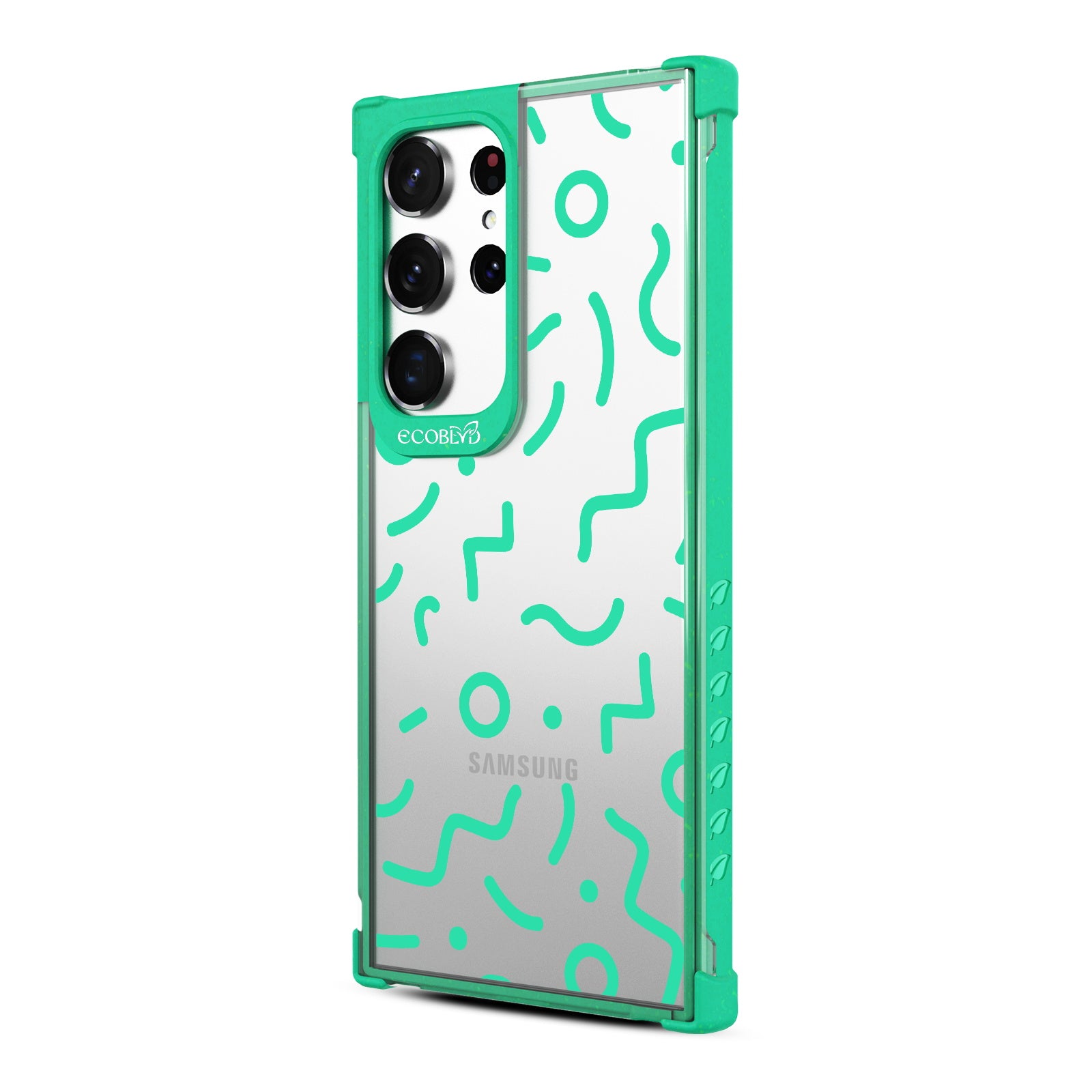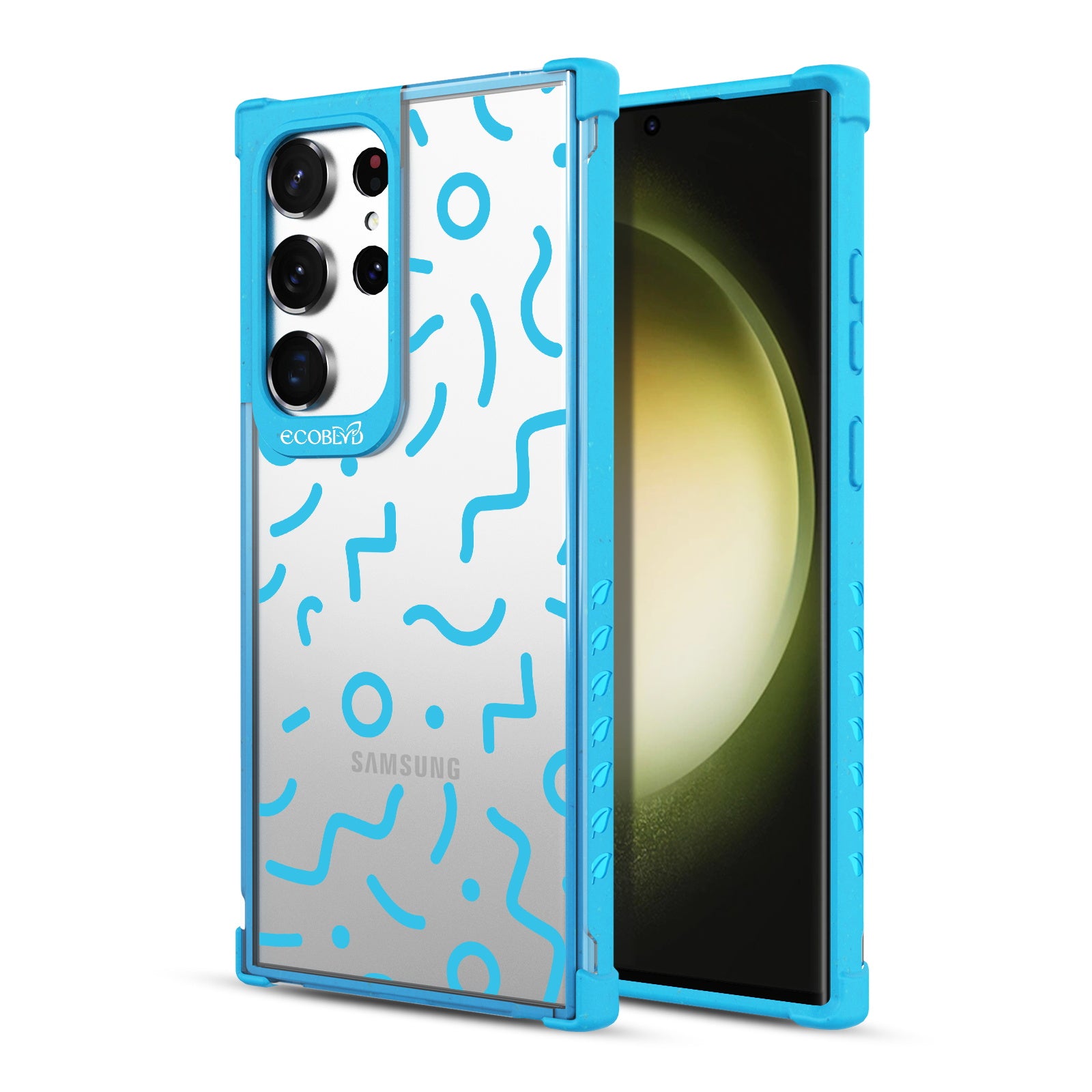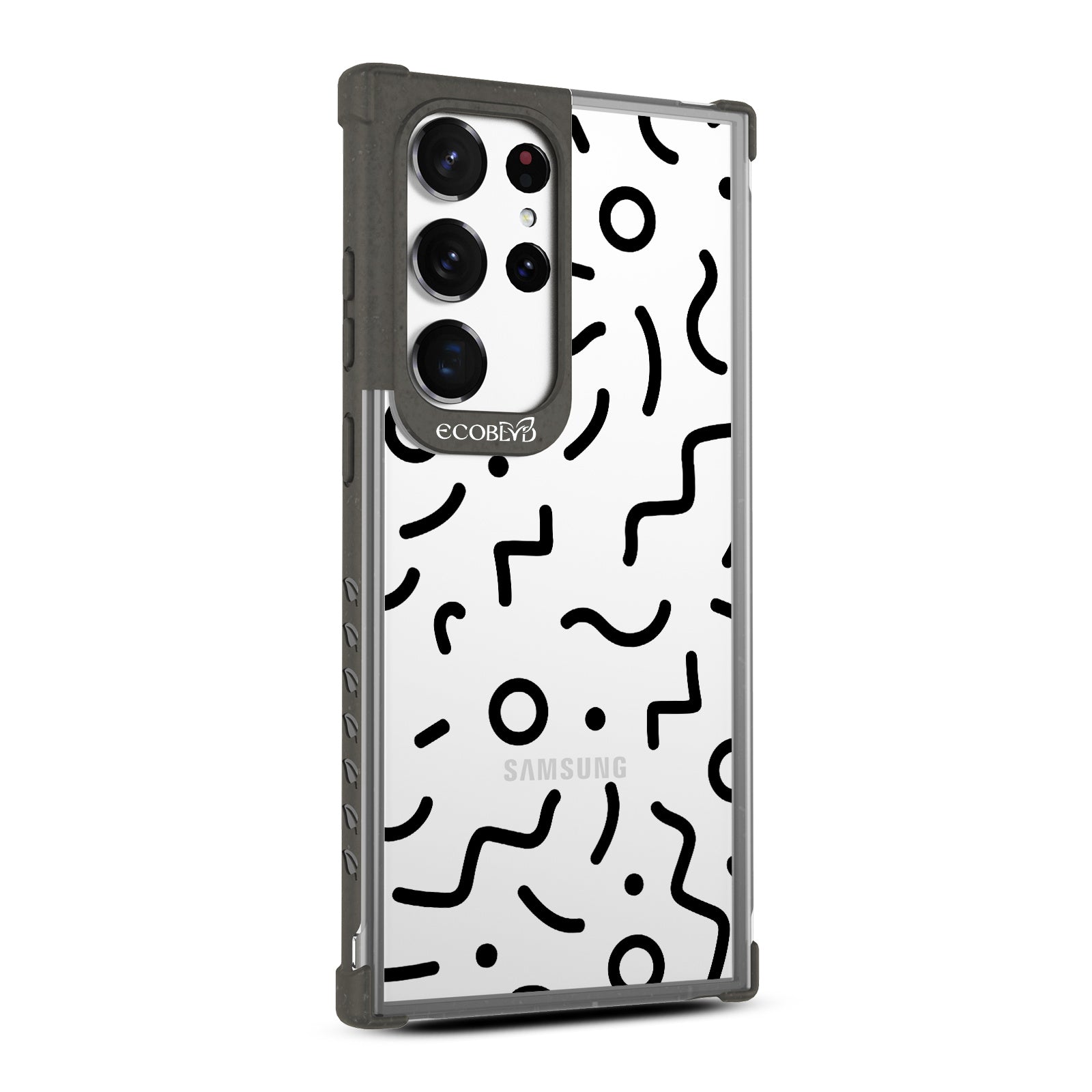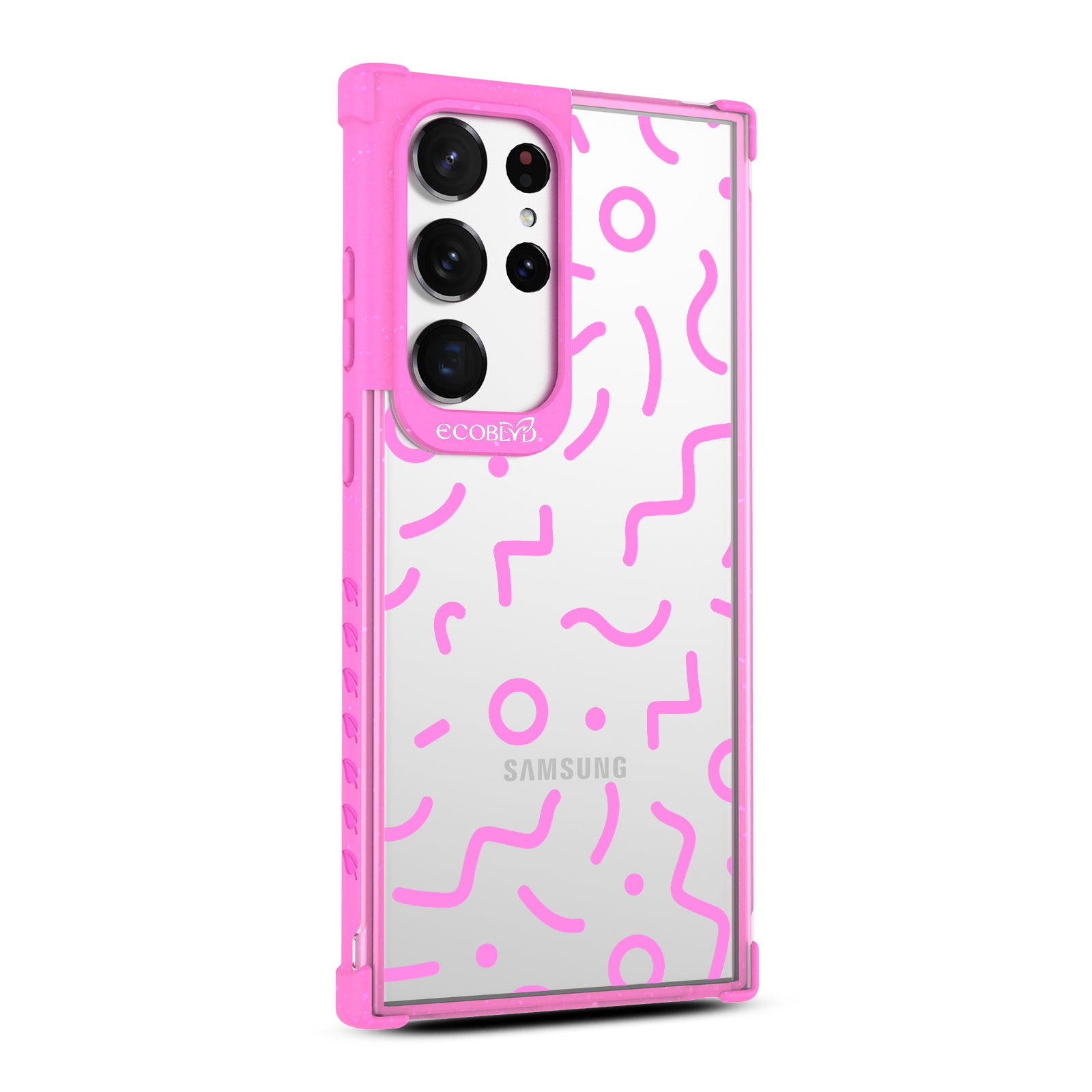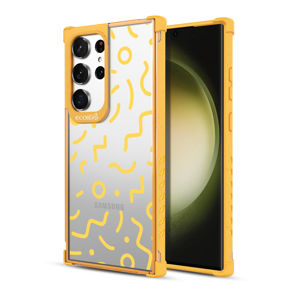 Experience a nostalgic blast from the past with the Laguna clear Galaxy S23 Ultra case - with a 90's-themed phone case design that offers style and protection while supporting ocean conservation efforts. The 90's Kids design features bold, wavy, and squiggly lines and circles in five vibrant colors: Midnight Black, Cascade Blue, Foliage Green, Illuminating Yellow, and Wildflower Pink.