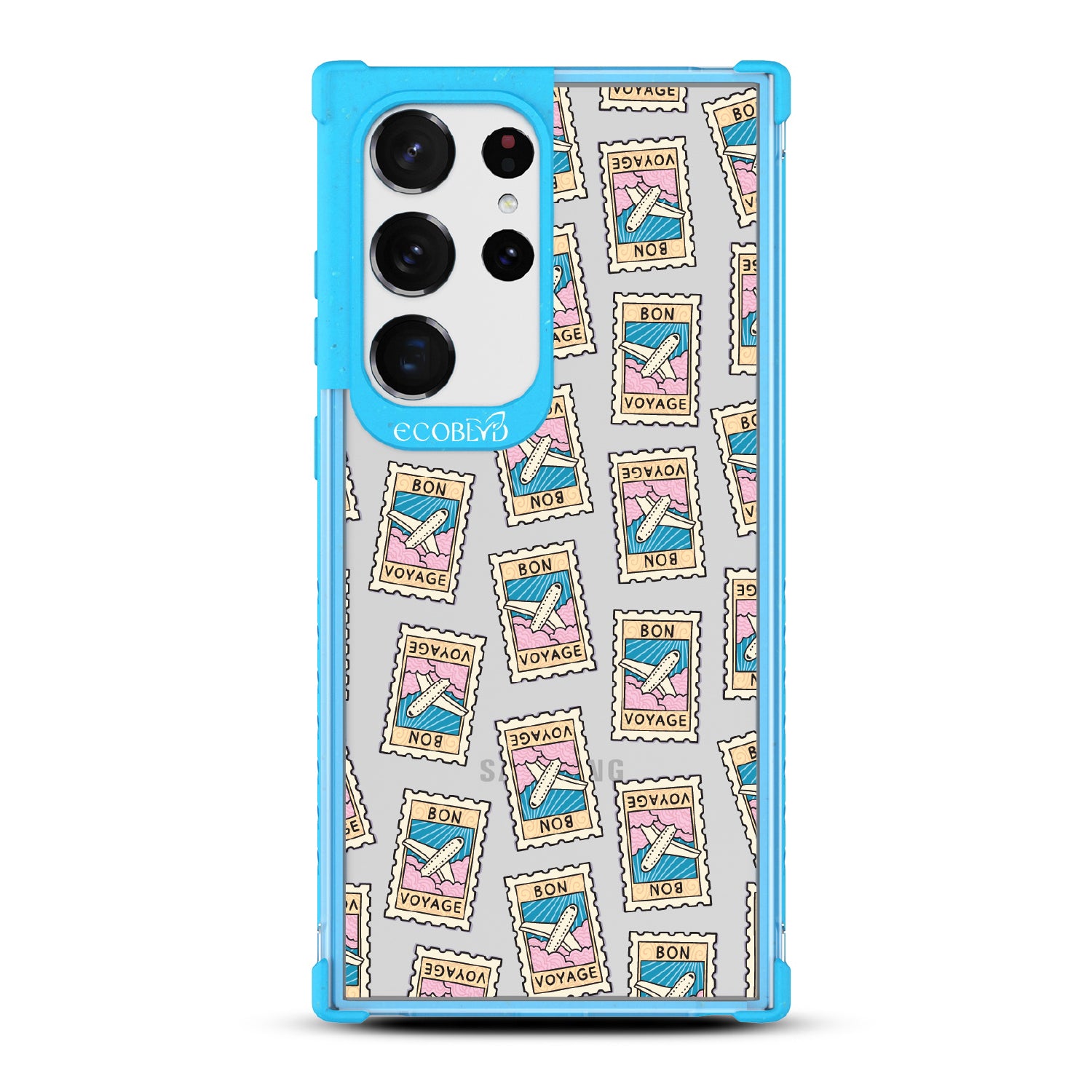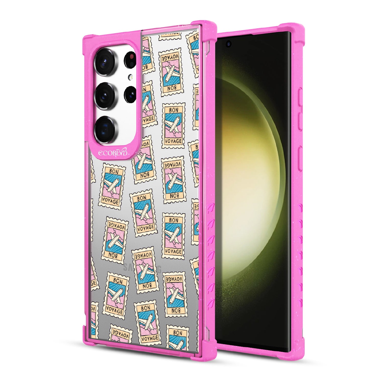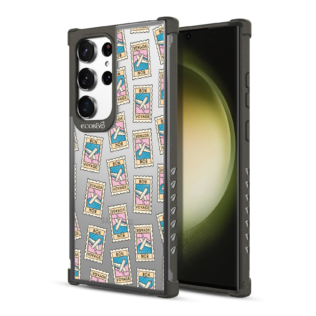 Ready for a stylish departure? The Bon Voyage design on our Laguna clear Galaxy S23 Ultra case is your phone's own first-class upgrade, where every 'Bon Voyage' stamp is a nod to your next great getaway. It's like turning on flight mode with a twist of runway—your sidekick dressed for adventure. Snap this case on, and let your phone's wanderlust lead the way. Buckle up, traveler—your pocket-sized co-pilot is about to make every journey fashionably memorable.