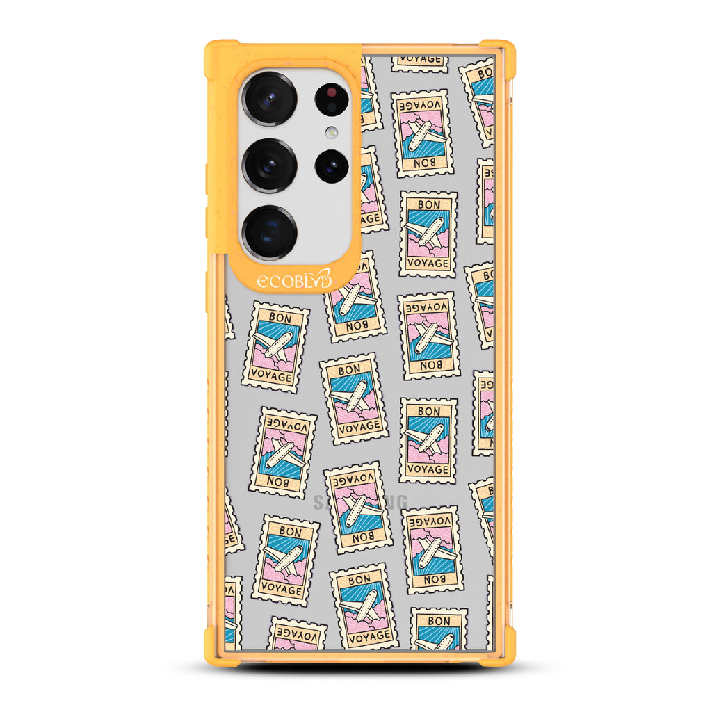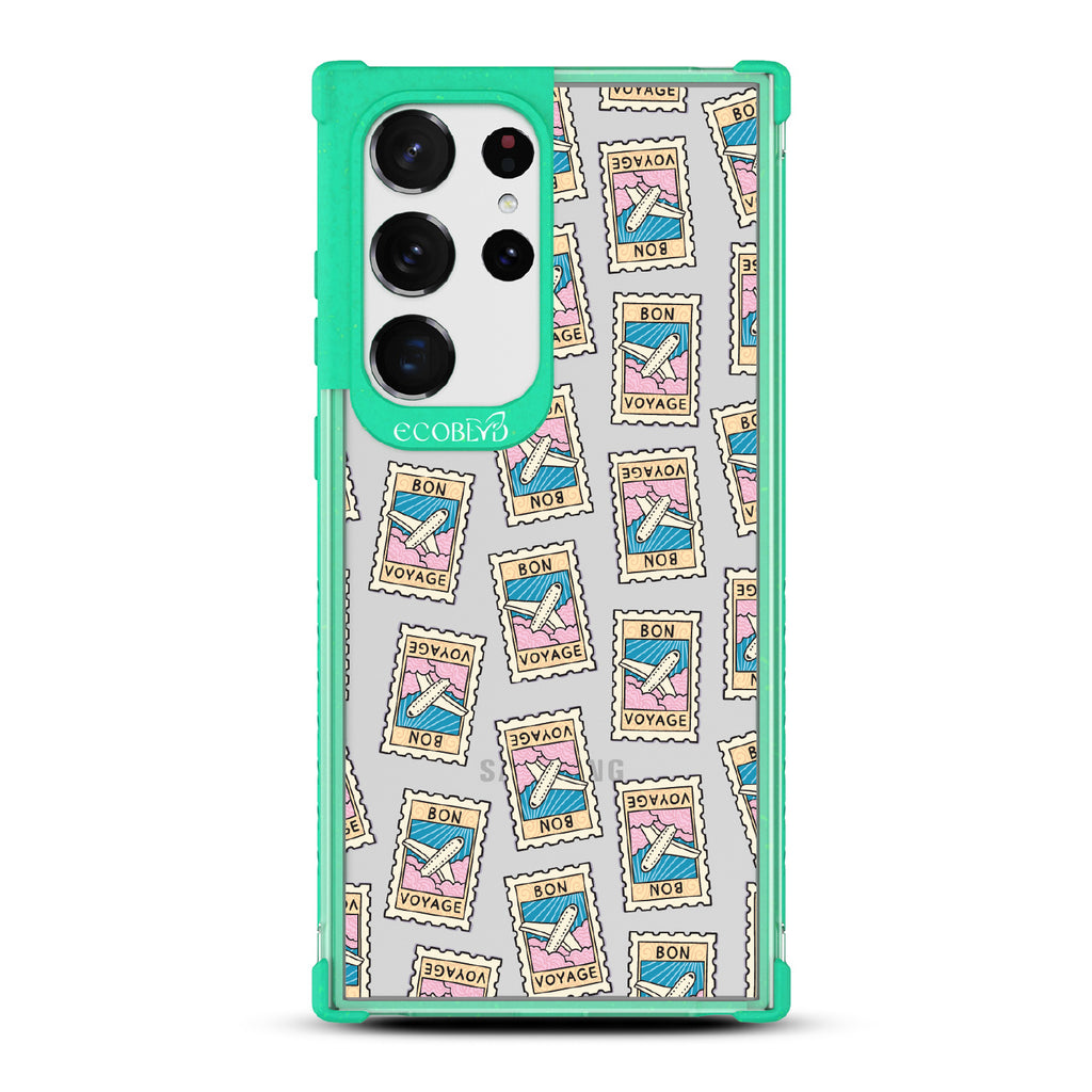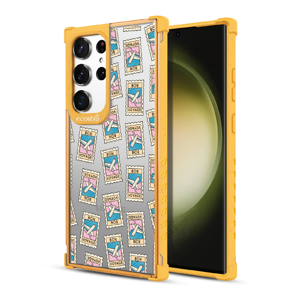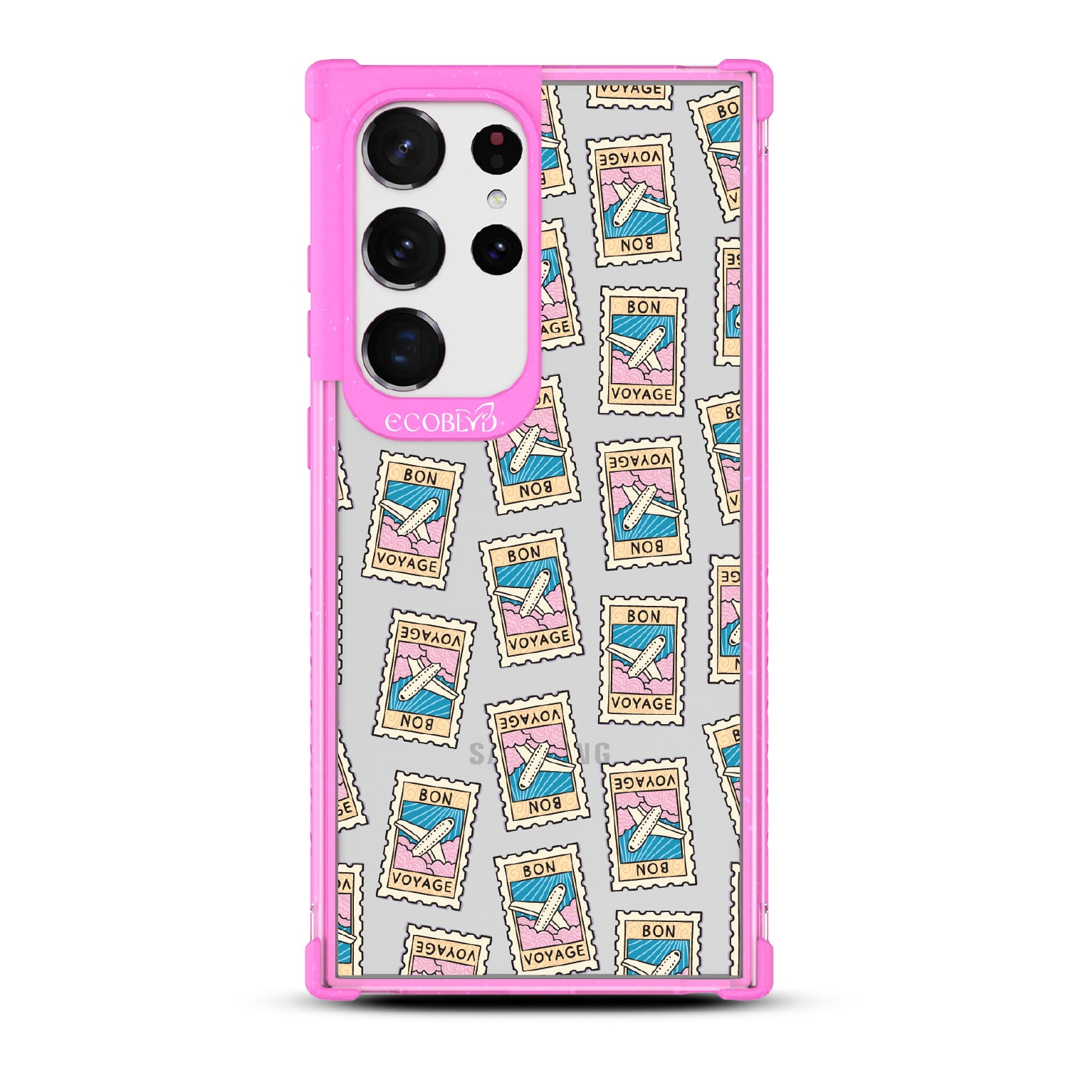 Ready for a stylish departure? The Bon Voyage design on our Laguna clear Galaxy S23 Ultra case is your phone's own first-class upgrade, where every 'Bon Voyage' stamp is a nod to your next great getaway. It's like turning on flight mode with a twist of runway—your sidekick dressed for adventure. Snap this case on, and let your phone's wanderlust lead the way. Buckle up, traveler—your pocket-sized co-pilot is about to make every journey fashionably memorable.