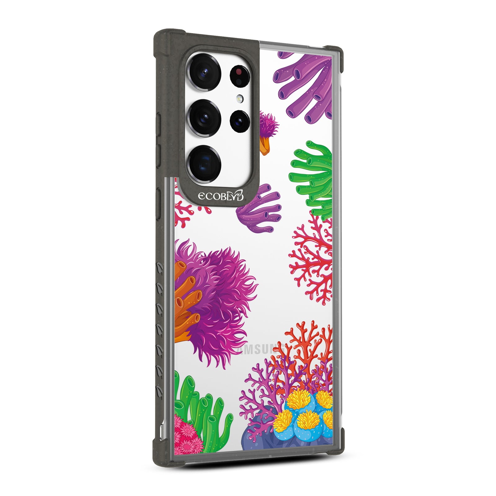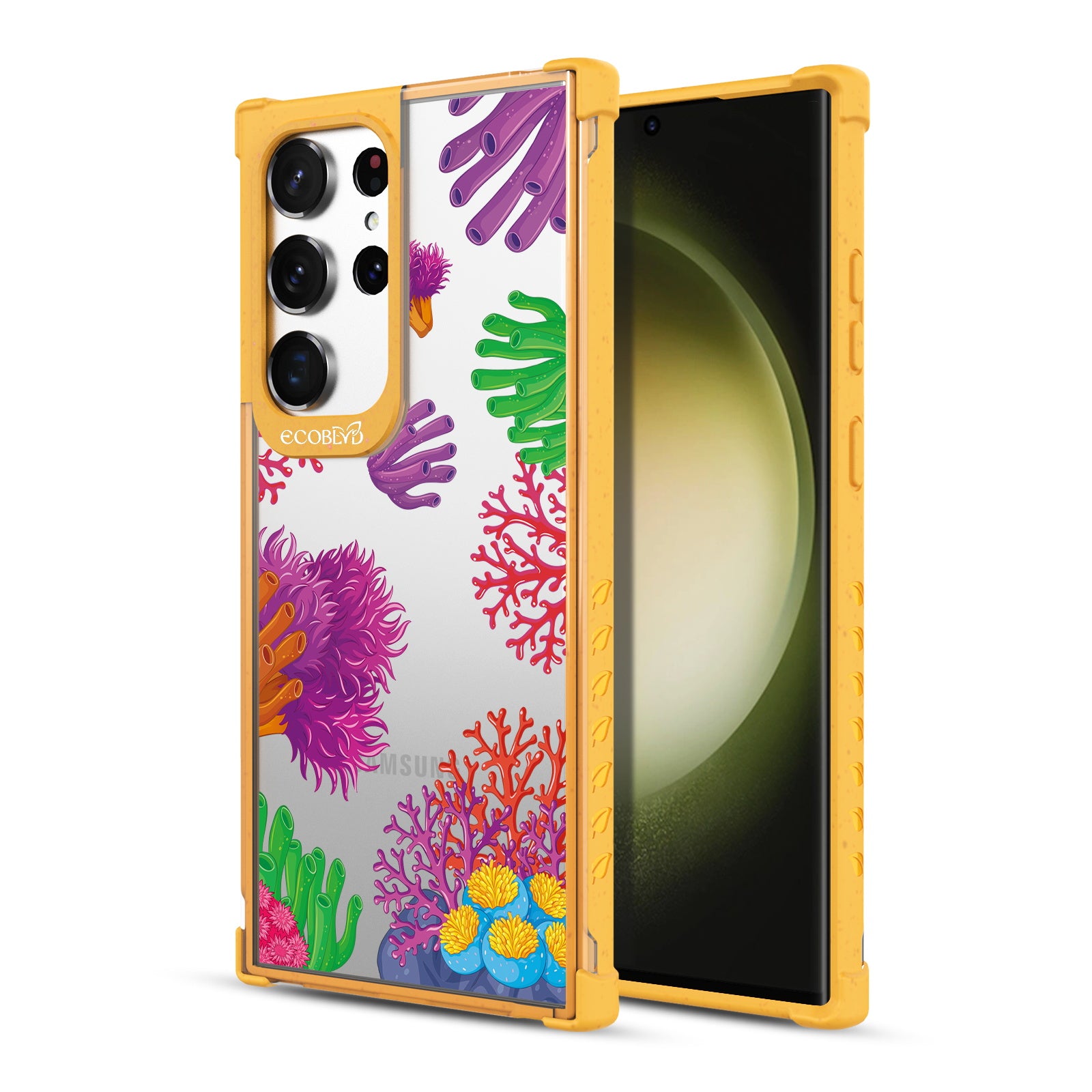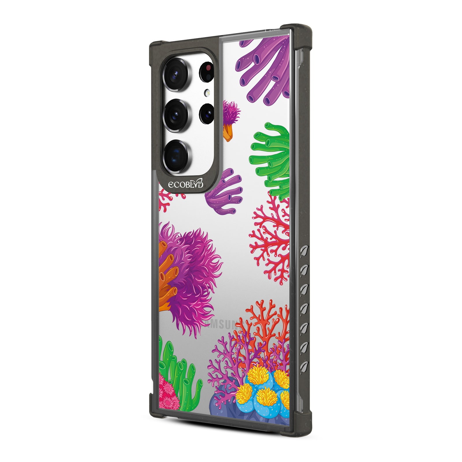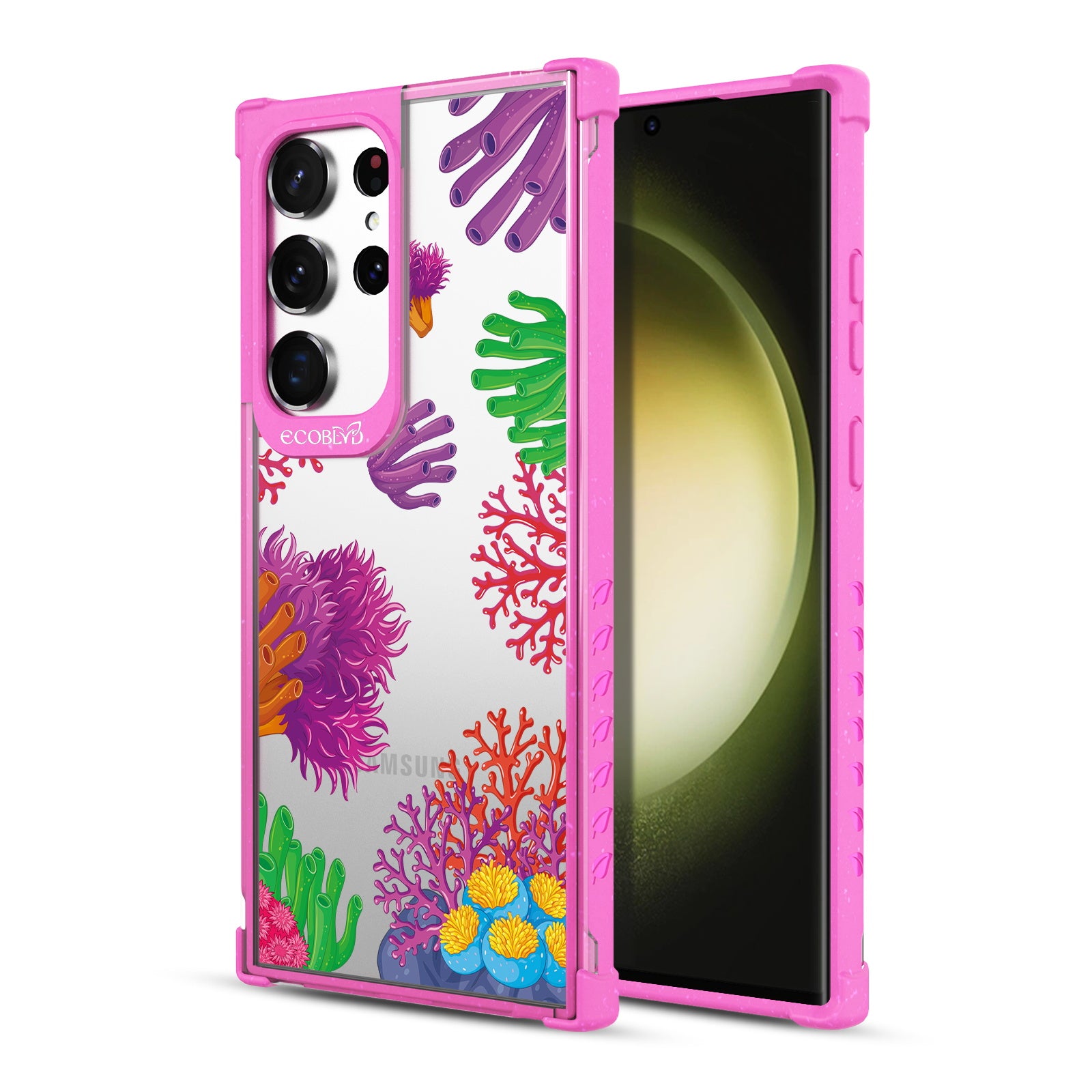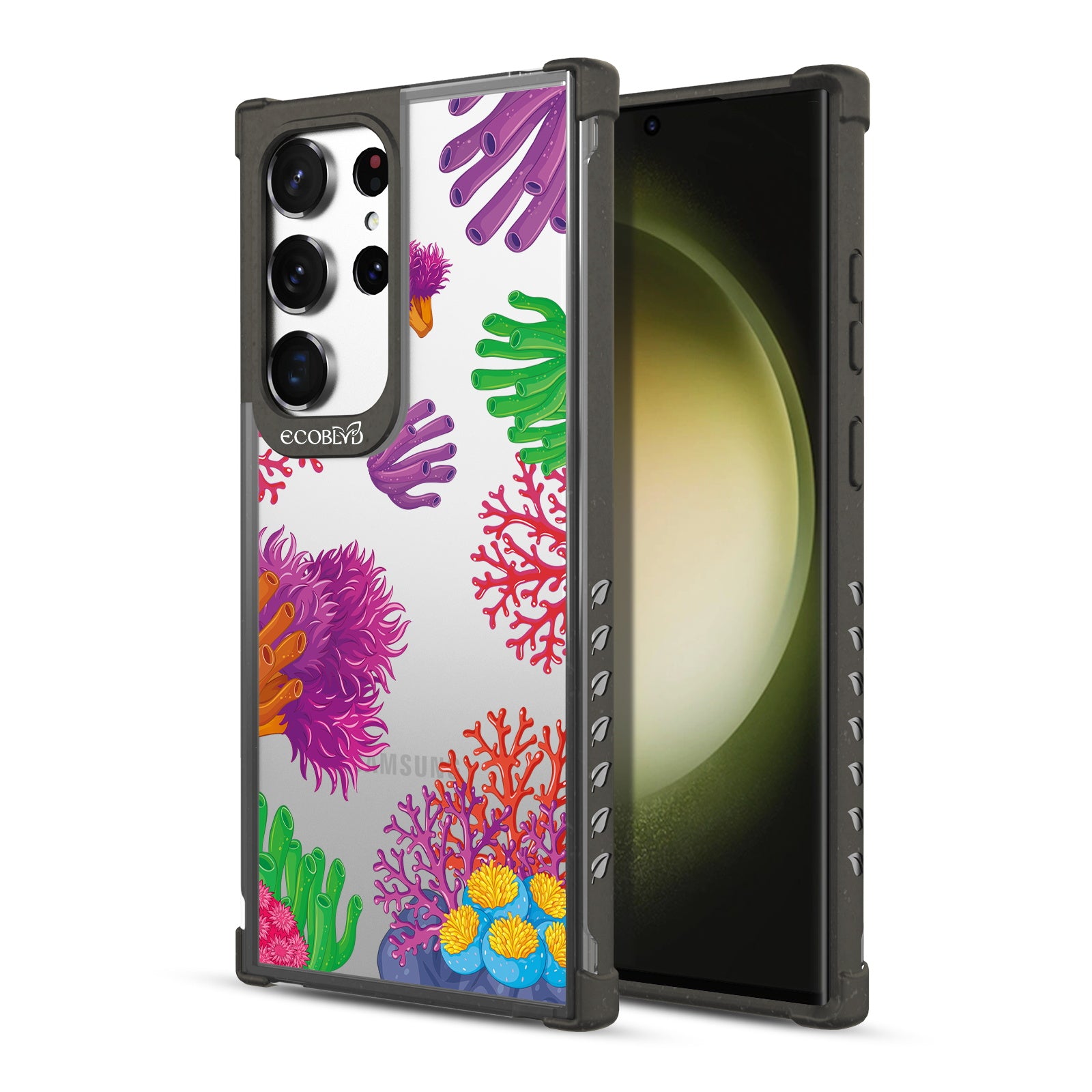 The Coral Reef design on our Laguna clear Galaxy S23 Ultra case instantly transforms your phone into an undersea adventure as these colorful phone cases are covered in anemones, sea grass, and other stunning tropical underwater plants across five vibrant color options: Midnight Black, Cascade Blue, Foliage Green, Illuminating Yellow, and Wildflower Pink.Â
