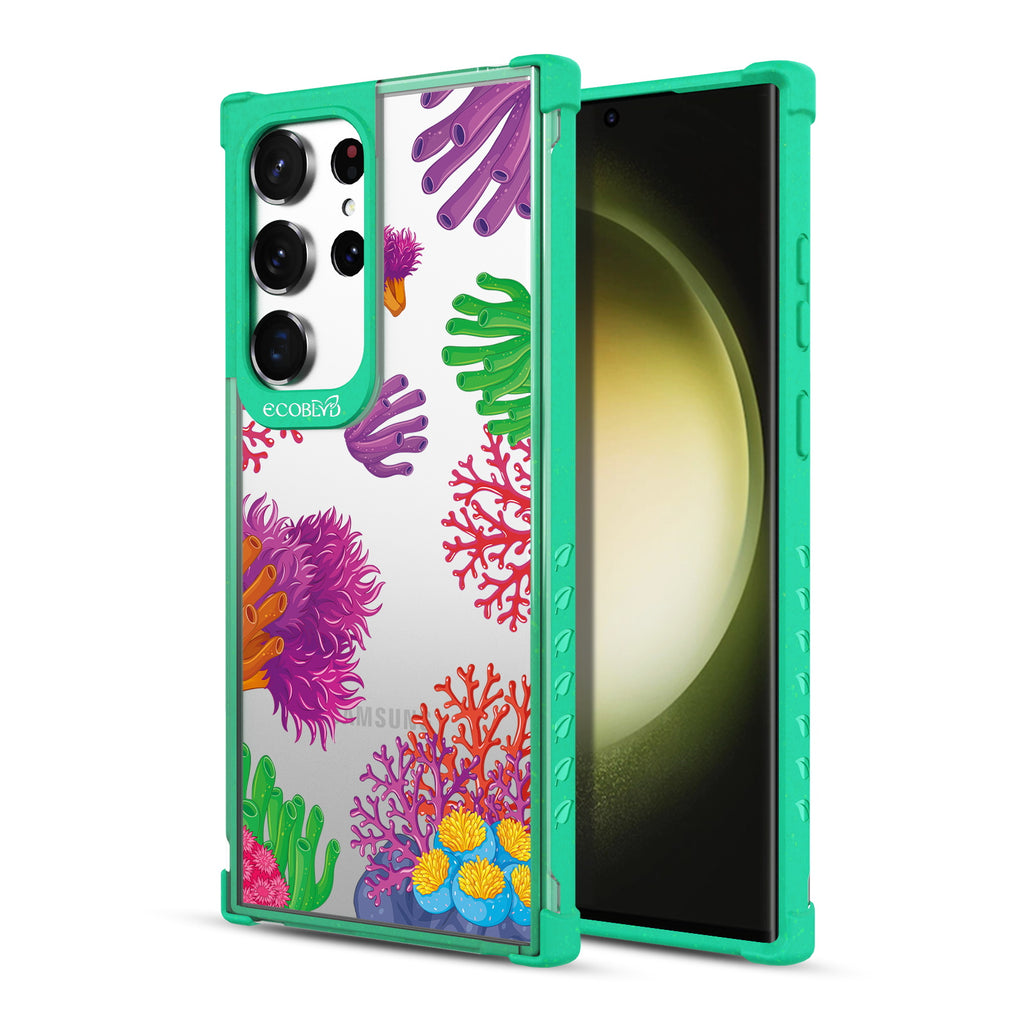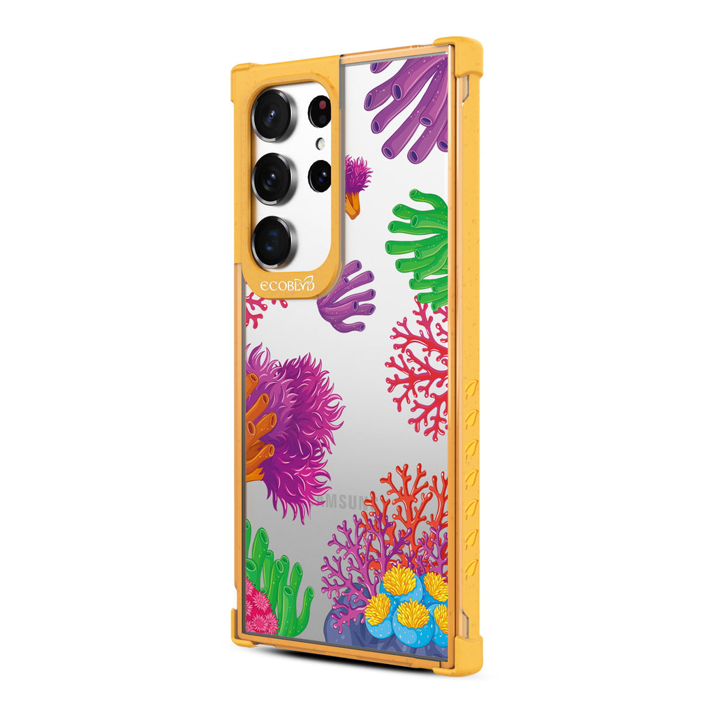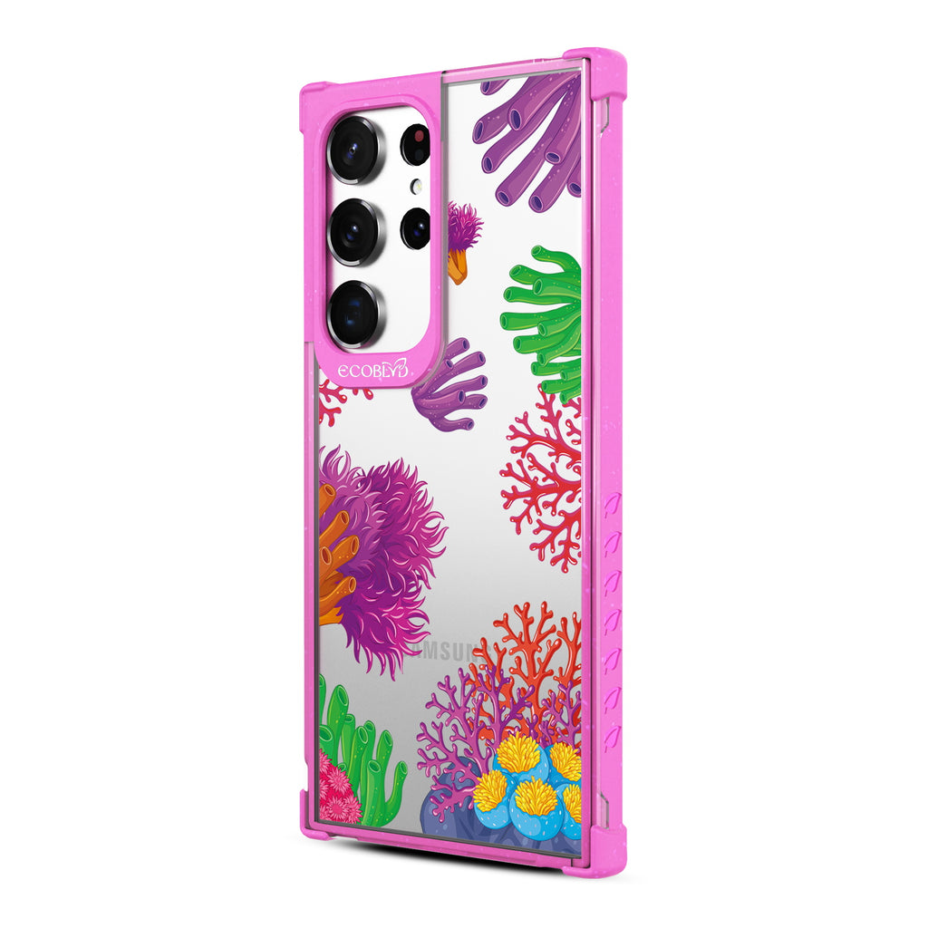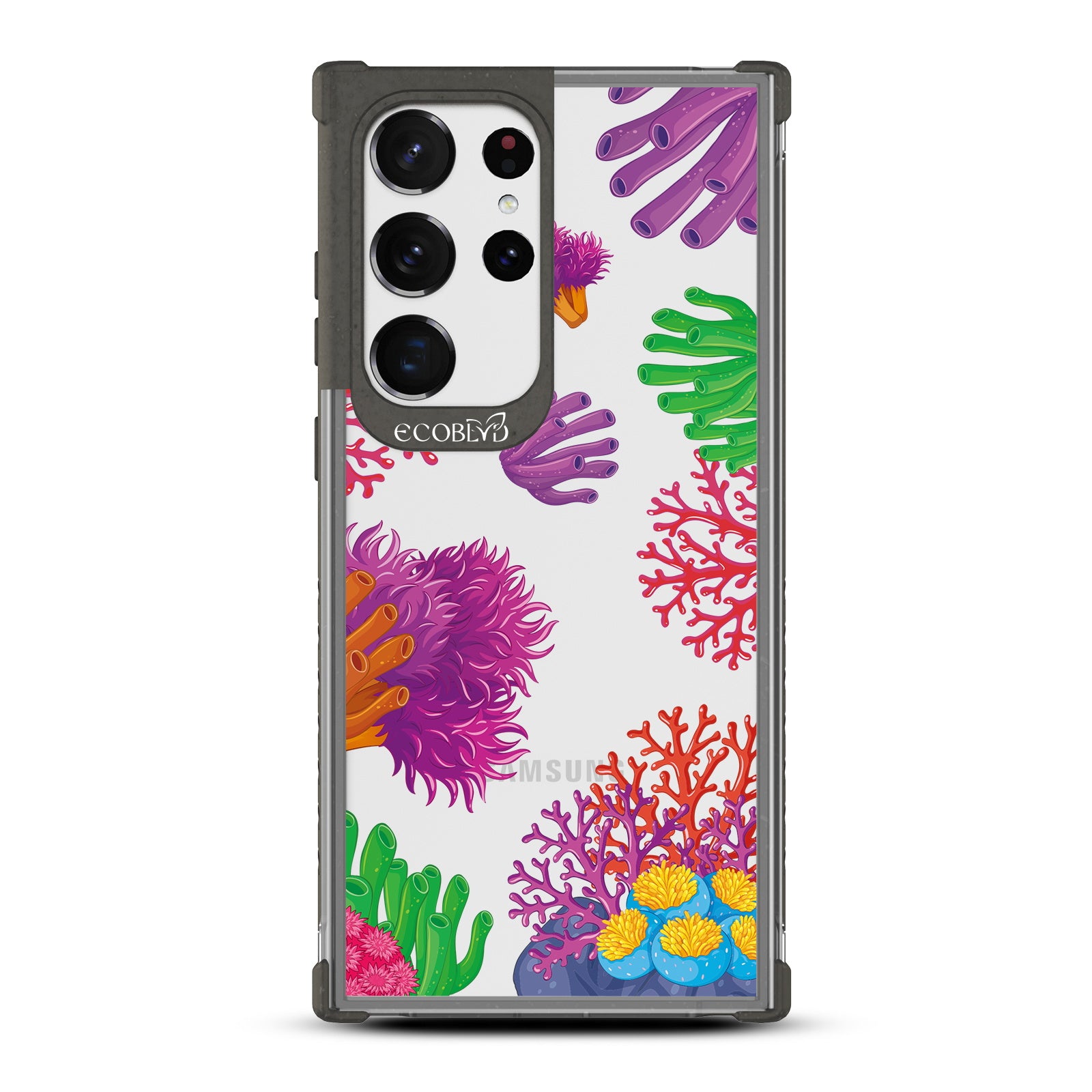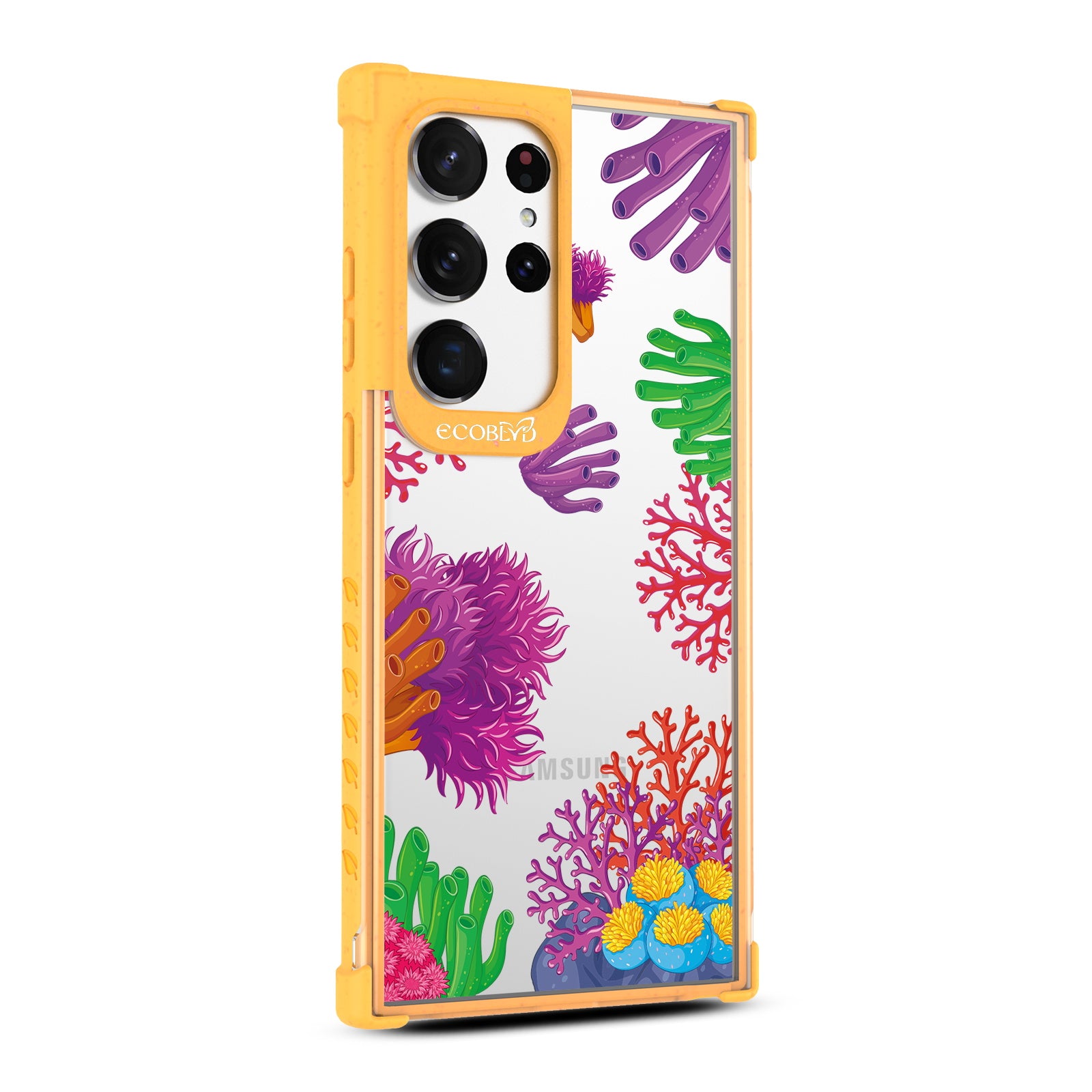 The Coral Reef design on our Laguna clear Galaxy S23 Ultra case instantly transforms your phone into an undersea adventure as these colorful phone cases are covered in anemones, sea grass, and other stunning tropical underwater plants across five vibrant color options: Midnight Black, Cascade Blue, Foliage Green, Illuminating Yellow, and Wildflower Pink.Â