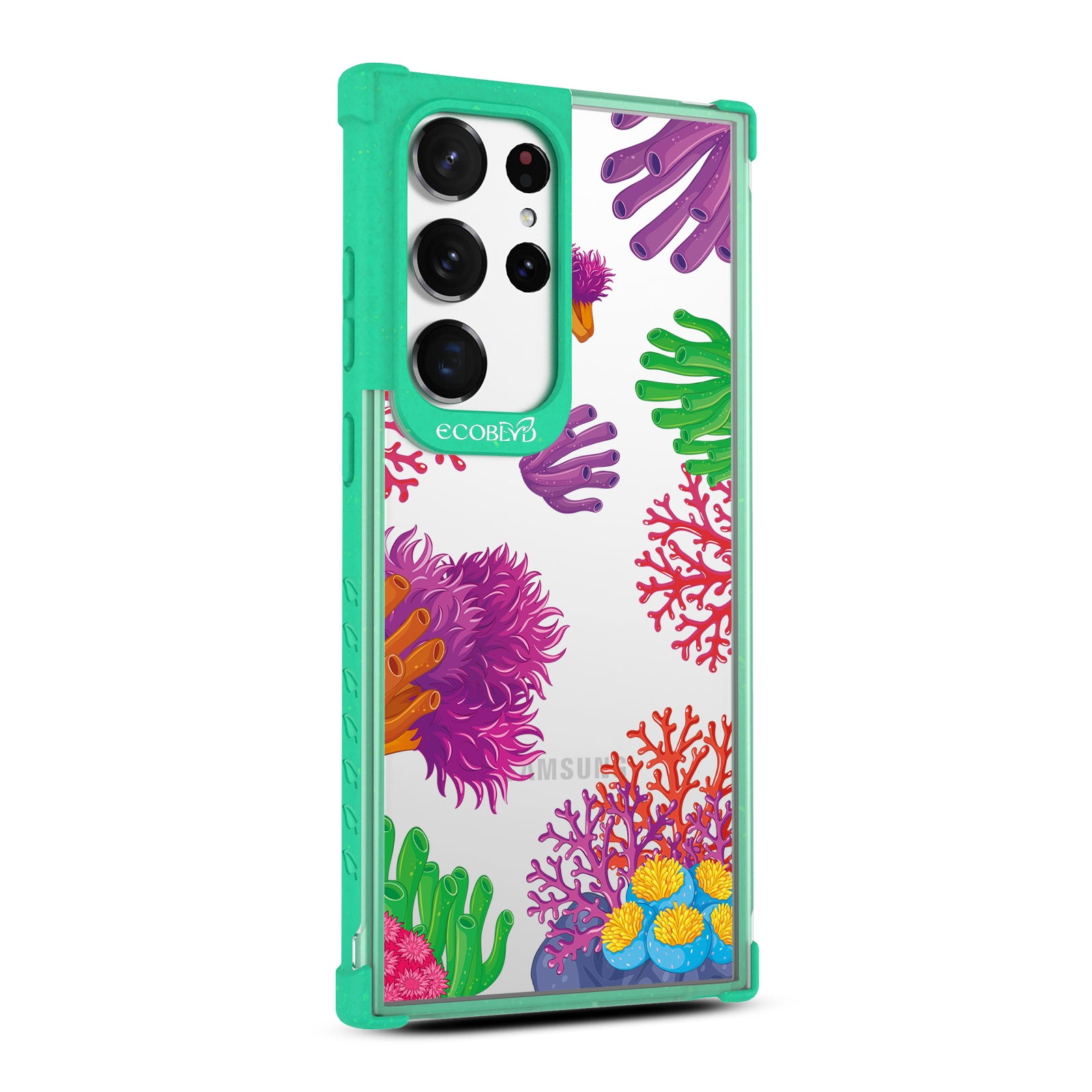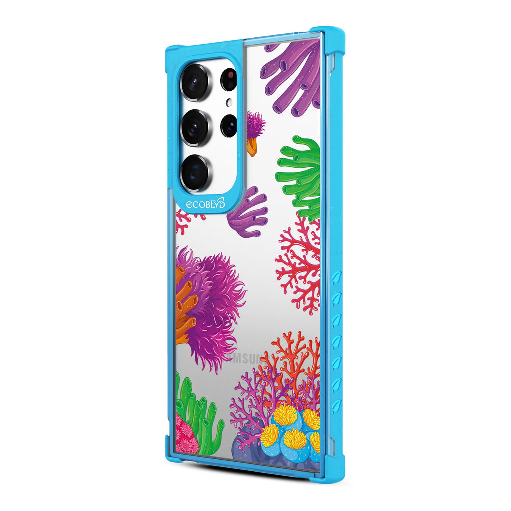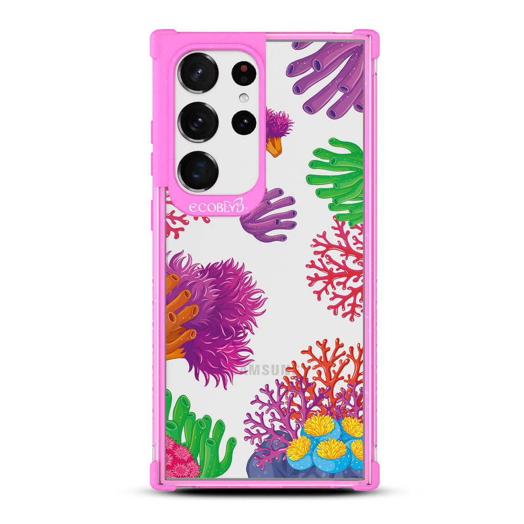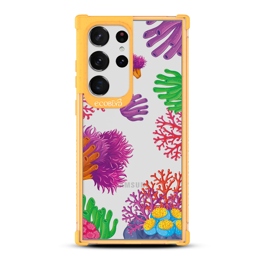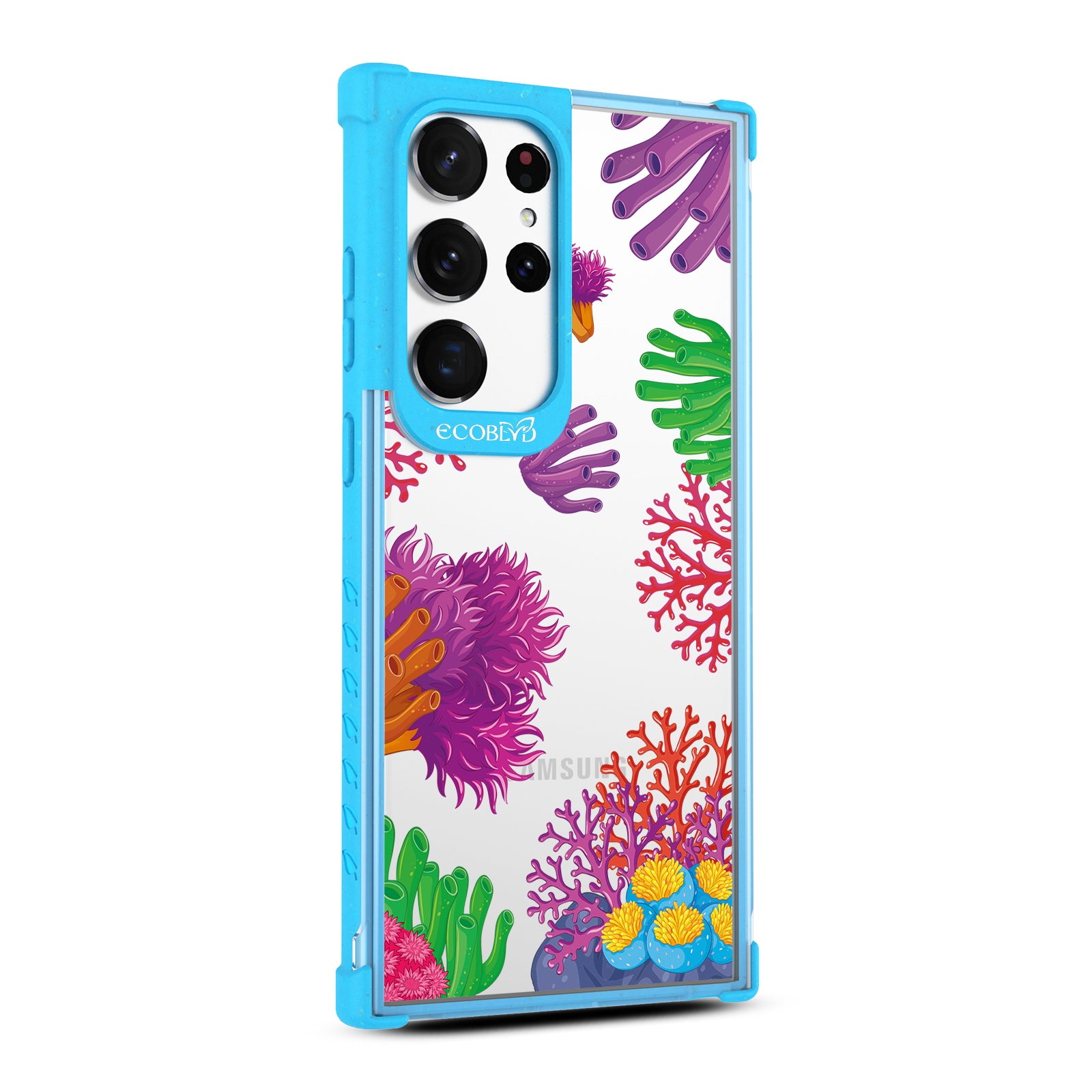 The Coral Reef design on our Laguna clear Galaxy S23 Ultra case instantly transforms your phone into an undersea adventure as these colorful phone cases are covered in anemones, sea grass, and other stunning tropical underwater plants across five vibrant color options: Midnight Black, Cascade Blue, Foliage Green, Illuminating Yellow, and Wildflower Pink.Â