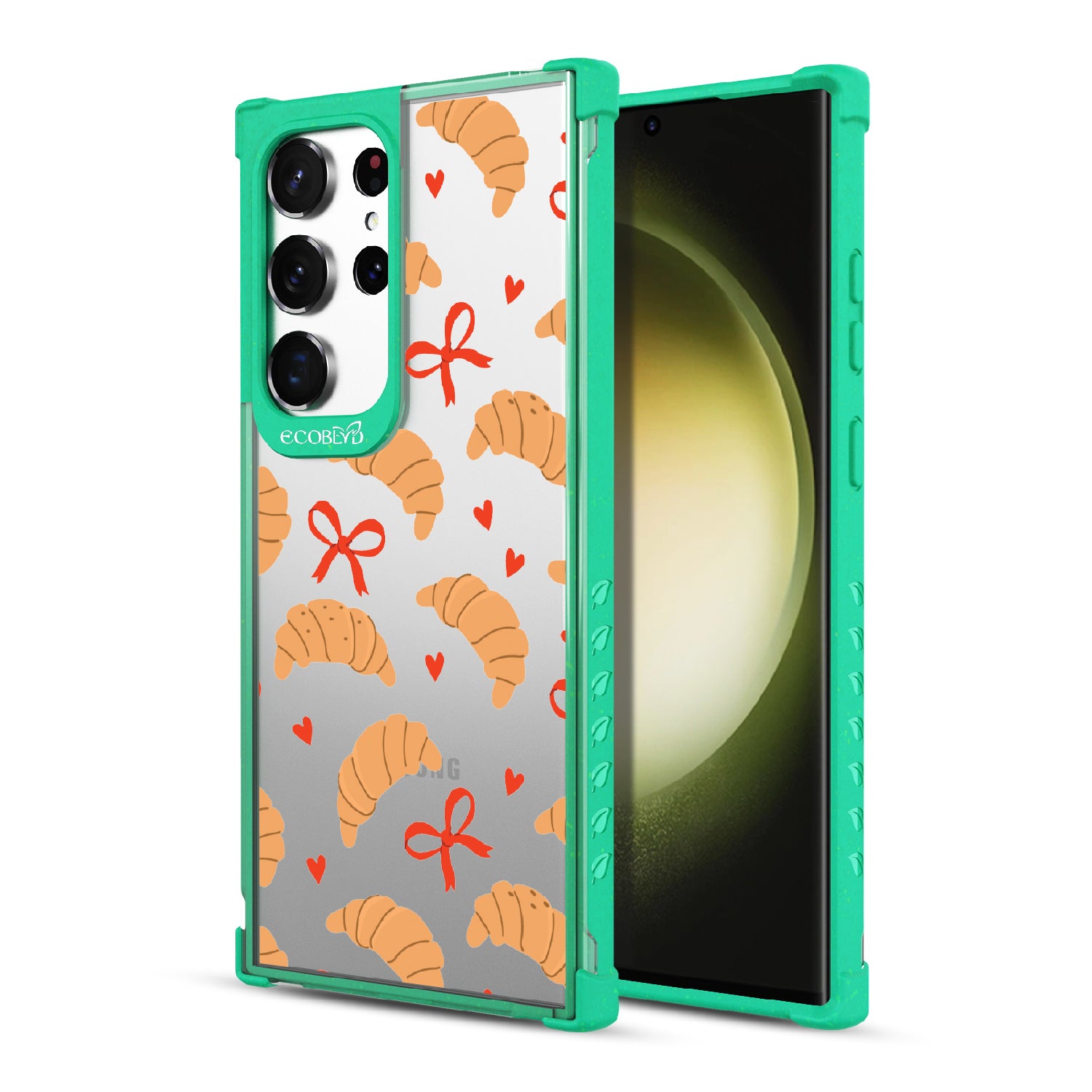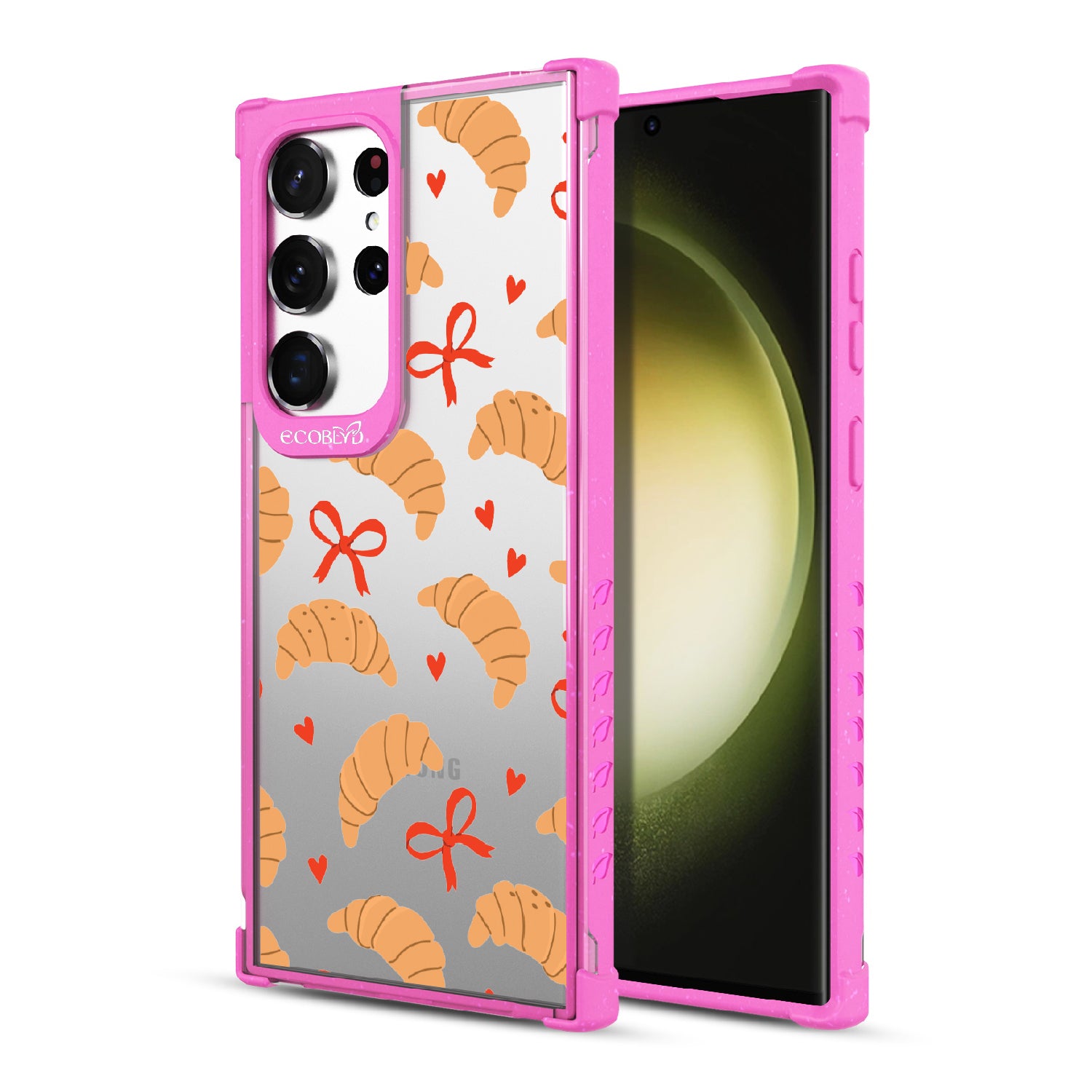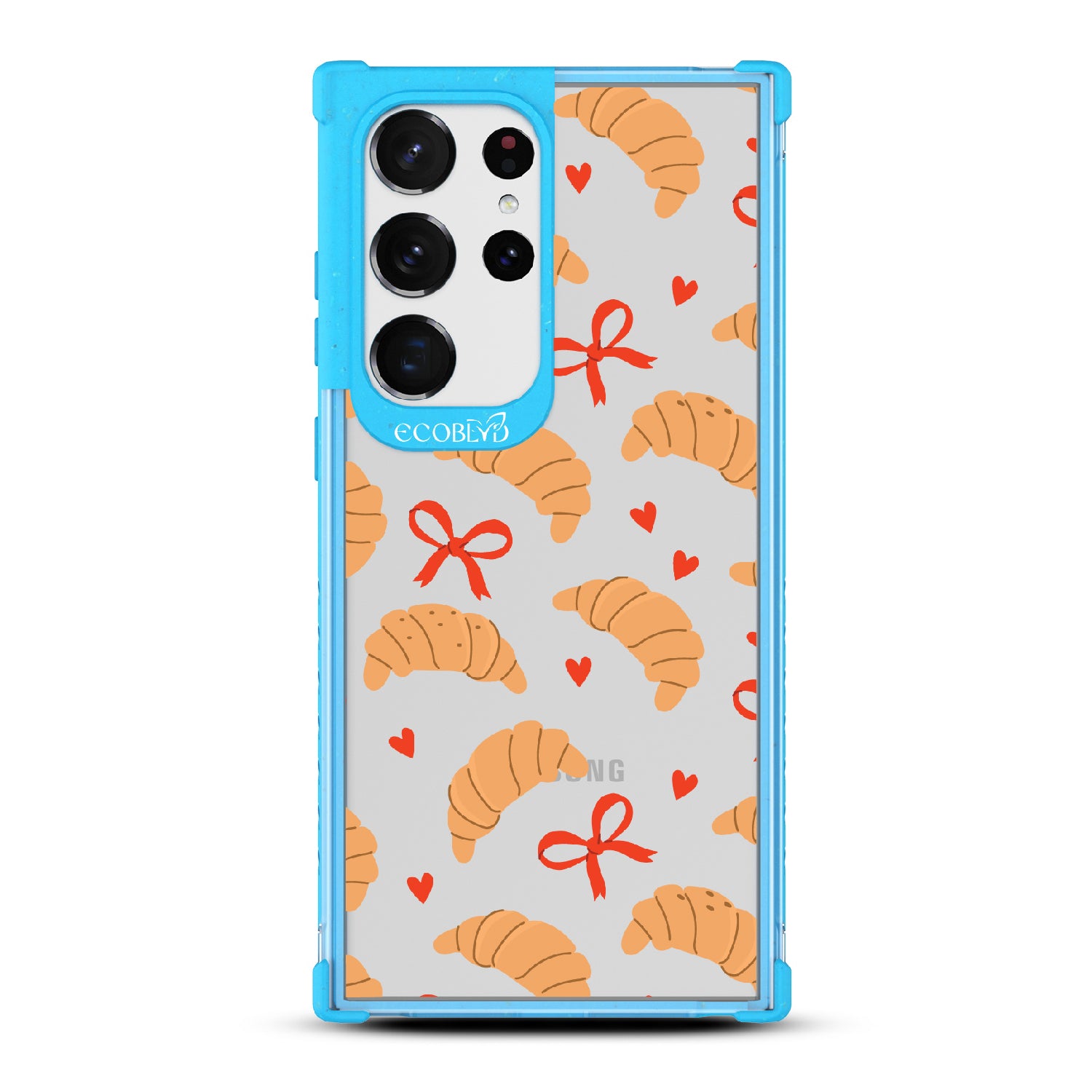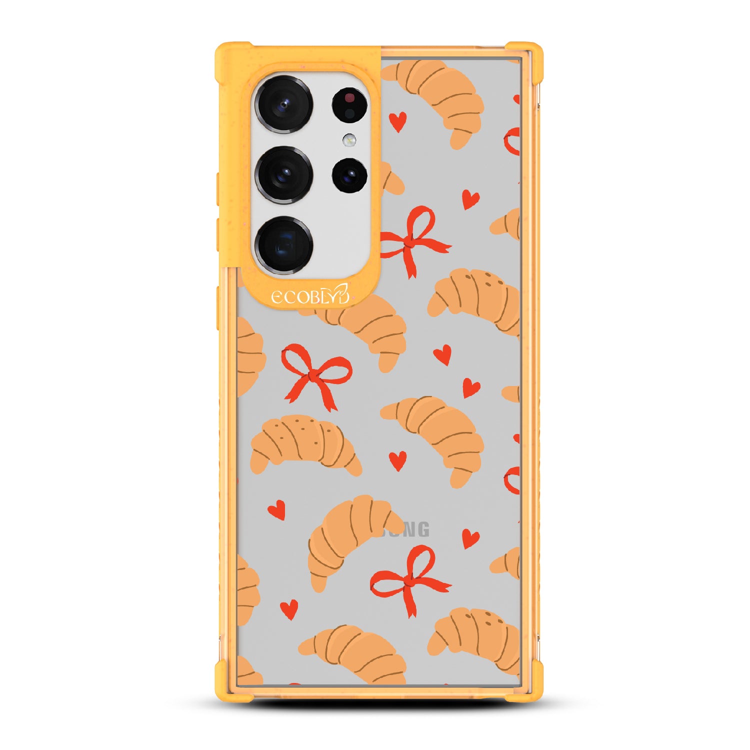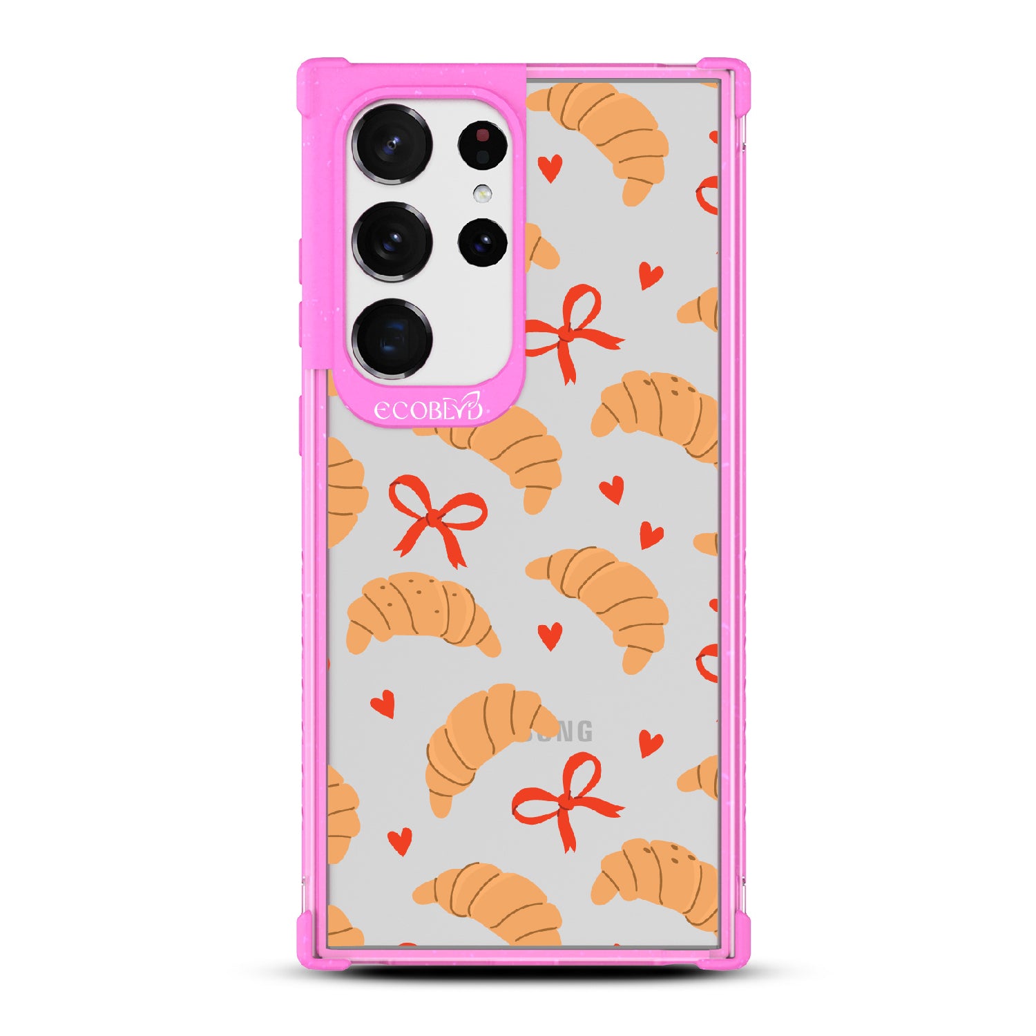 Good taste deserves the perfect recipe like the Croissant Couture design on our Laguna clear Galaxy S23 Ultra case! Softly folded croissants, tied with dainty red bows and sprinkled with sweet hearts, evoke the lightness and care of a true delicacy.