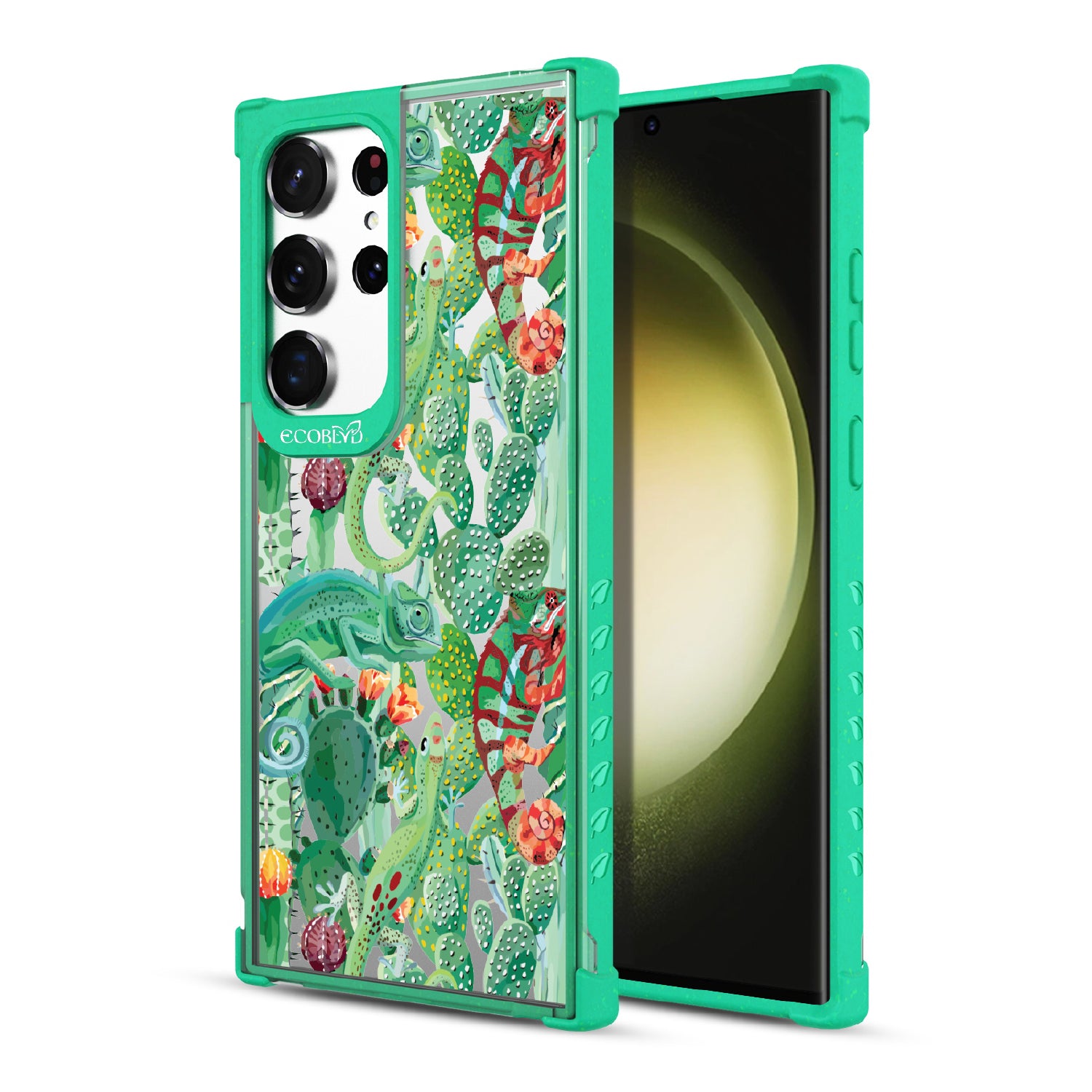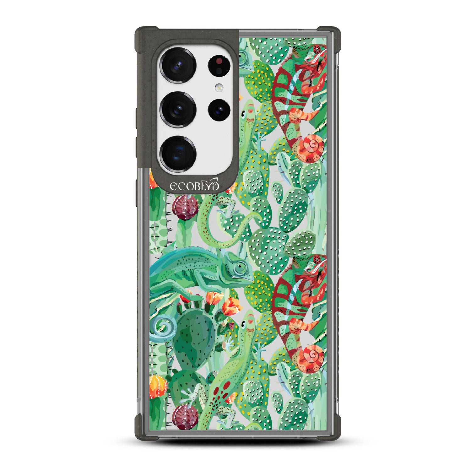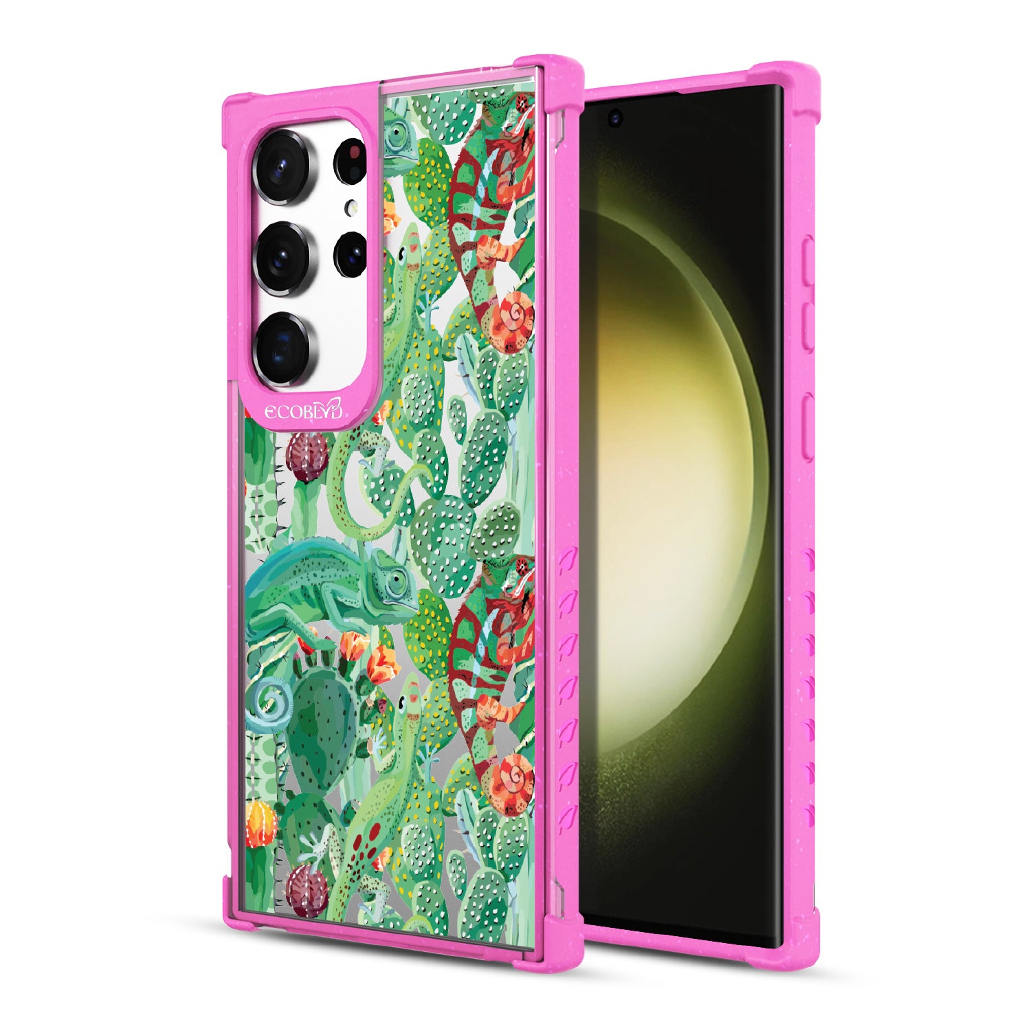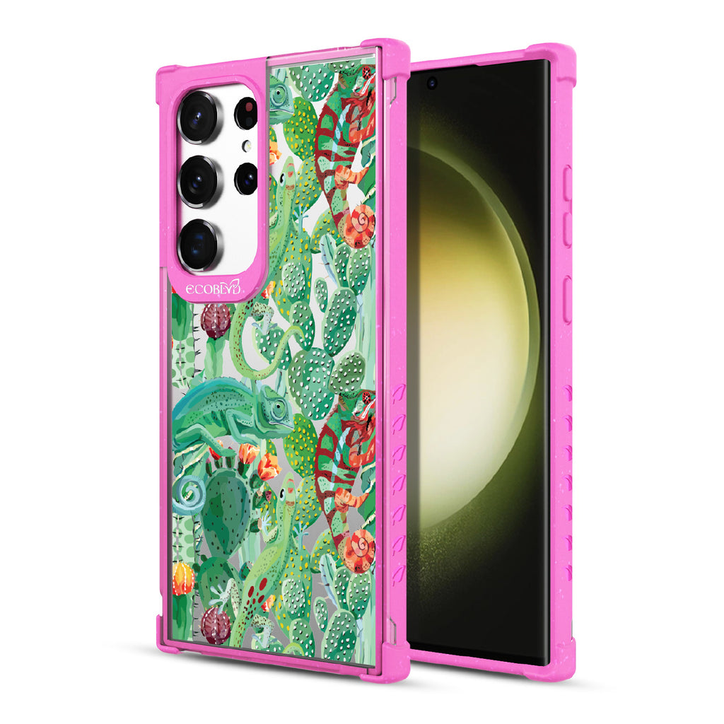 Embrace the captivating artistry of nature's hidden wonders with In Plain Sight, an exclusive design crafted for the Laguna clear Galaxy S23 Ultra phone case. Immerse yourself in impeccable style and protection while supporting ocean conservation efforts, as you embark on a wild journey with this captivating phone case. This design shows that sometimes, the most beautiful things are hiding In Plain Sight with a playful nod to the chameleons' camouflage abilities and their effortless blend into the colorful cactus landscape in five captivating colors: Midnight Black, Cascade Blue, Foliage Green, Illuminating Yellow, and Wildflower Pink.