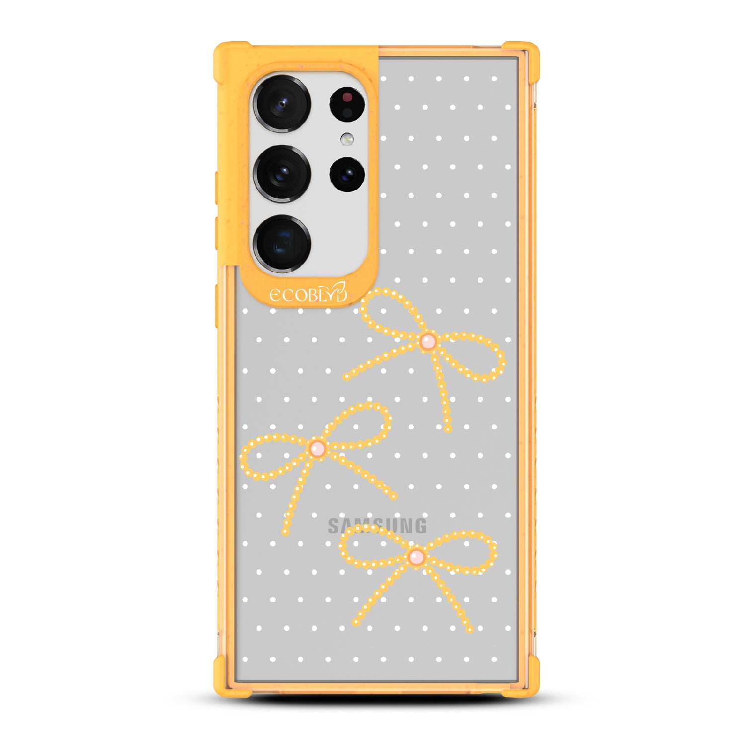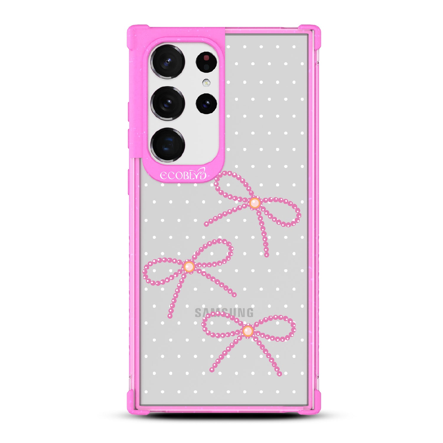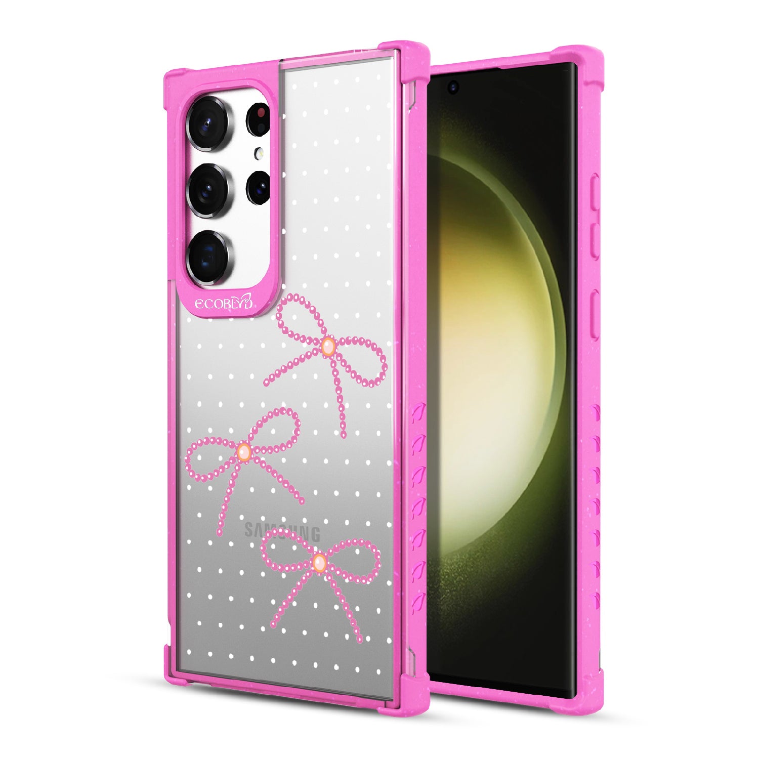 Galaxy S23 Ultra phone case brings big style in small doses. Featuring pearls tied into dainty bows, this design adds a sophisticated touch to your phone. Show off your love for the little things with this elegant look.