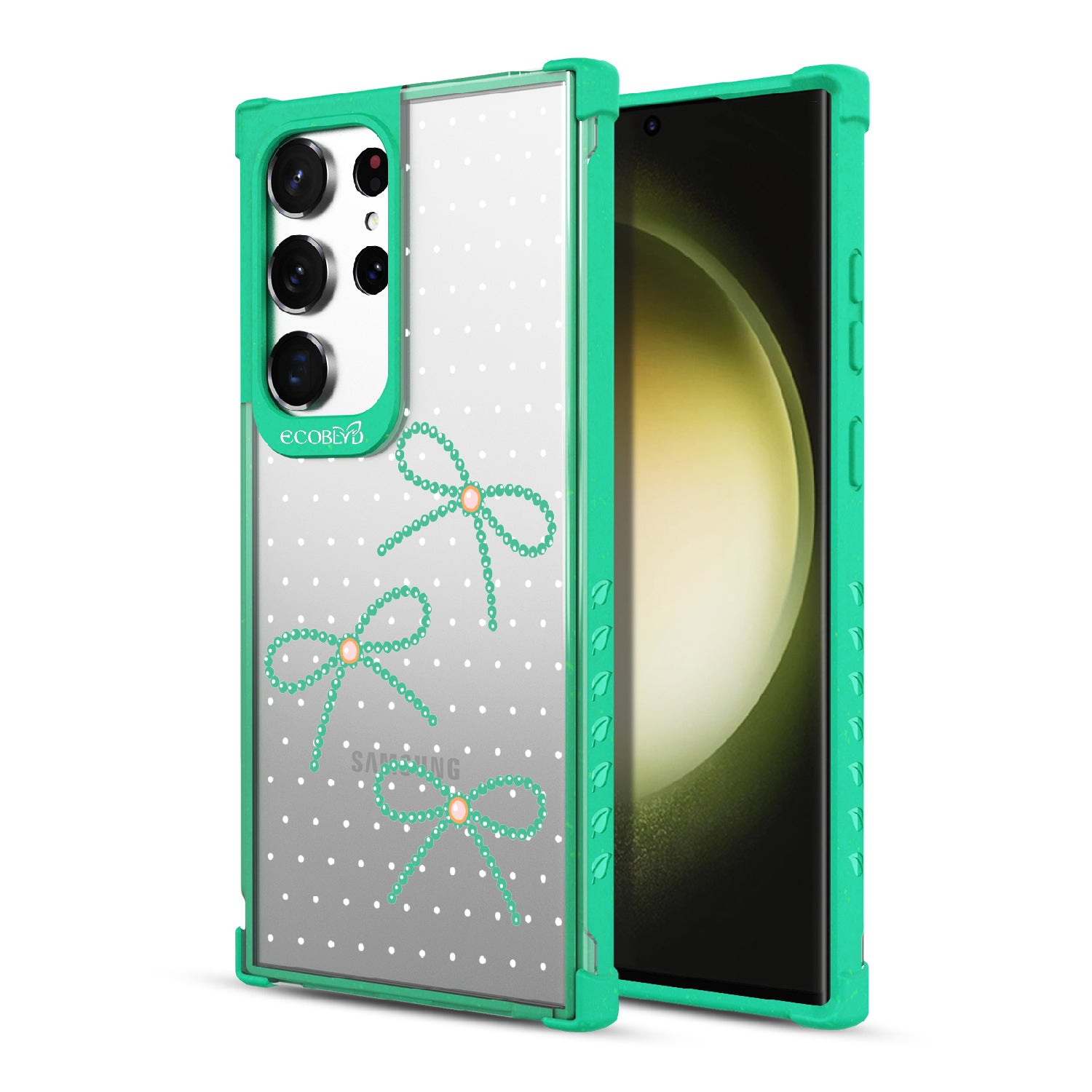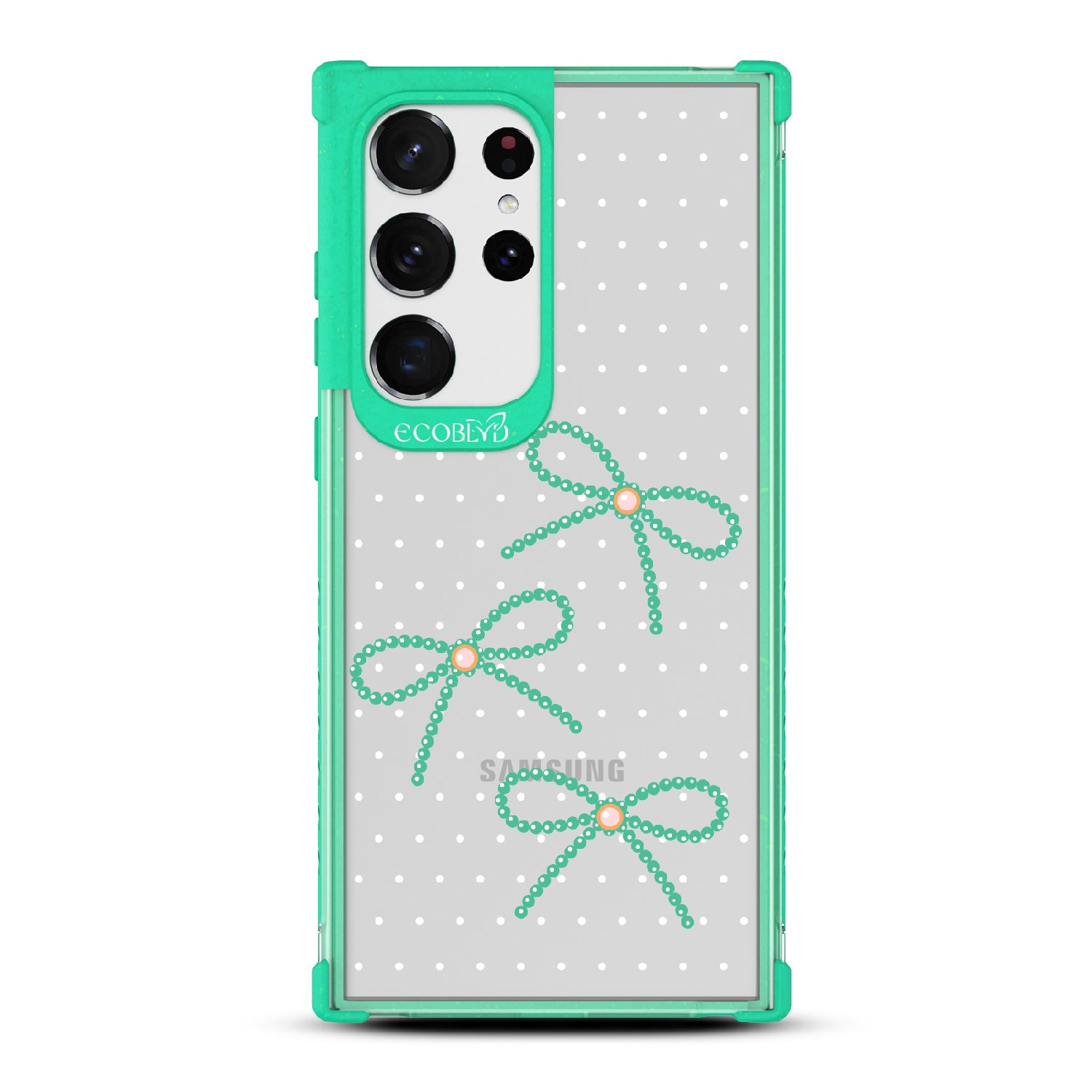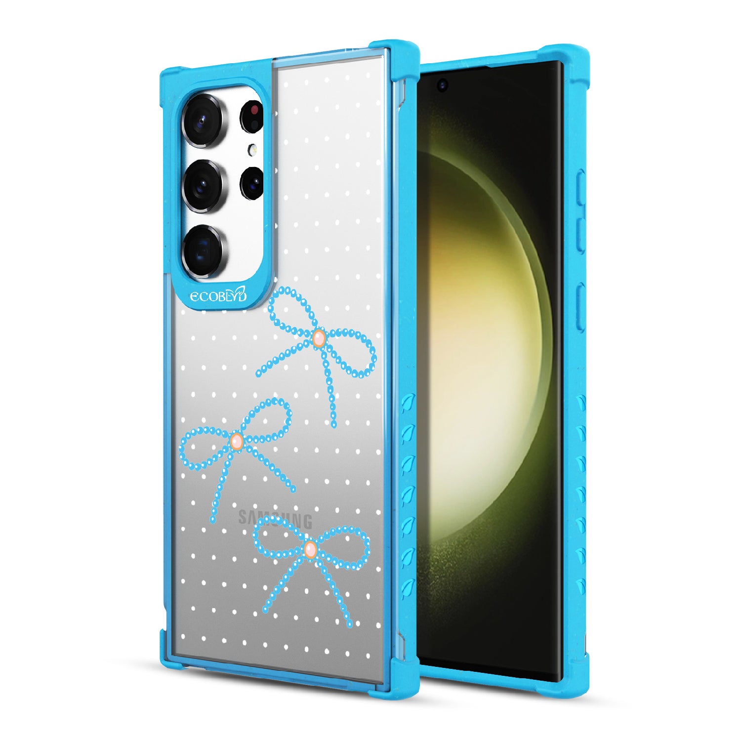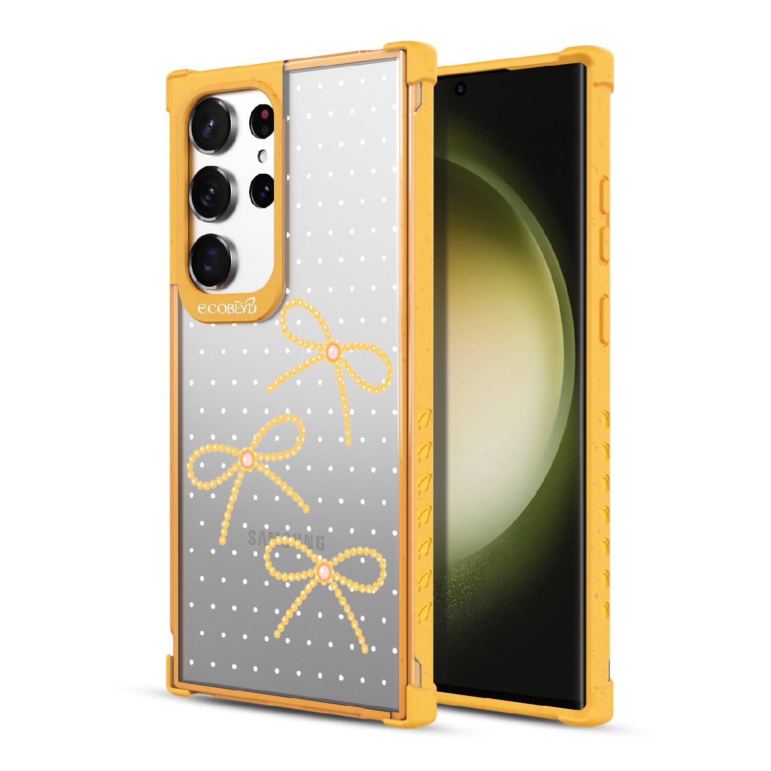 Galaxy S23 Ultra phone case brings big style in small doses. Featuring pearls tied into dainty bows, this design adds a sophisticated touch to your phone. Show off your love for the little things with this elegant look.