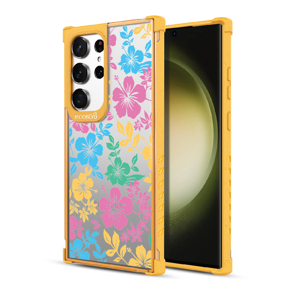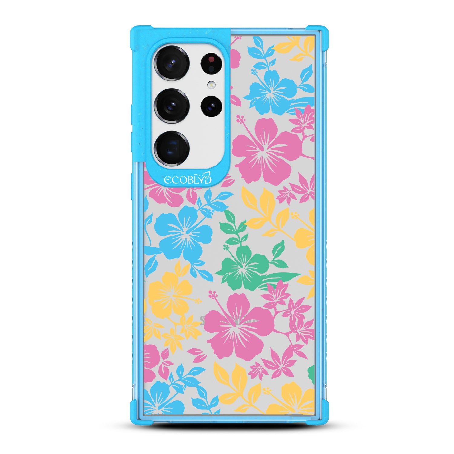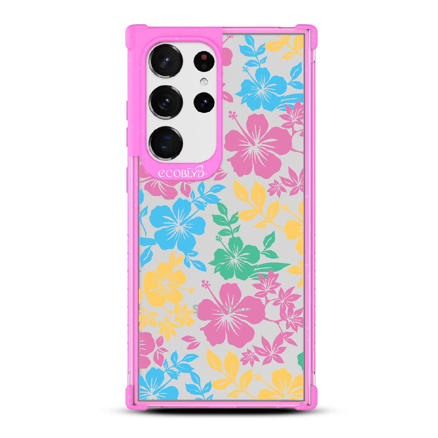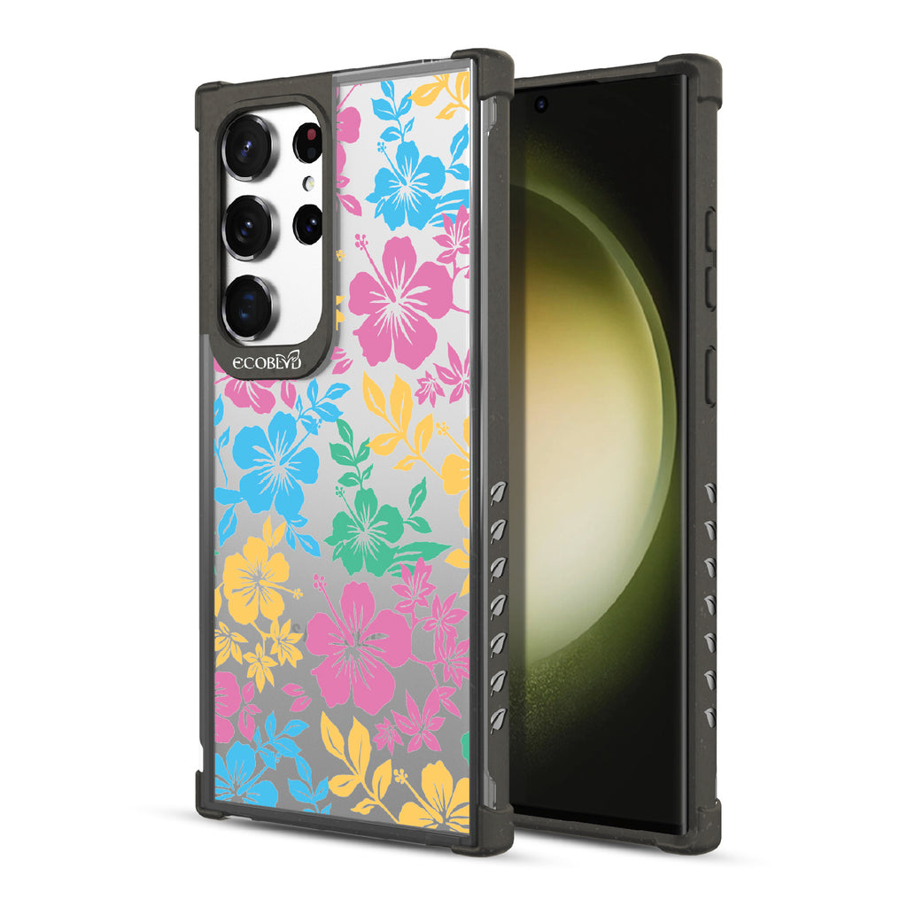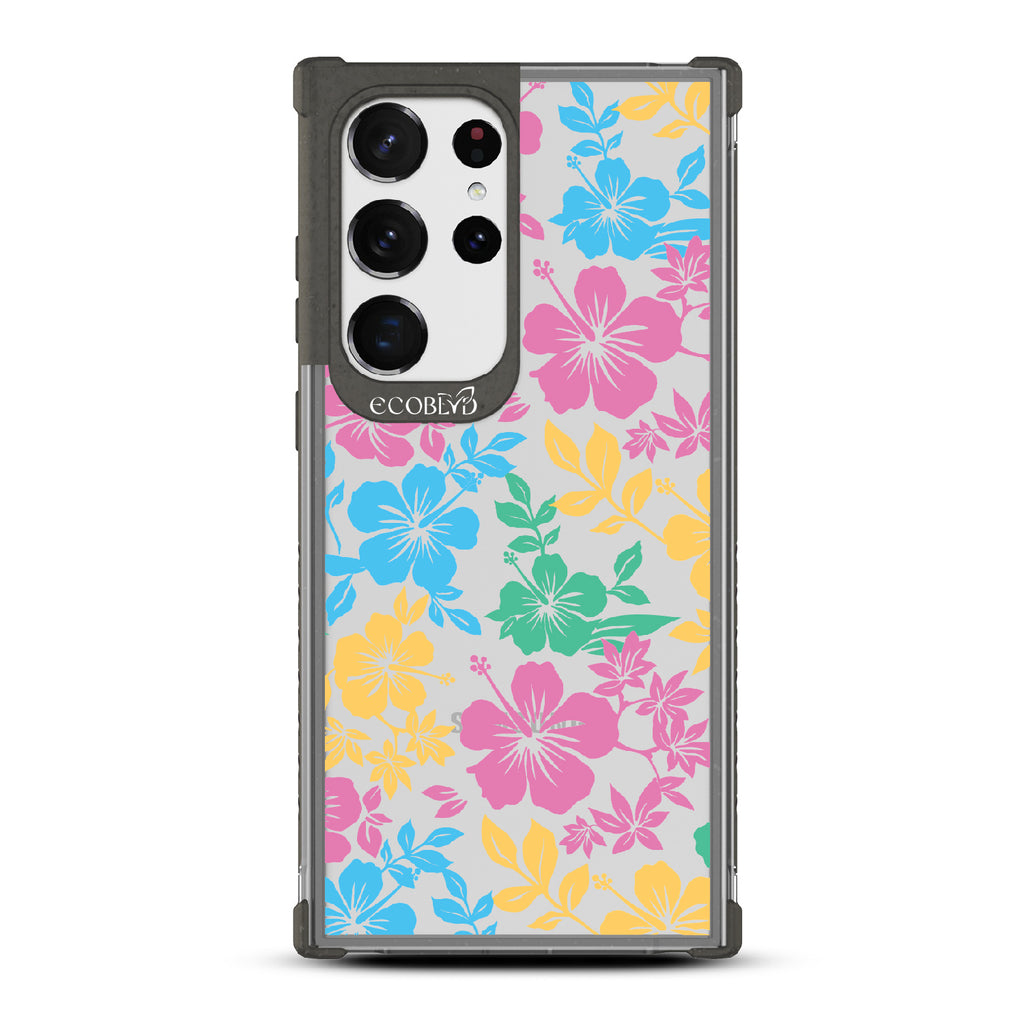 Experience the laid-back vibes of the tropics with our Lei'd Back design on our Laguna clear Galaxy S23 Ultra phone case, a colorful homage to the vibrant beauty of Hawaiian leis. his design showcases an array of tropical hibiscus flowers in yellow, pink, green, and blue, reminiscent of traditional lei arrangements. Enjoy the relaxed lifestyle of an island as you escape to the spirit of aloha.