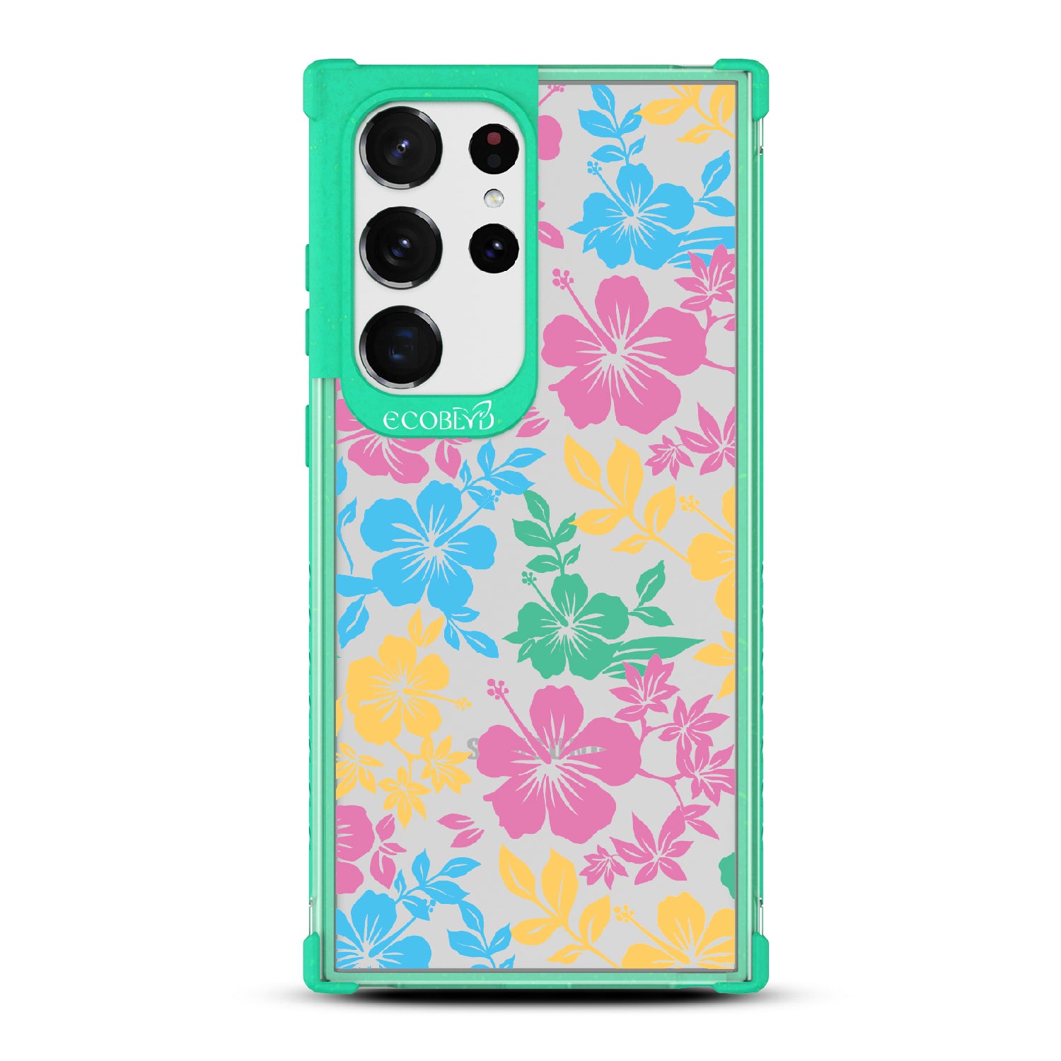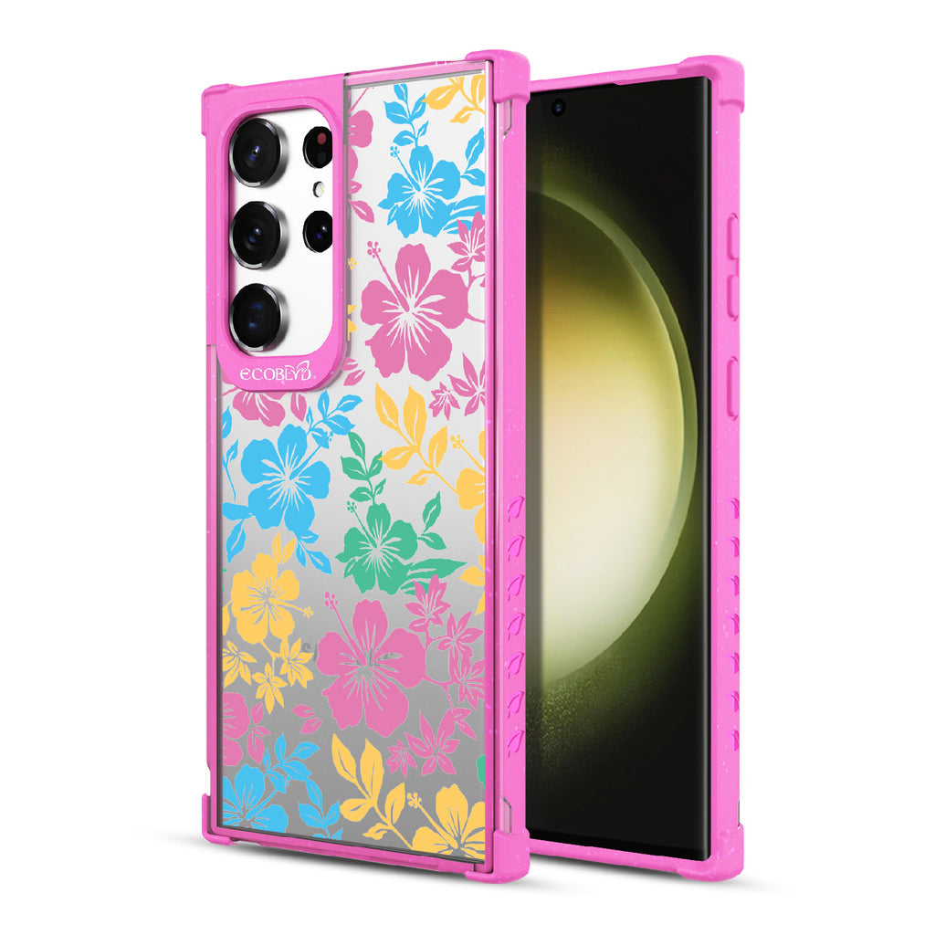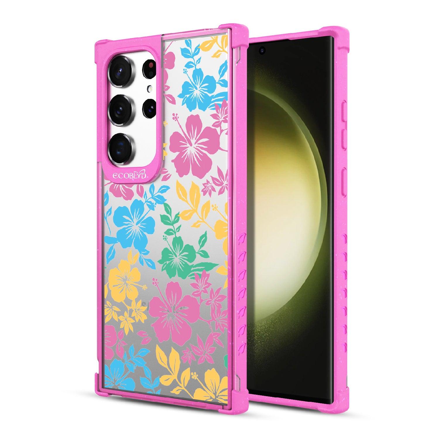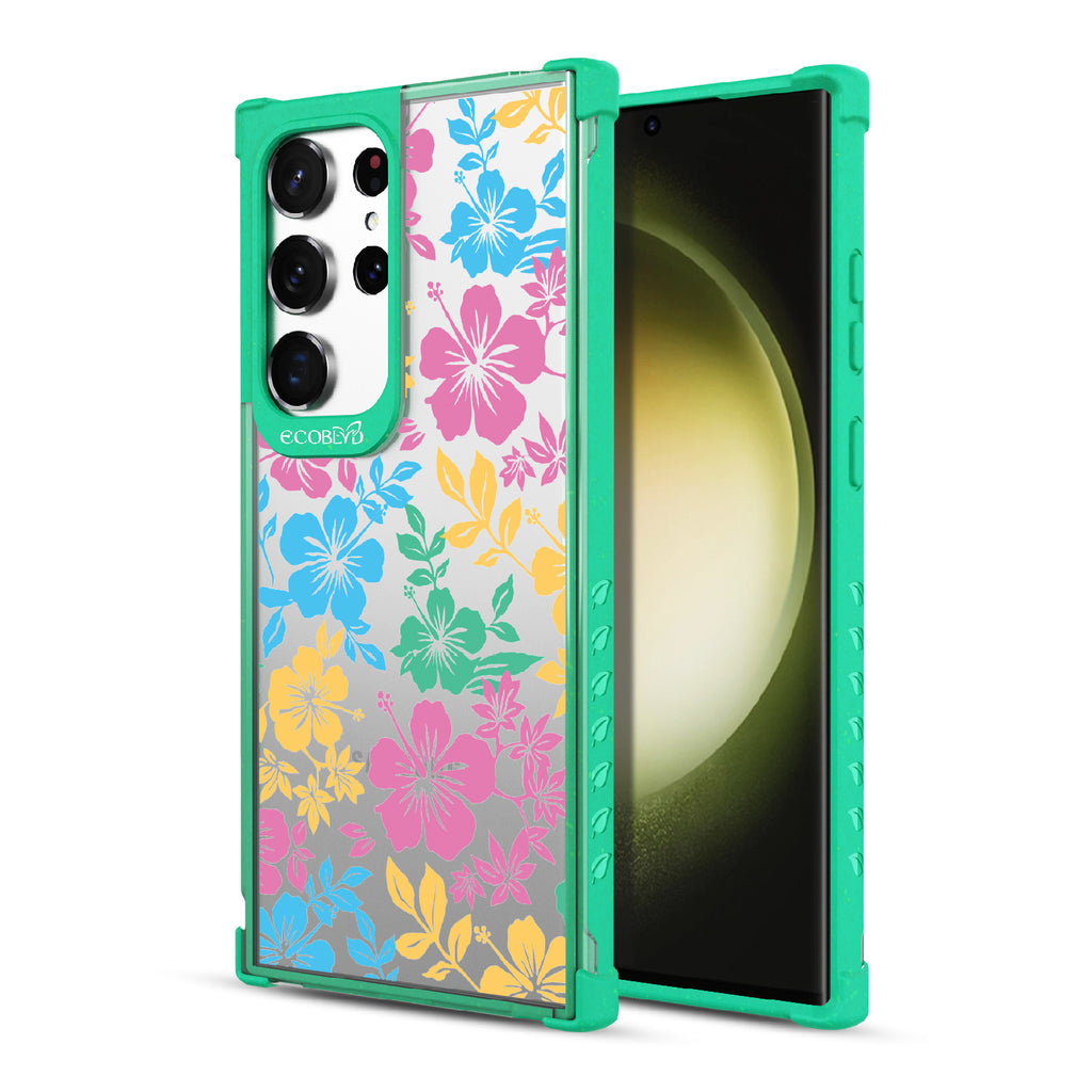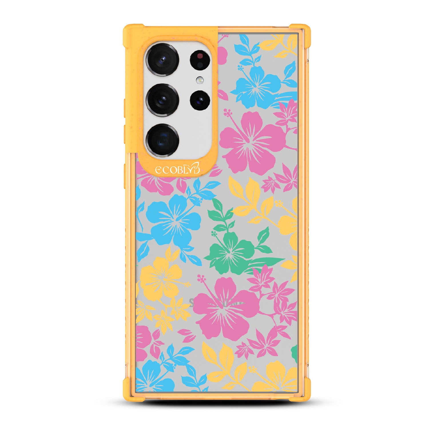 Experience the laid-back vibes of the tropics with our Lei'd Back design on our Laguna clear Galaxy S23 Ultra phone case, a colorful homage to the vibrant beauty of Hawaiian leis. his design showcases an array of tropical hibiscus flowers in yellow, pink, green, and blue, reminiscent of traditional lei arrangements. Enjoy the relaxed lifestyle of an island as you escape to the spirit of aloha.
