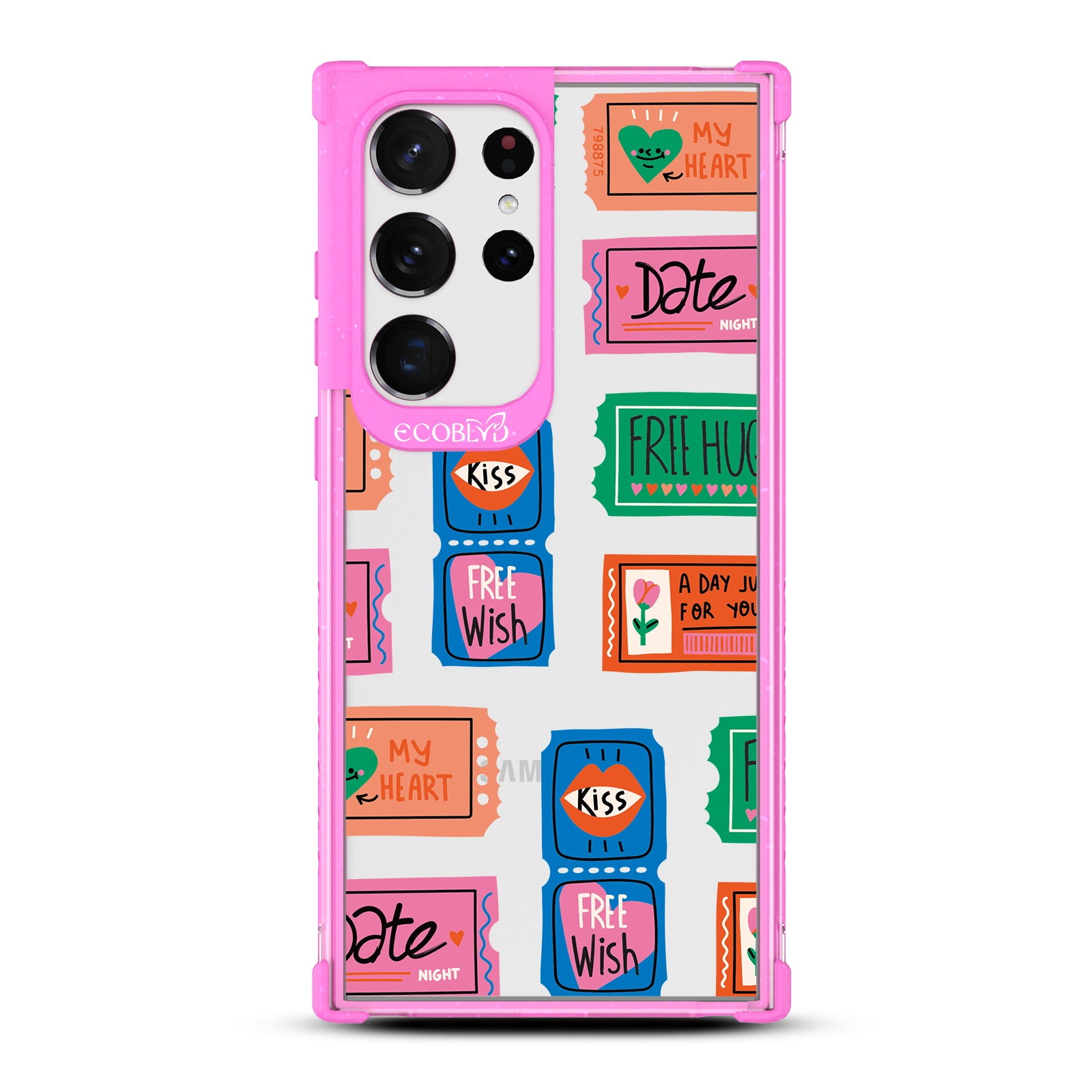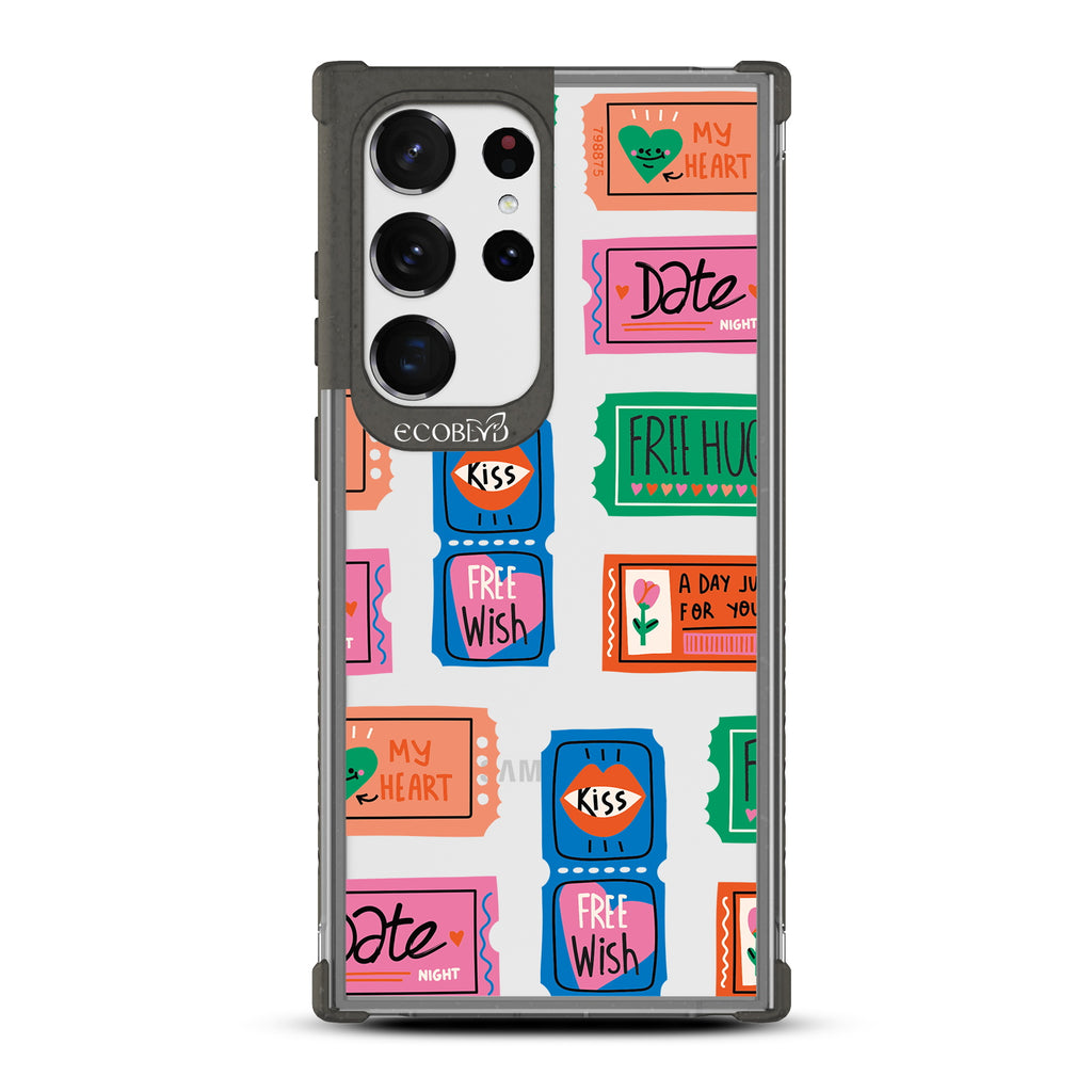 The Love Coupons design on our Laguna clear Galaxy S23 Ultra case will make every day feel like a celebration with its playful vouchers that you can use for free hugs, date nights, kisses, and wishes from your special someone wherever and whenever you want and in five fun colorways: Midnight Black, Cascade Blue, Foliage Green, Illuminating Yellow, and Wildflower Pink.