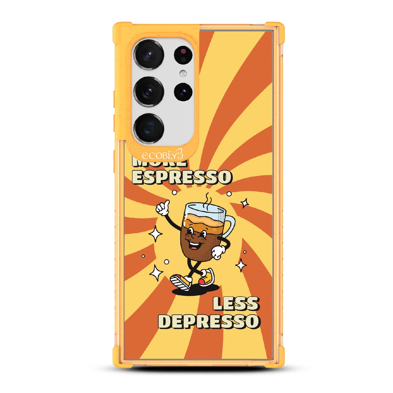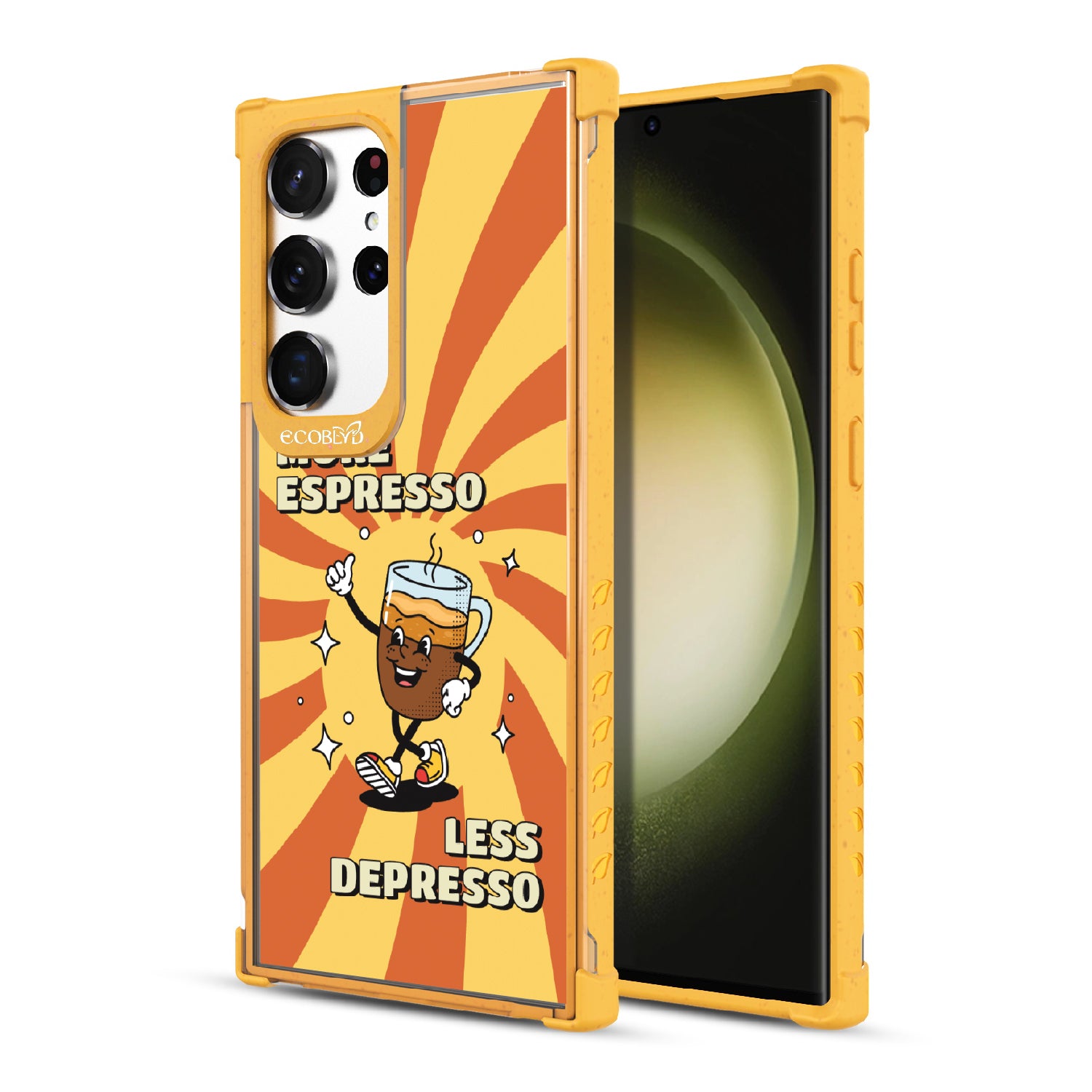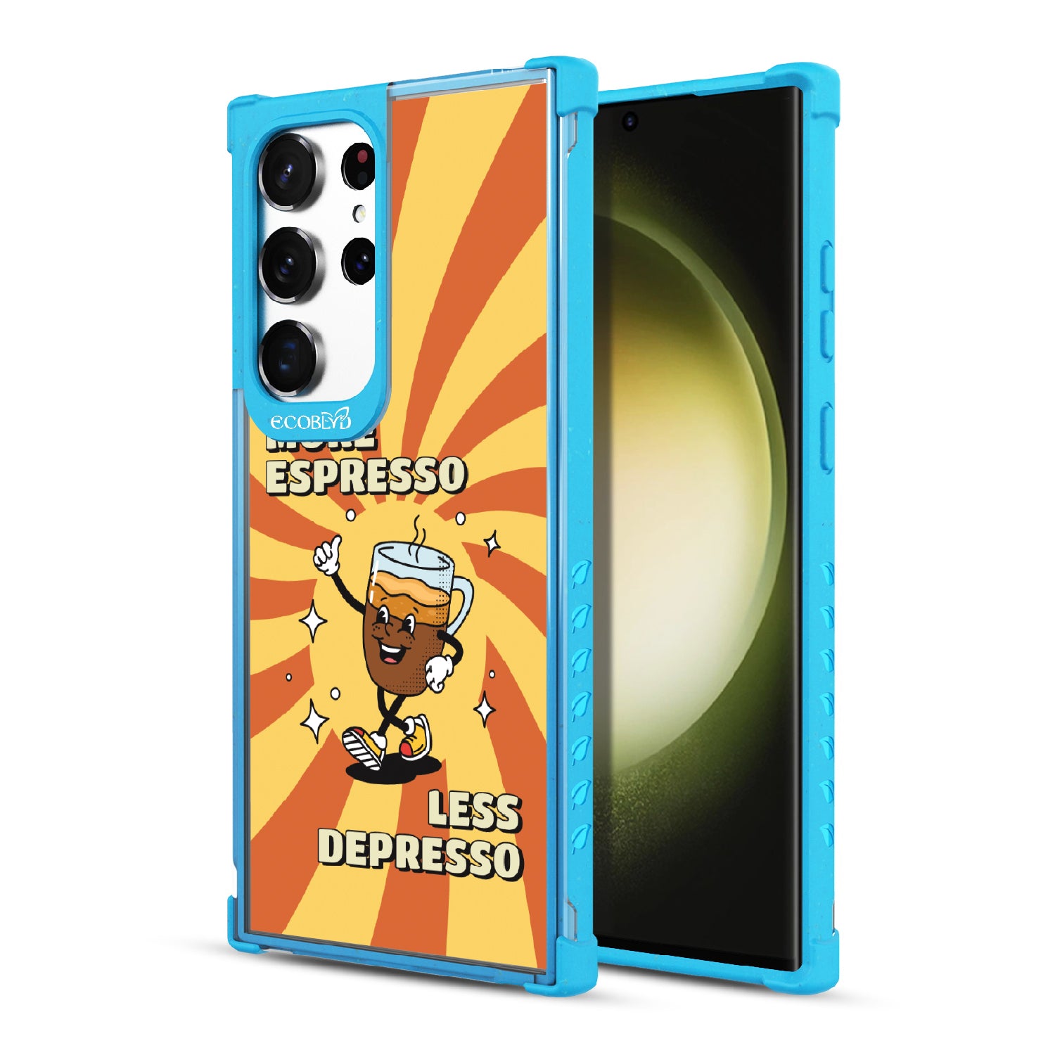 "More espresso, less depresso”—it’s that simple. A cheerful coffee mug and your new daily mantra bring good vibes to life with this playful design on our Laguna clear Galaxy S23 Ultra case. Brew positivity and energy into every moment with a look that’s as bold as your first cup.