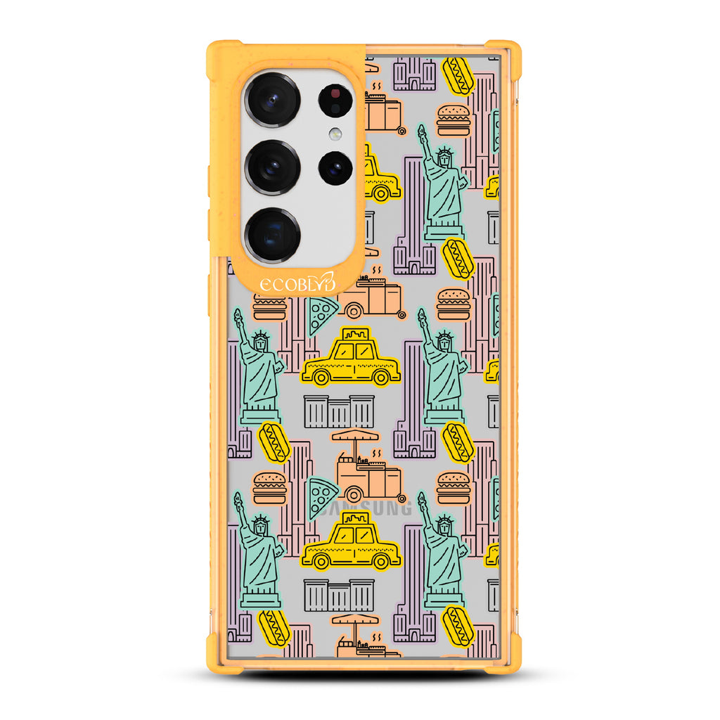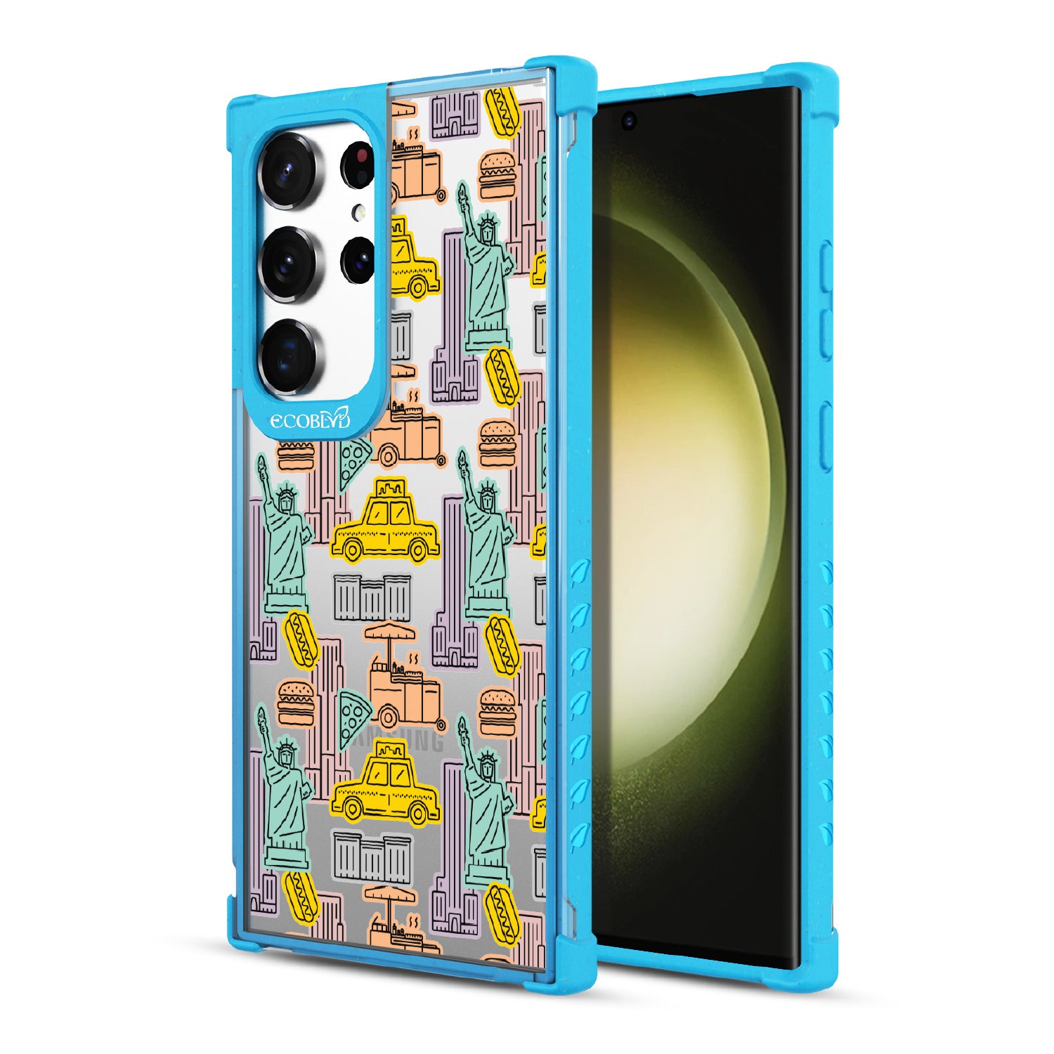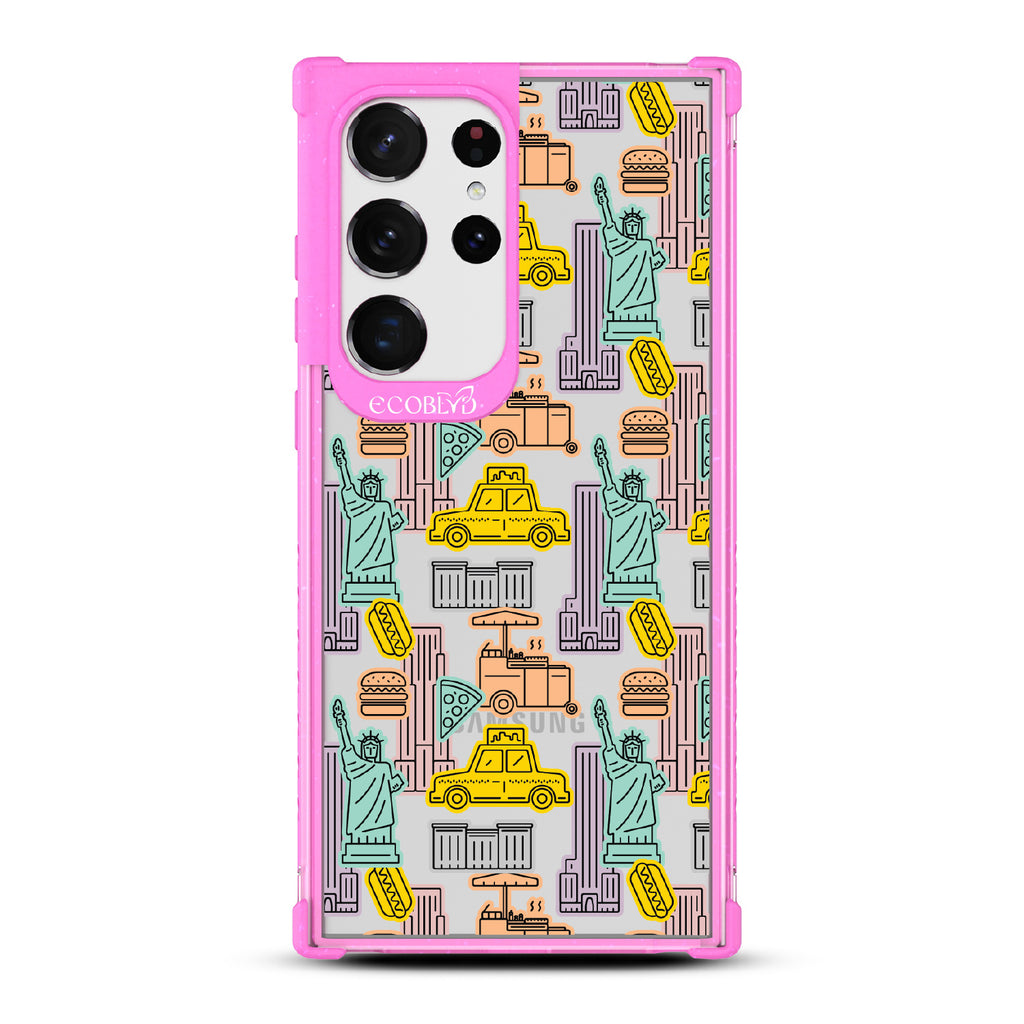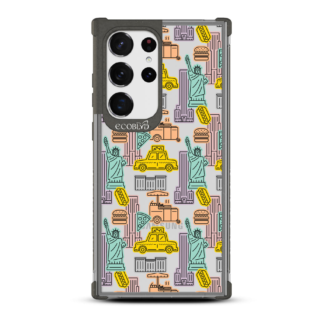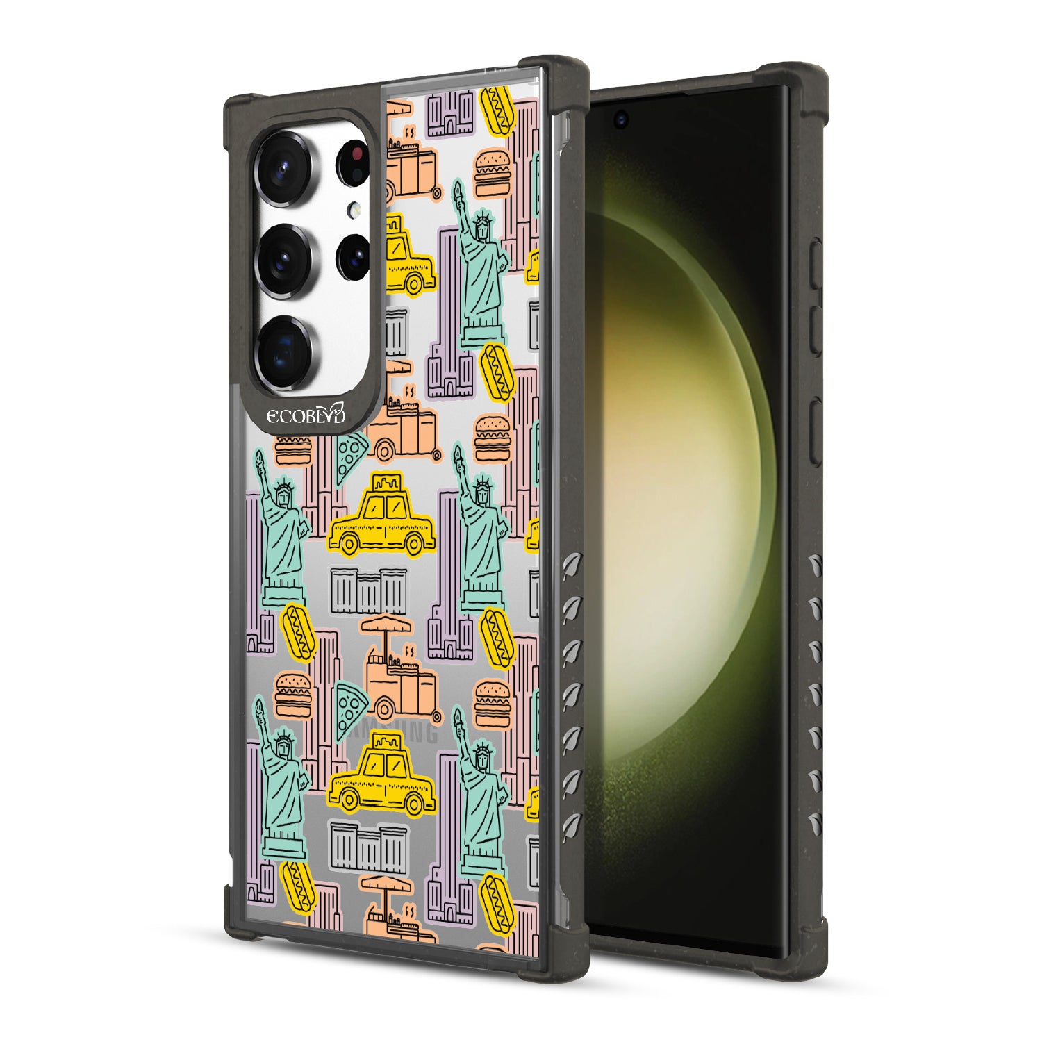 Capture the buzz of the city that never sleeps with the New York Minute design on our Laguna clear Galaxy S23 Ultra phone case. It's a slice of the Big Apple, with iconic yellow cabs, steaming hotdogs, and Lady Liberty herself, all wrapped up in that unmistakable NYC rhythm.