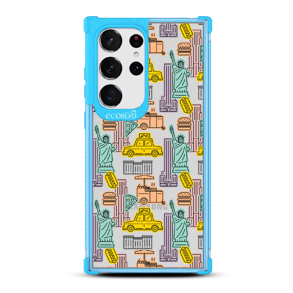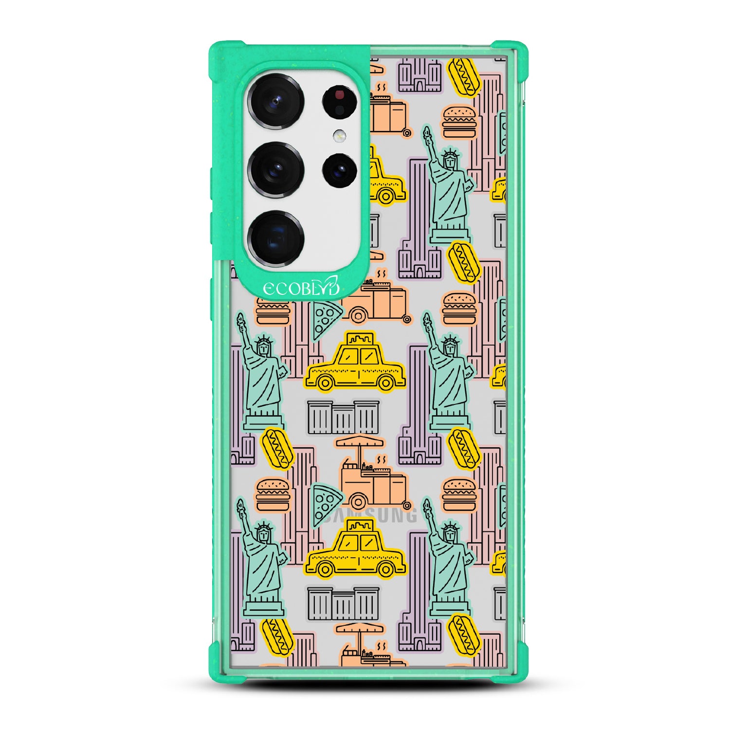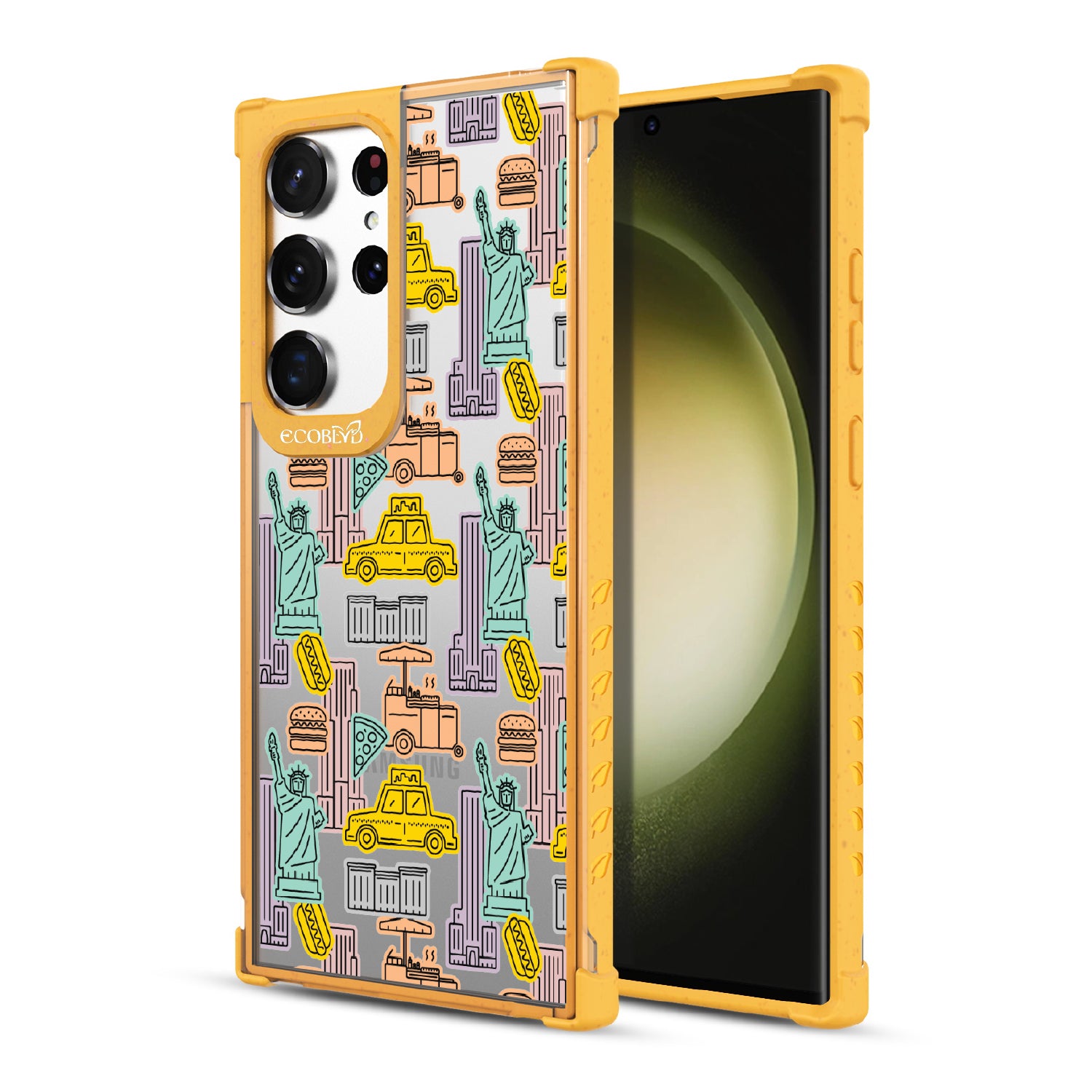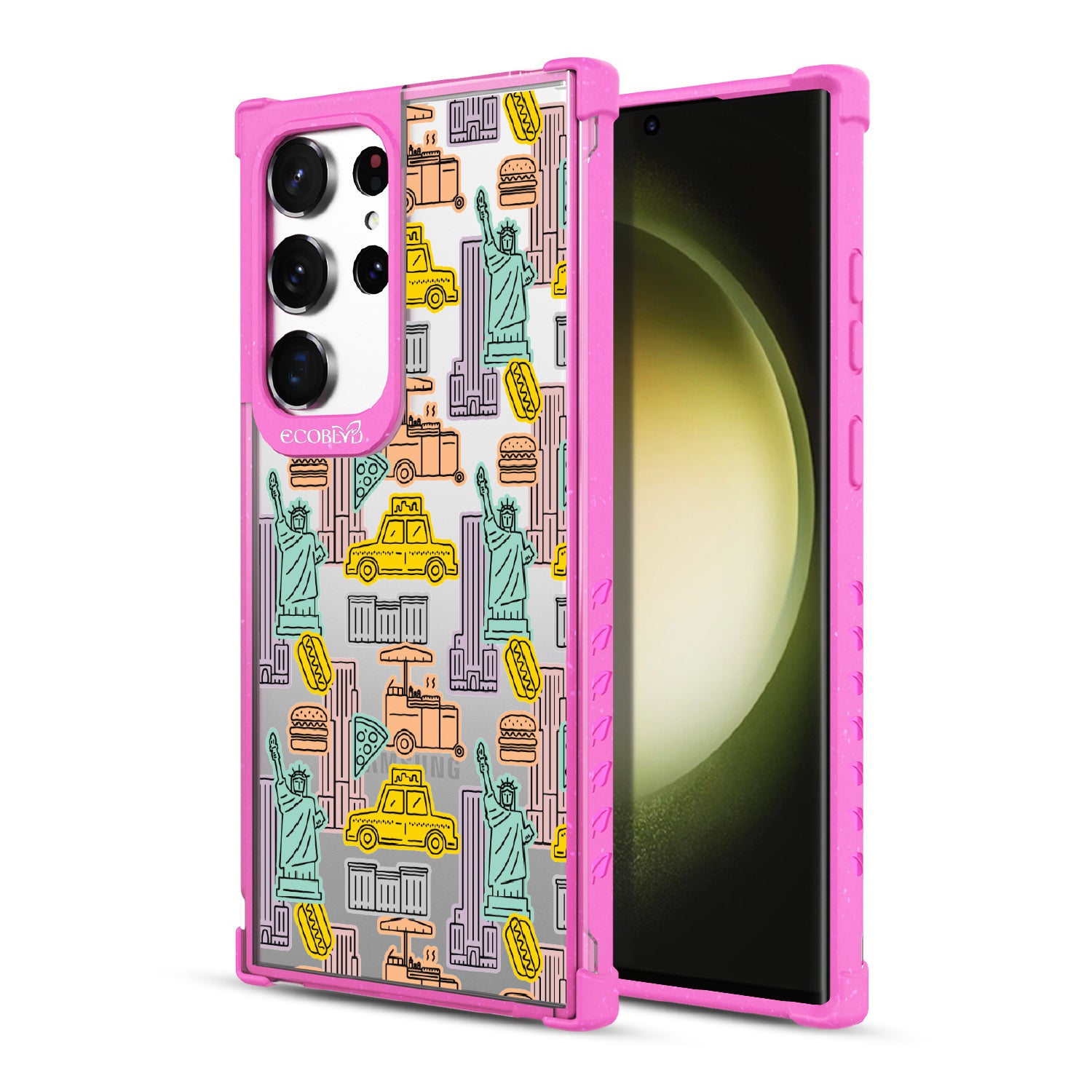 Capture the buzz of the city that never sleeps with the New York Minute design on our Laguna clear Galaxy S23 Ultra phone case. It's a slice of the Big Apple, with iconic yellow cabs, steaming hotdogs, and Lady Liberty herself, all wrapped up in that unmistakable NYC rhythm.