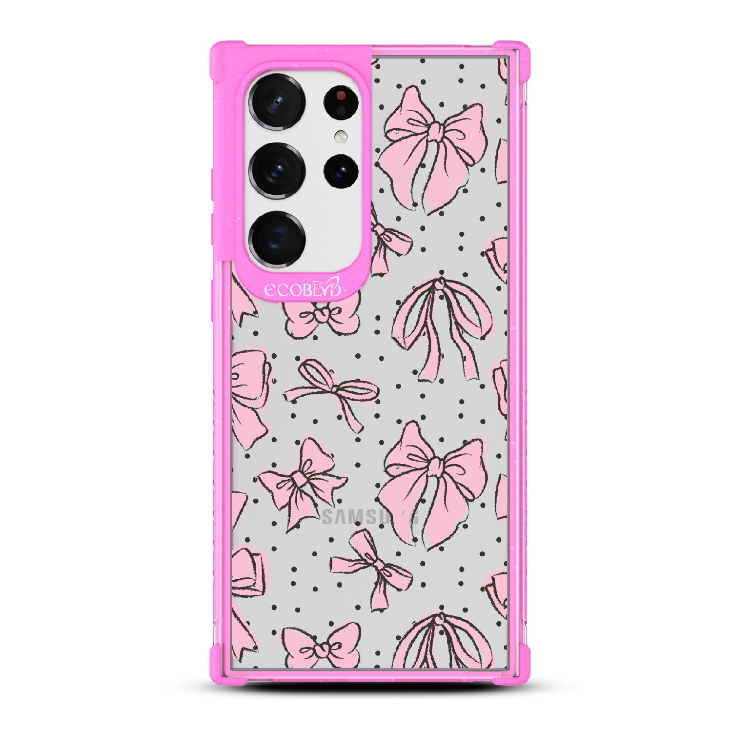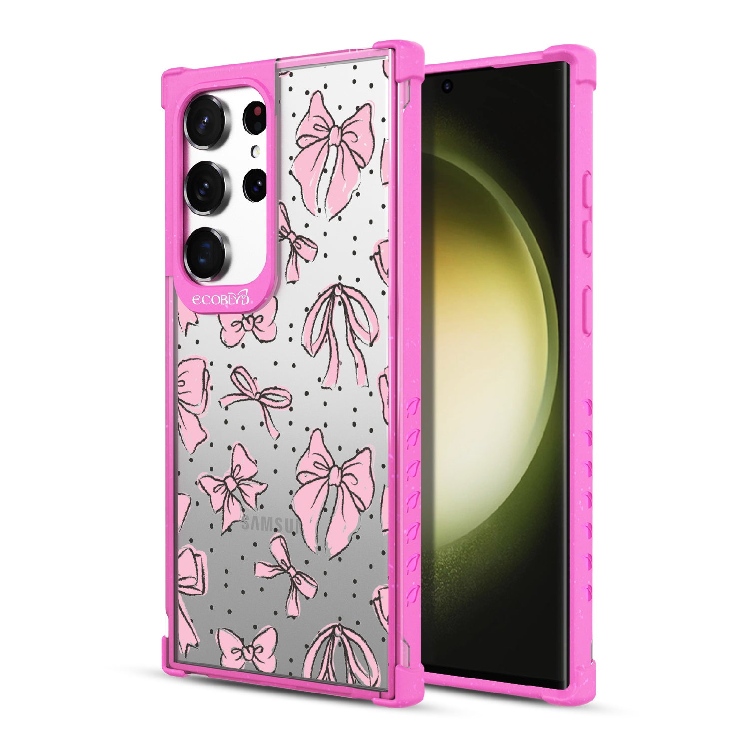 Enter your Soft Girl Era with this bow-tiful design on our Laguna clear Galaxy S23 Ultra case, where coquette pink bows and black polka dots team up to give your device a dose of girly glam. Surround yourself with girl power, radiating kindness, love, and gentle energy. Let your phone be a reminder of the unbreakable ties that bind us together.