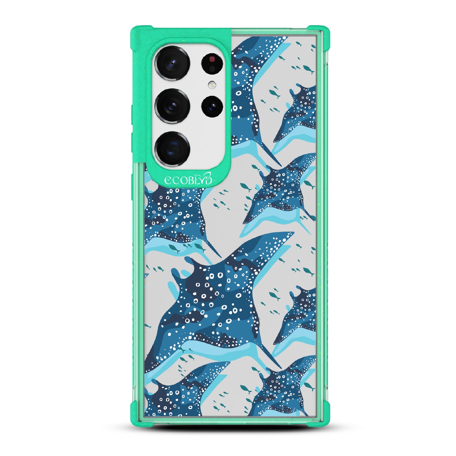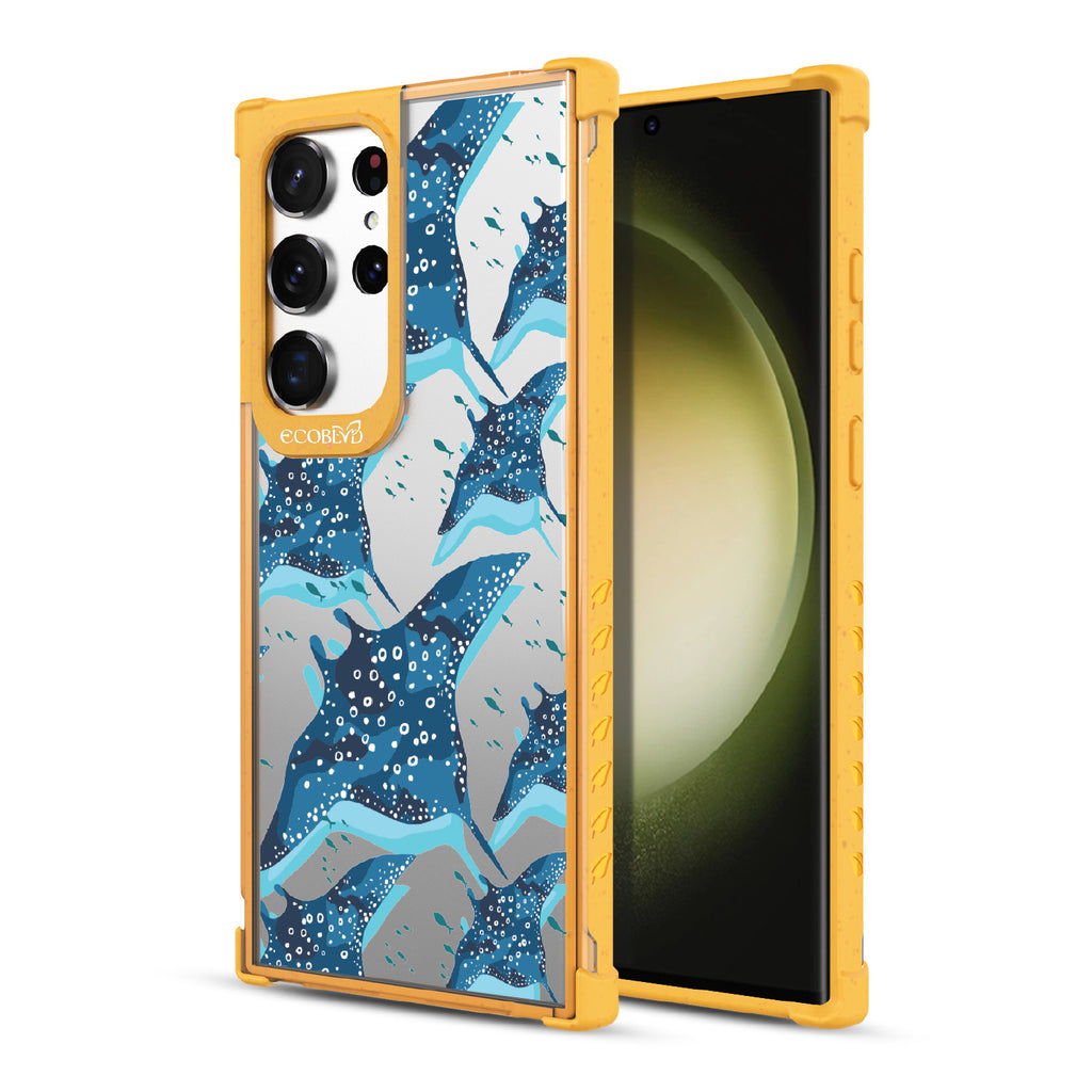 Sleek and stealthy, the Sting Ray design on our Laguna clear Galaxy S23 Ultra phone case showcases these marine marvels as they glide effortlessly through the ocean depths. The stingrays streamlined bodies and distinctive spotted patterns capture the fluid grace of the sea’s most agile navigators.