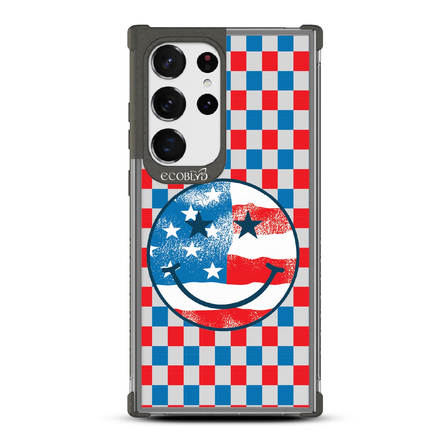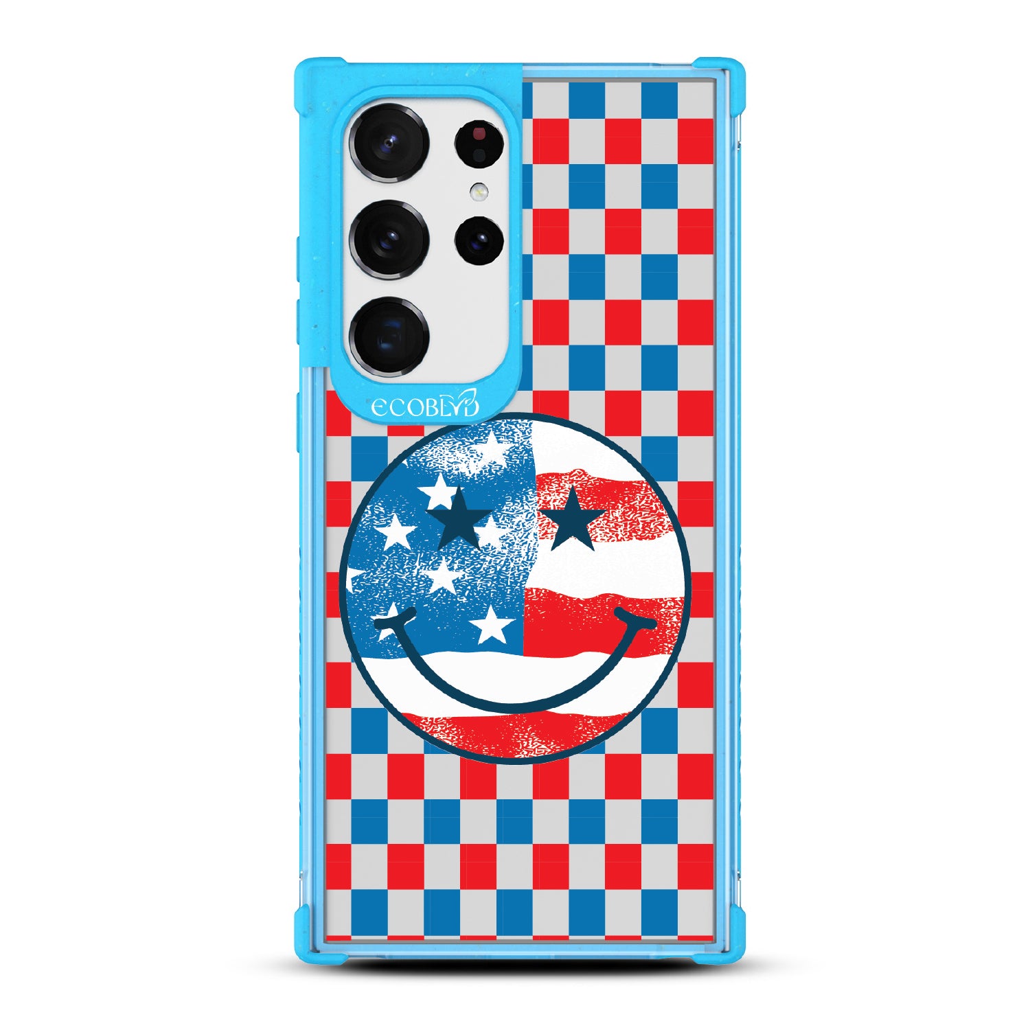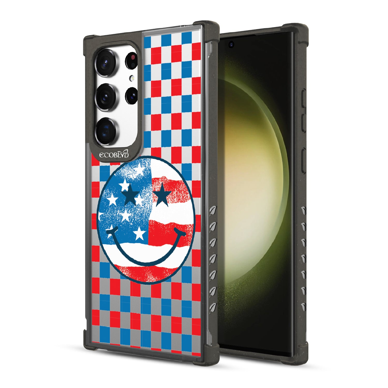 Rock your stars and stripes with The Anthem design on our Laguna clear Galaxy S23 Ultra phone case. The edgy red, white, and blue checker print and iconic smiley face embody the punk spirit of freedom. Turn up the volume and let your phone sing its anthem.