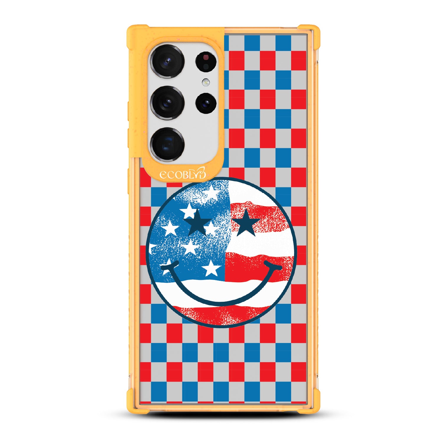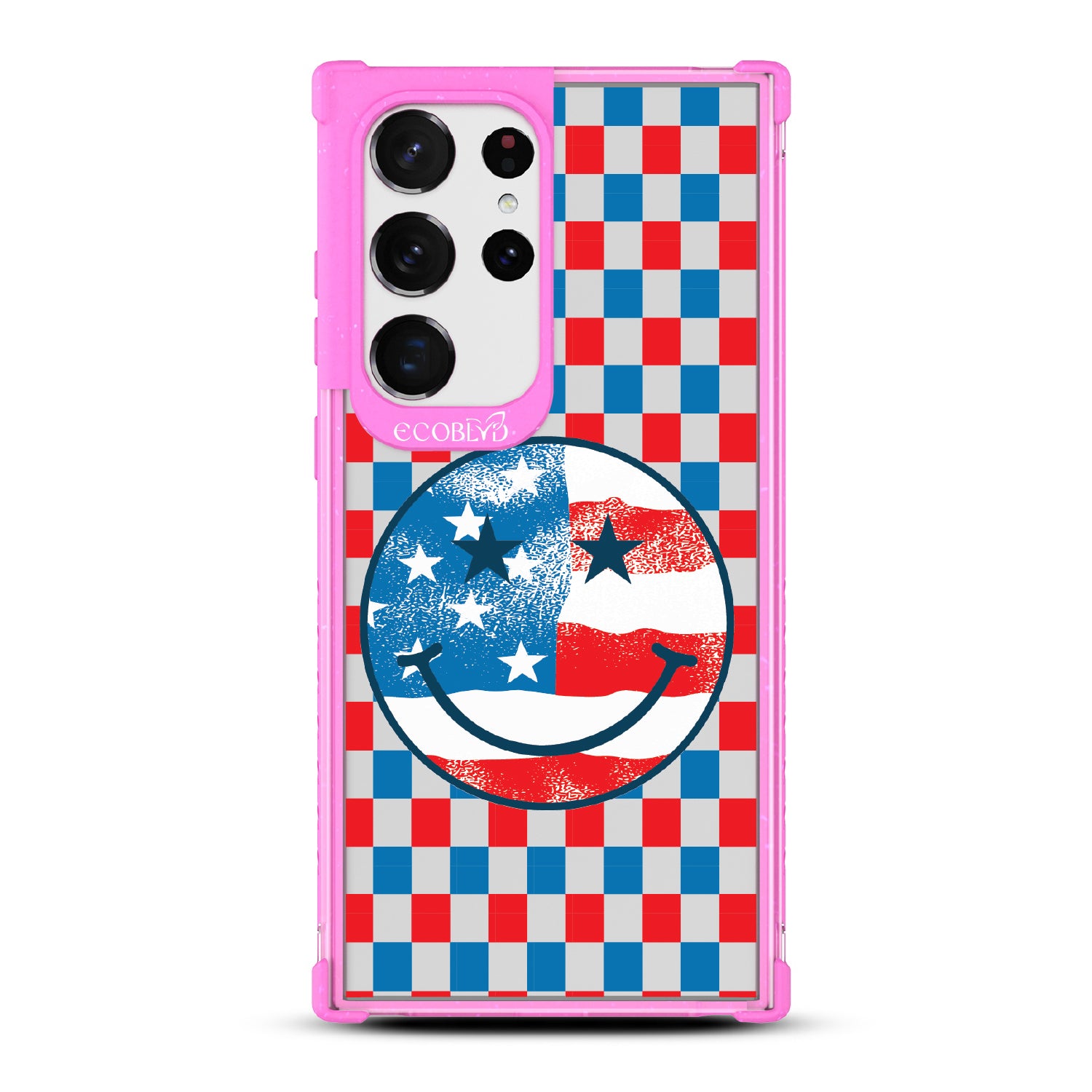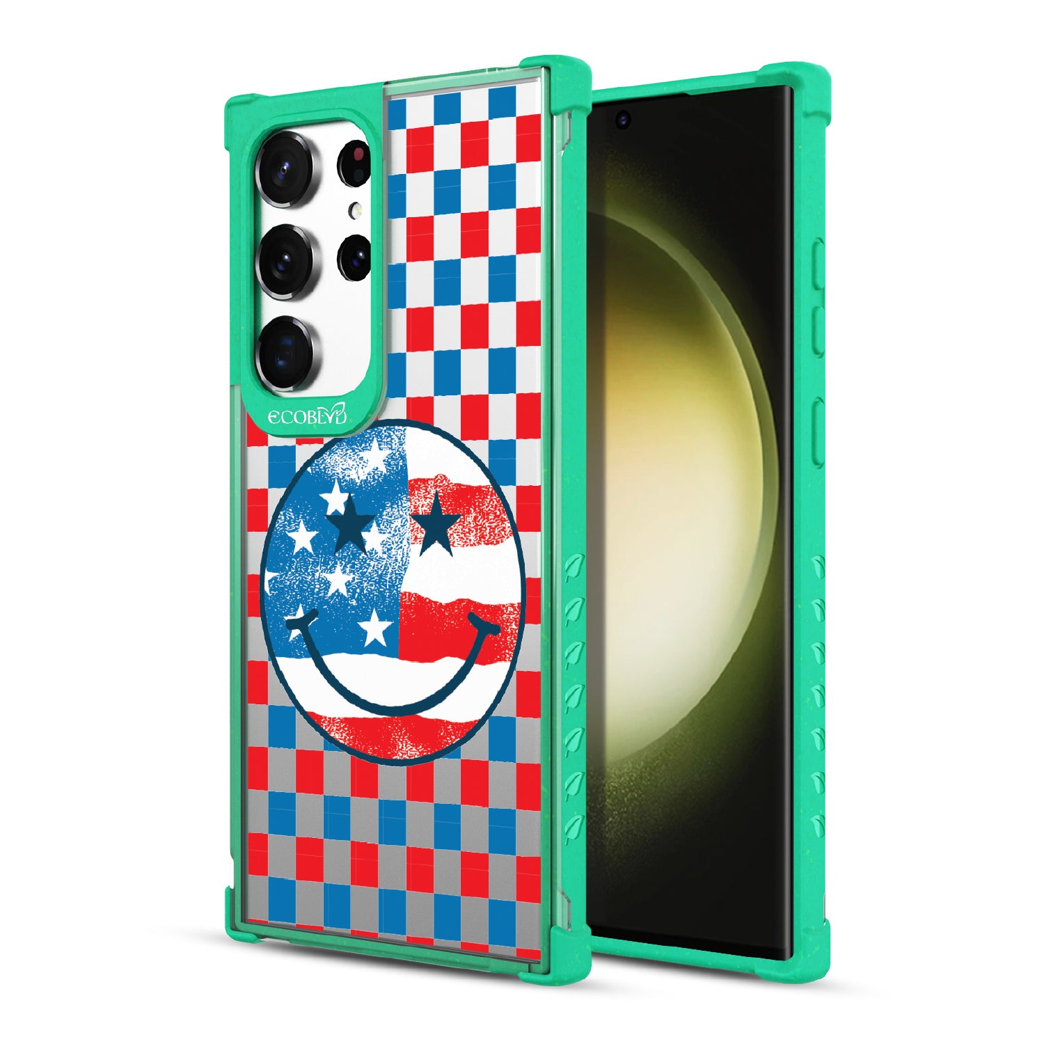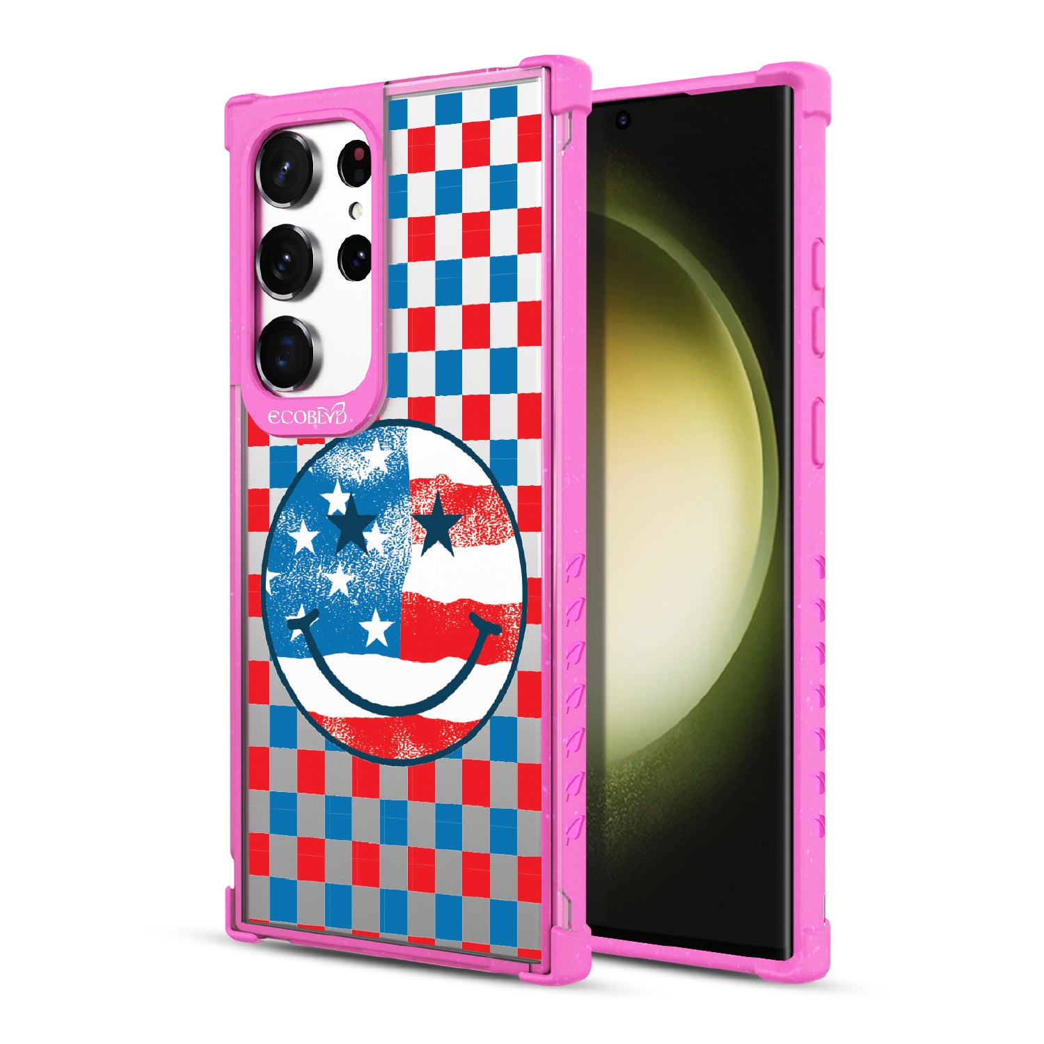Rock your stars and stripes with The Anthem design on our Laguna clear Galaxy S23 Ultra phone case. The edgy red, white, and blue checker print and iconic smiley face embody the punk spirit of freedom. Turn up the volume and let your phone sing its anthem.
