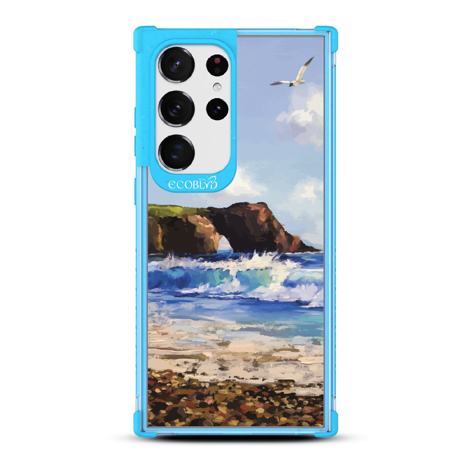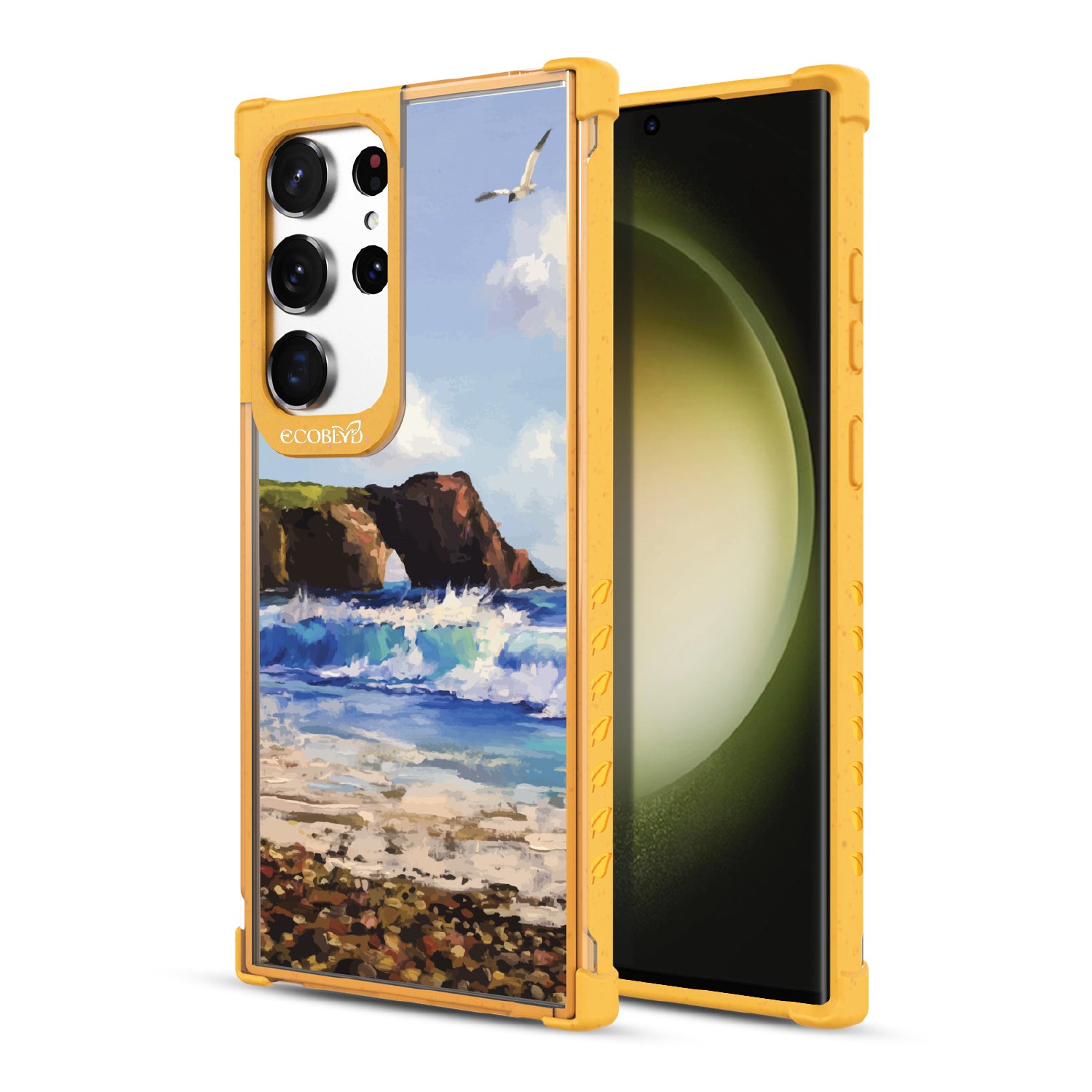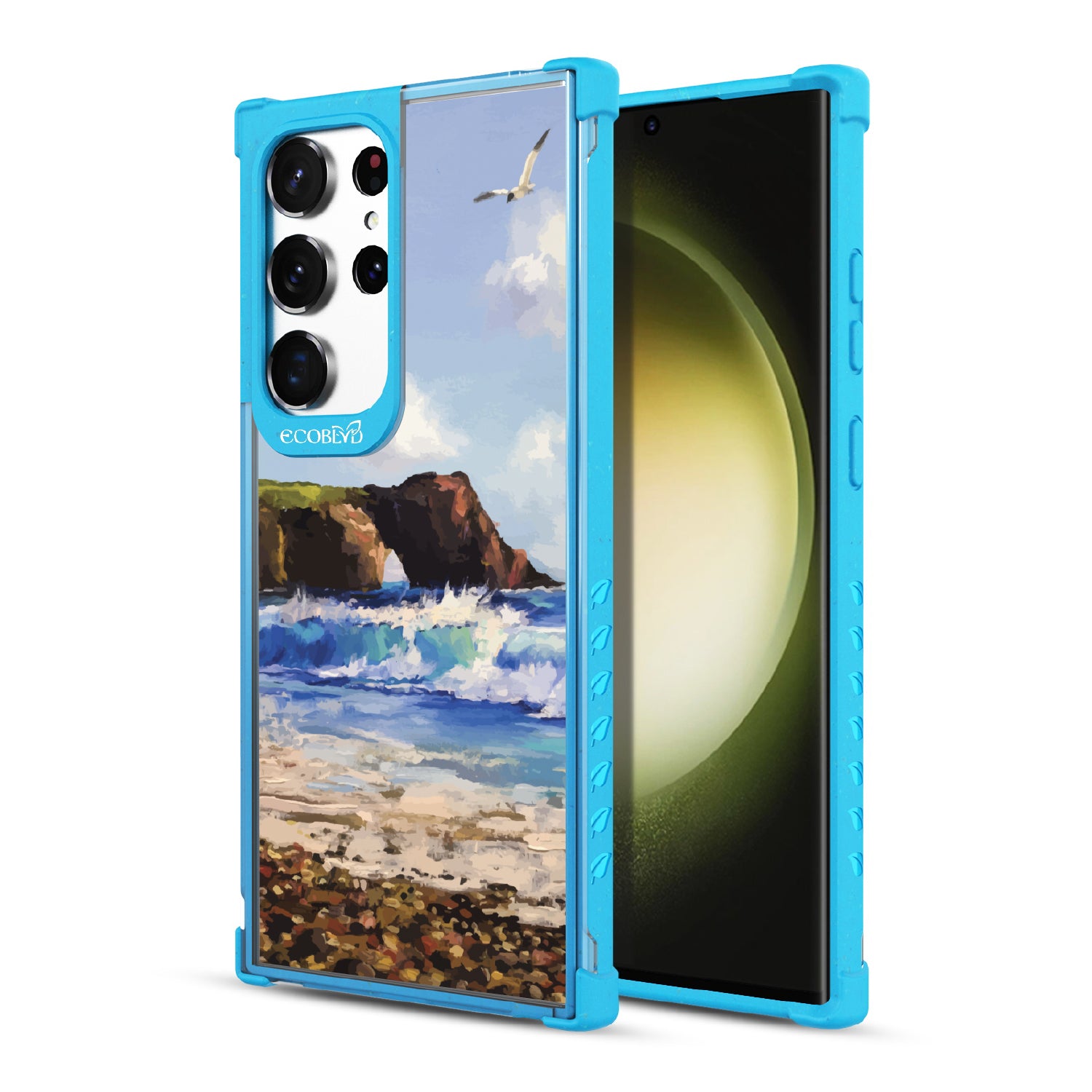 The calm before…. The Cliffhanger design on our Laguna clear Galaxy S23 Ultra case holds a moment of painted suspense—brushed cliffs, churning tides, and a palette that builds to the brink. A story captured at its turning point.