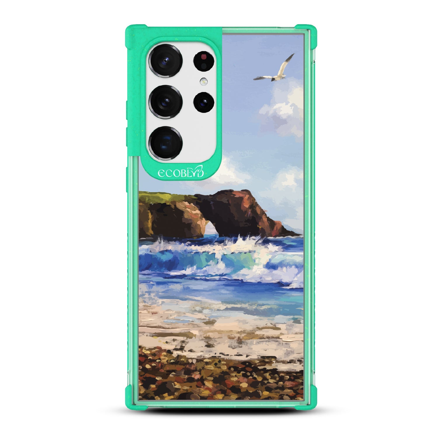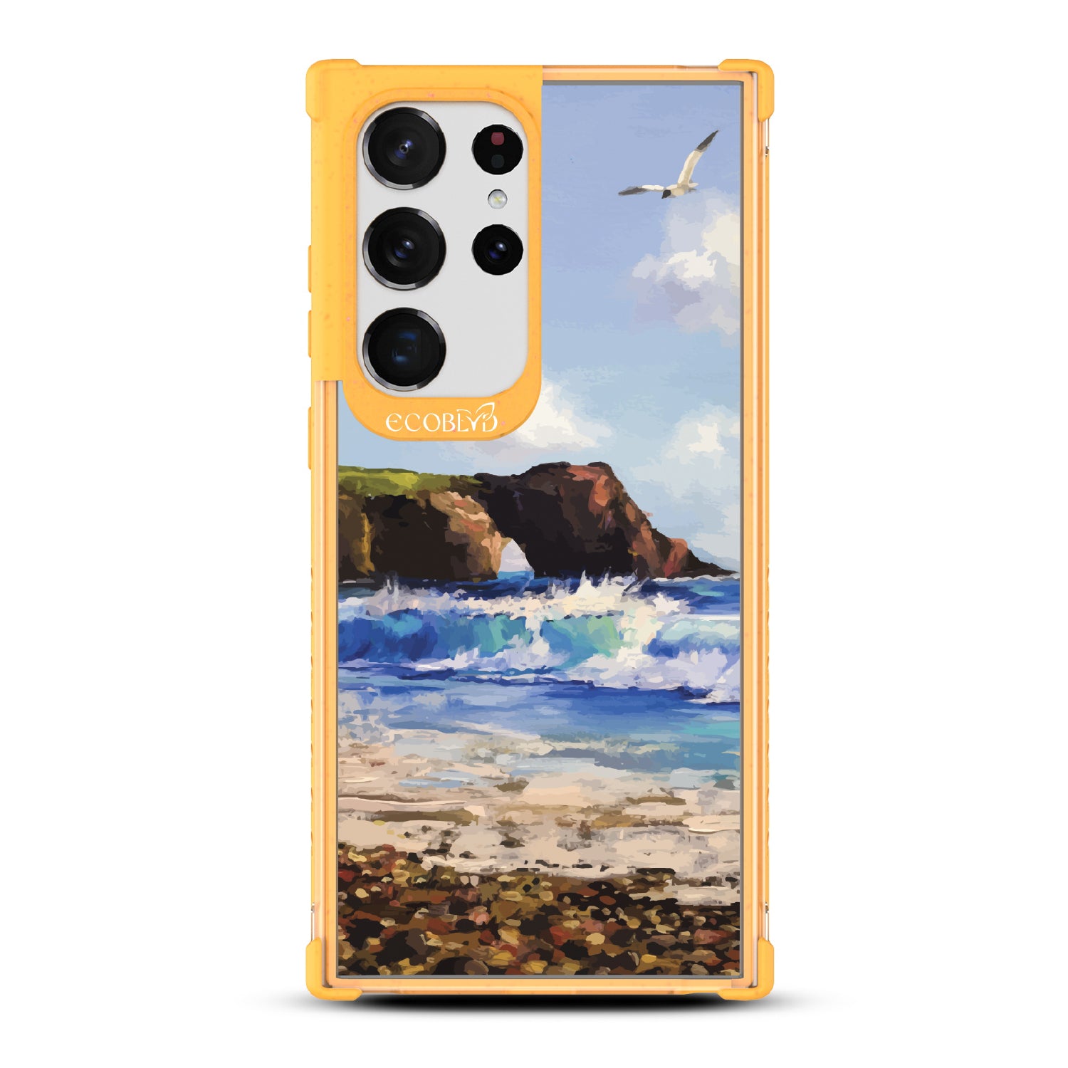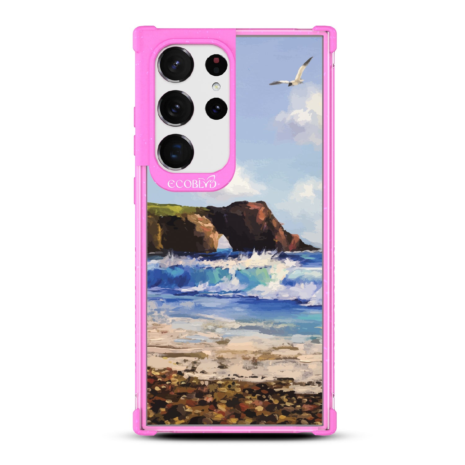 The calm before…. The Cliffhanger design on our Laguna clear Galaxy S23 Ultra case holds a moment of painted suspense—brushed cliffs, churning tides, and a palette that builds to the brink. A story captured at its turning point.