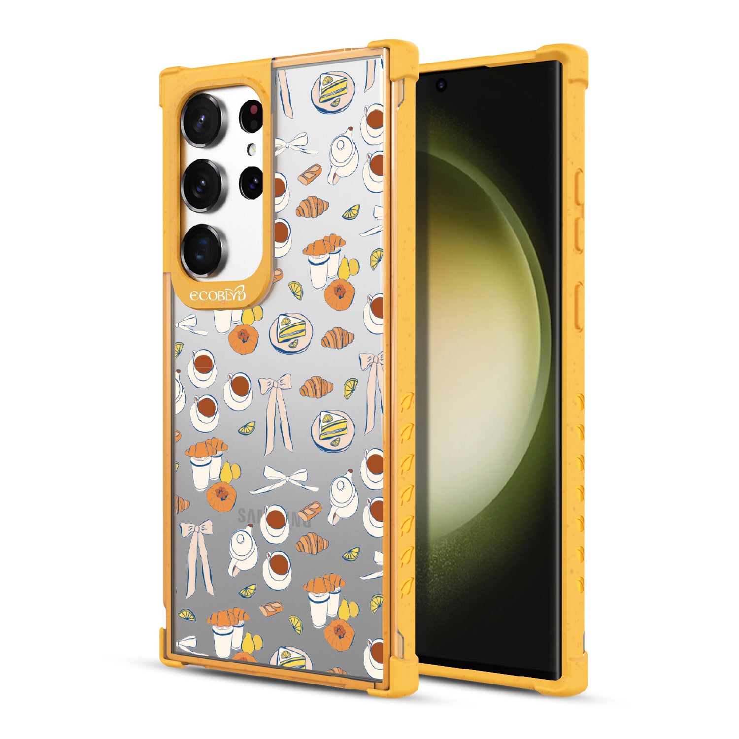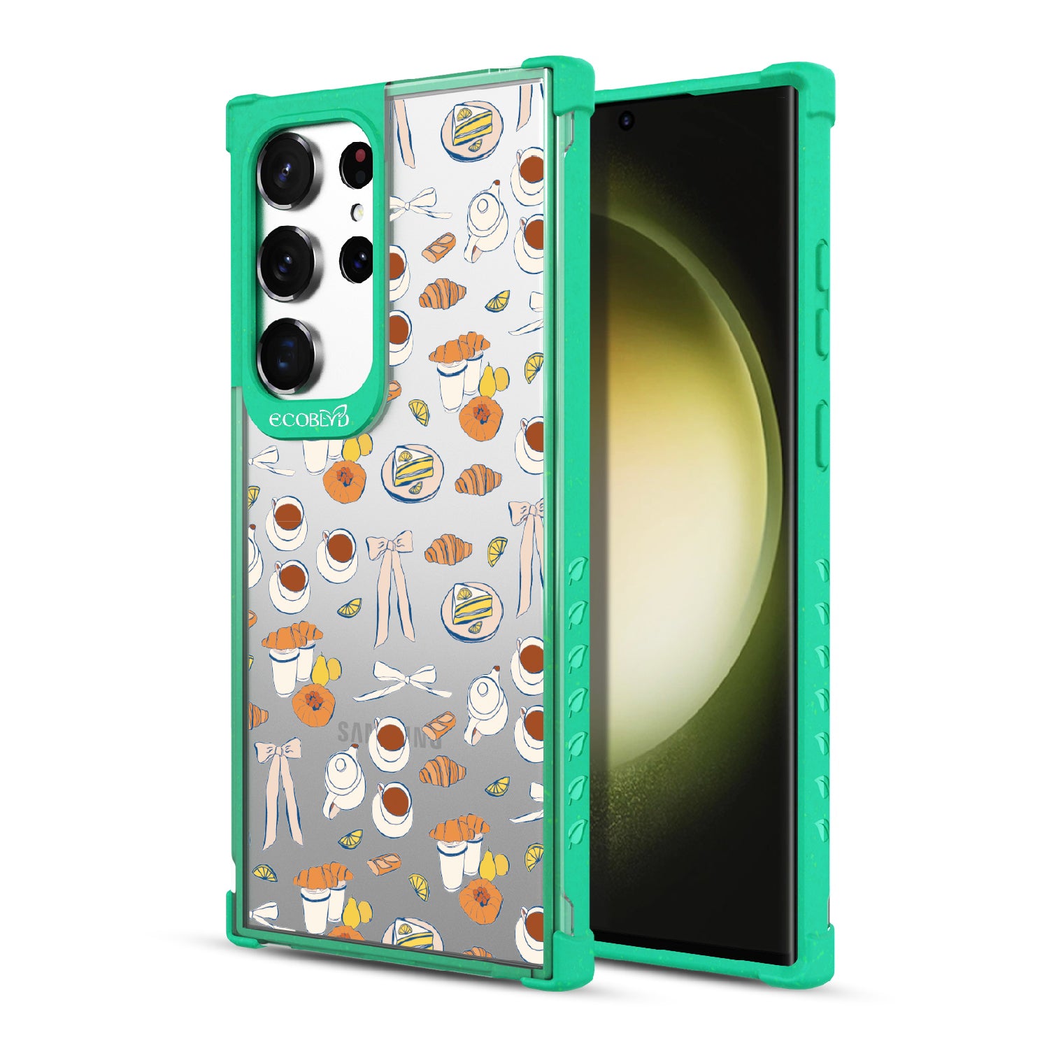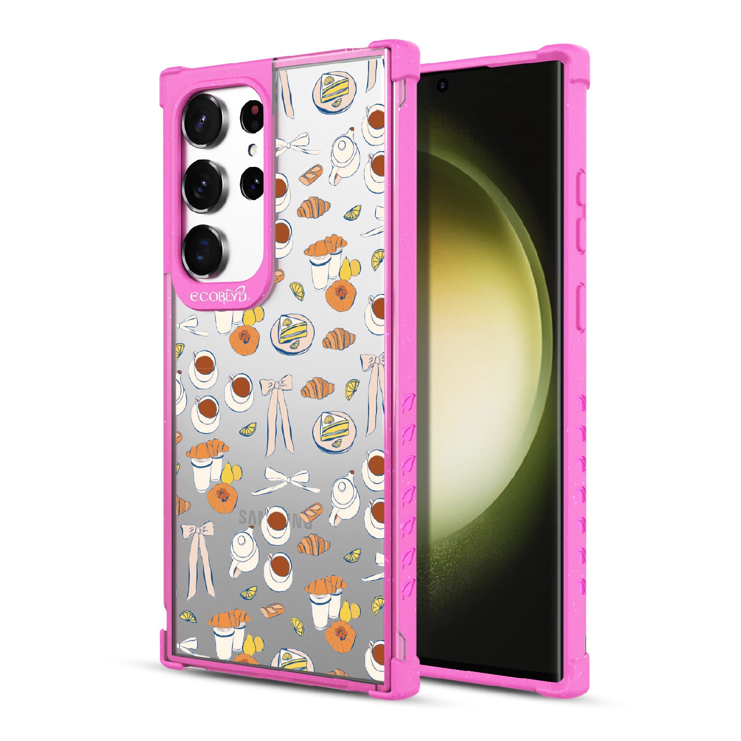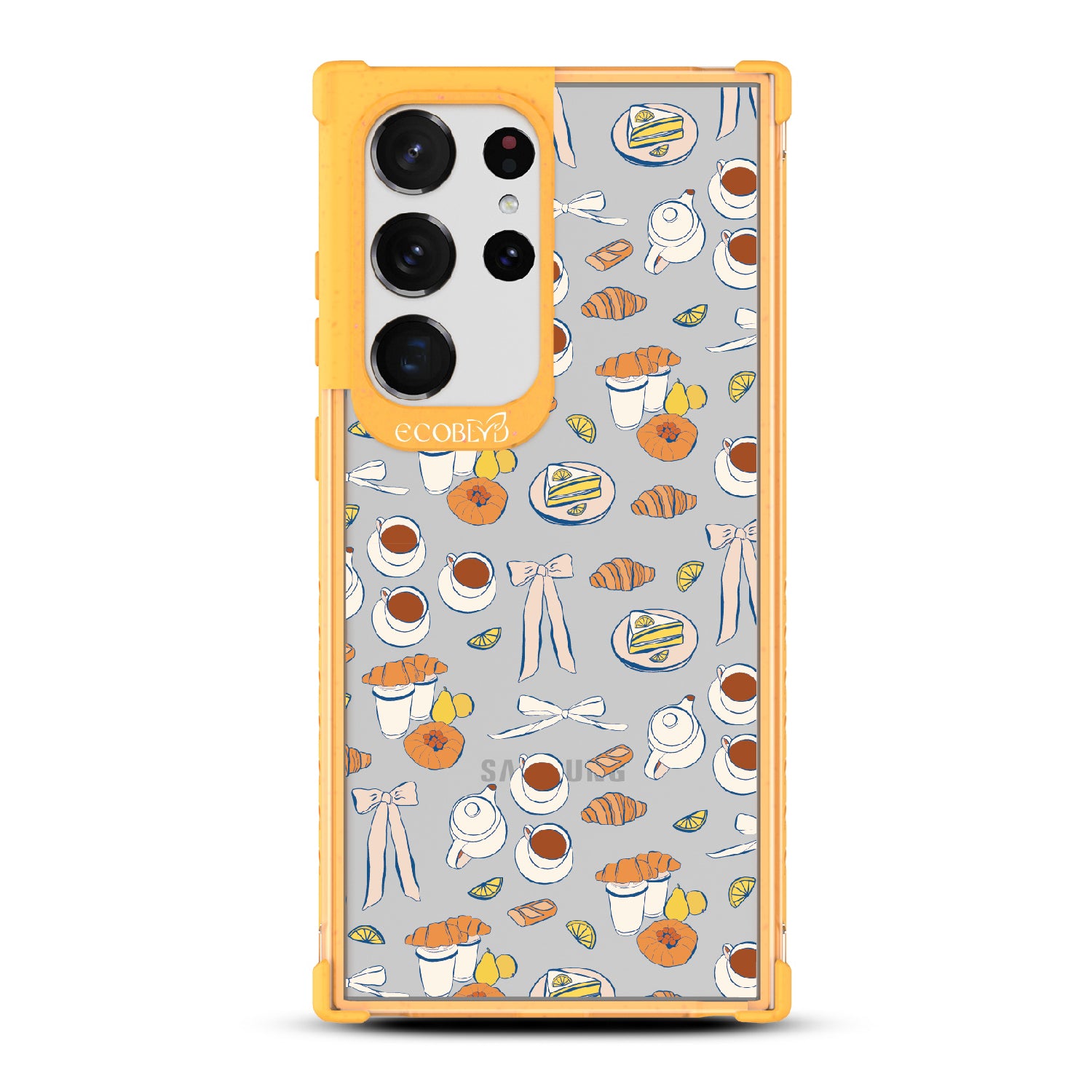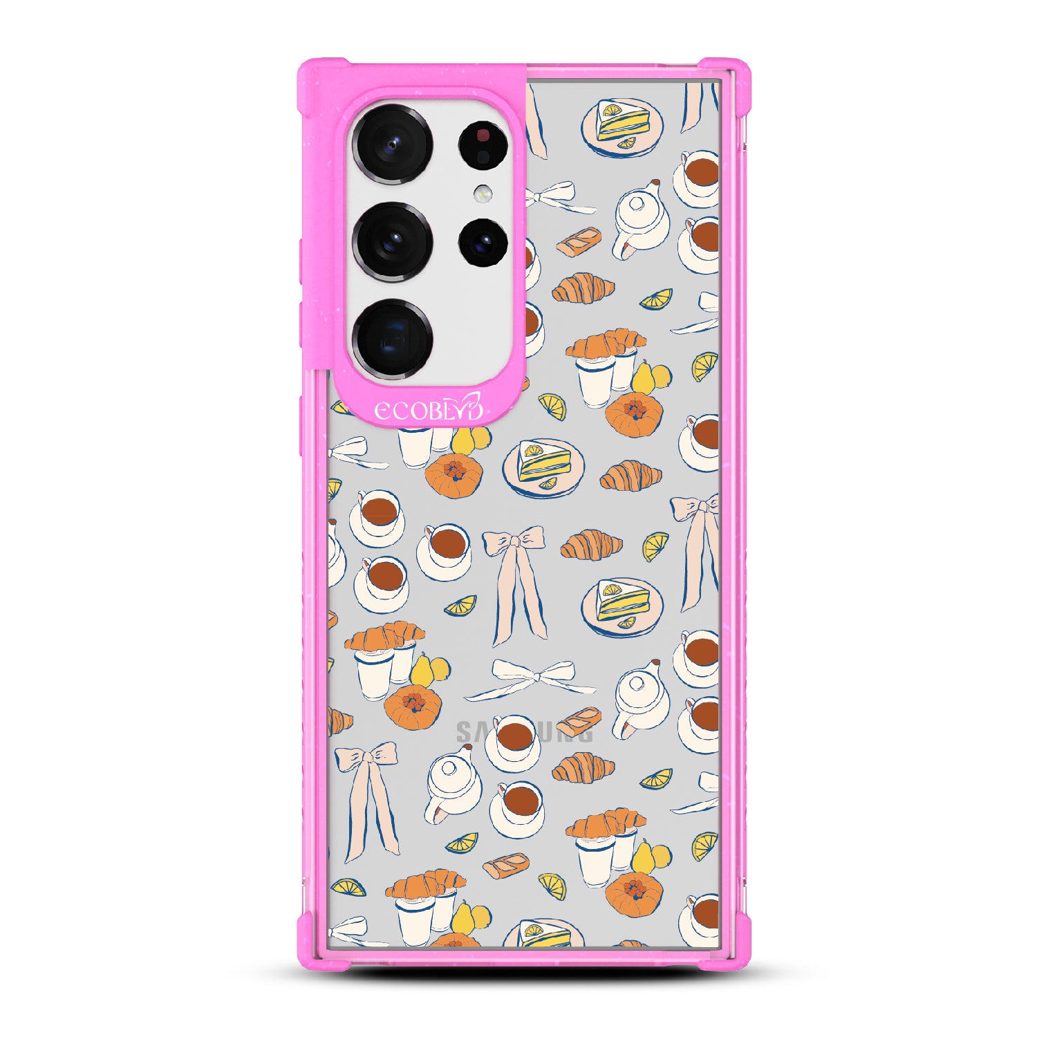 Tea time is the new happy hour. This design on our Laguna clear Galaxy S23 Ultra case combines whimsical teacups, dainty bows, and sweet pastel pastries in style as delightful as a perfect afternoon break. A tribute to making time for yourself with a touch of elegance.