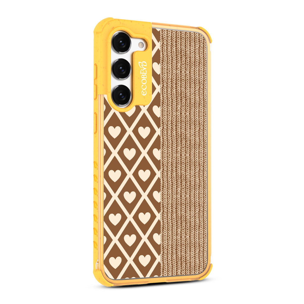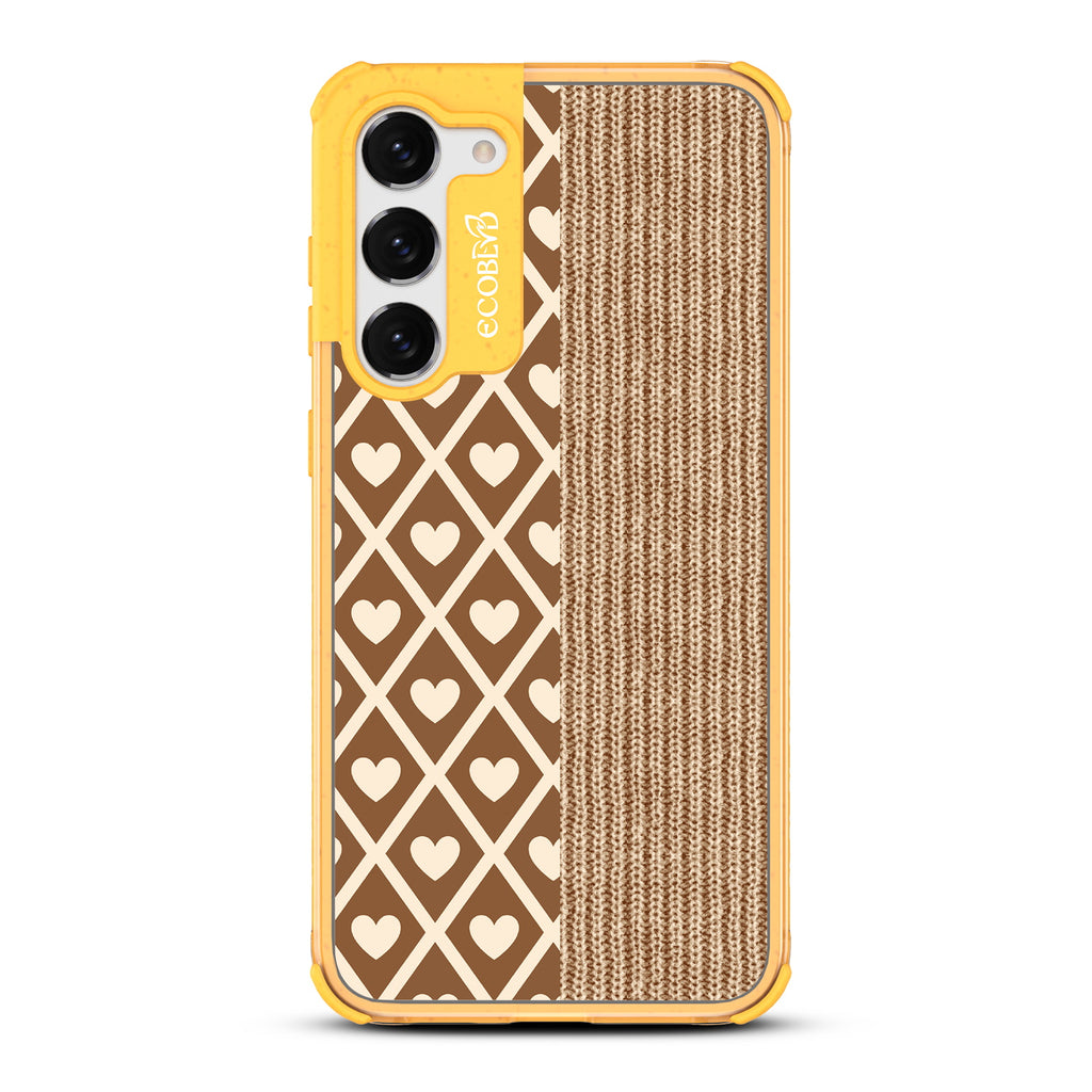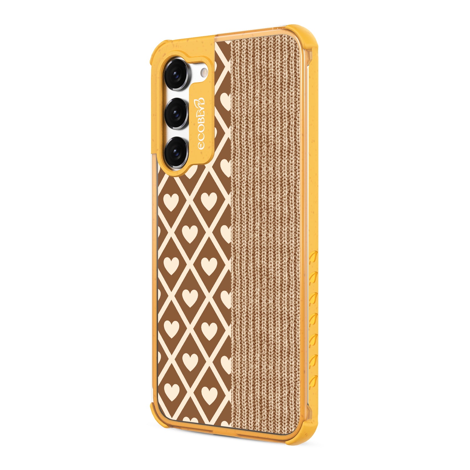 Captivate admiring looks as the Sew Adorable design on our Laguna clear Galaxy S23 case makes your phone look lovely and crafty as its decorated in brown and tan argyle gems and trimmed with tender hearts and a luxurious fabric for that special something touch in our Midnight Black, and Illuminating Yellow colorways.