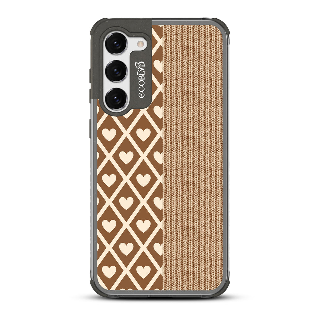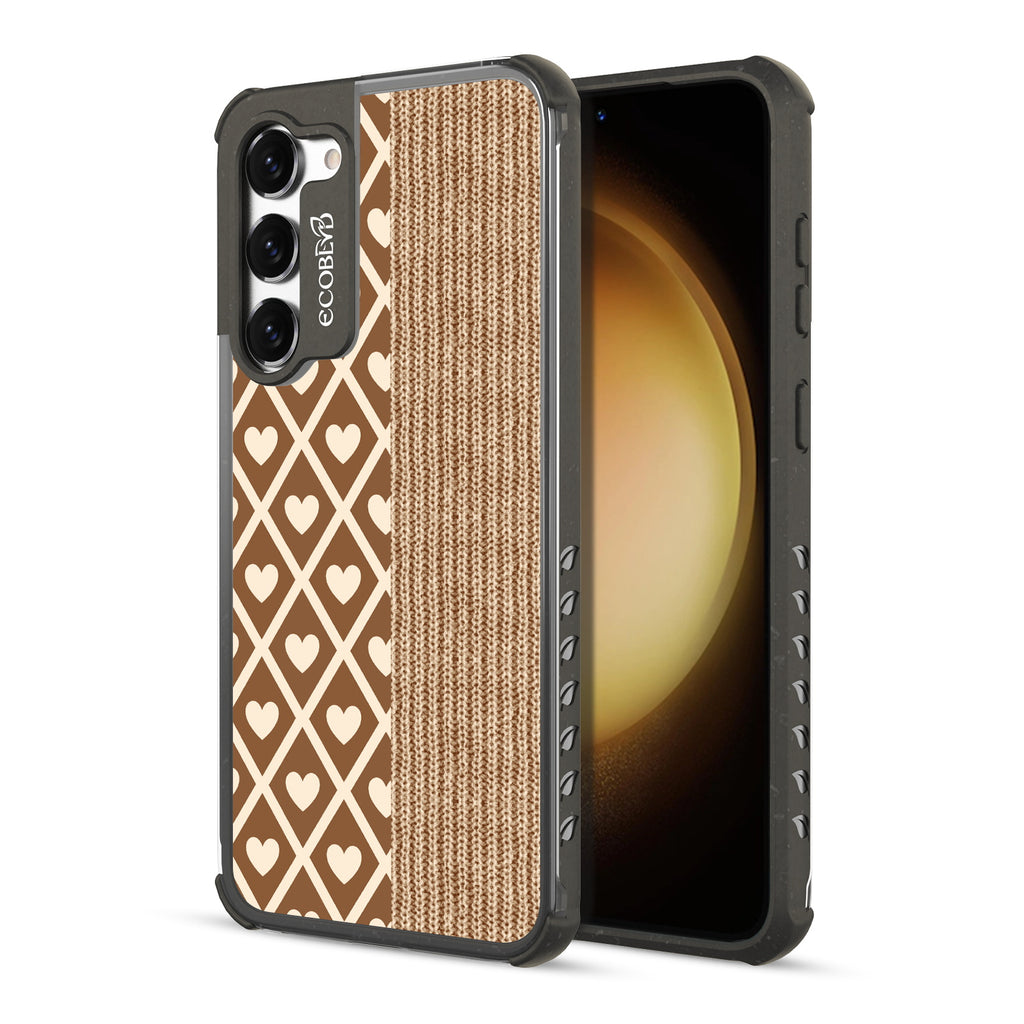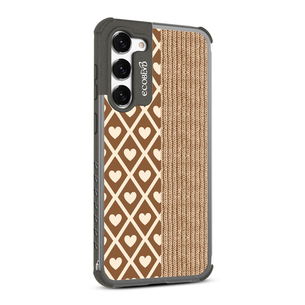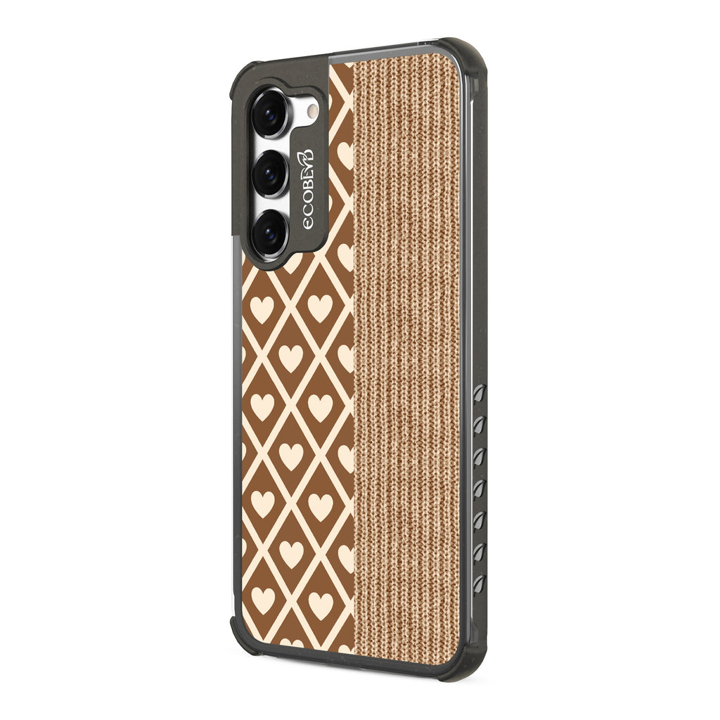 Captivate admiring looks as the Sew Adorable design on our Laguna clear Galaxy S23 case makes your phone look lovely and crafty as its decorated in brown and tan argyle gems and trimmed with tender hearts and a luxurious fabric for that special something touch in our Midnight Black, and Illuminating Yellow colorways.