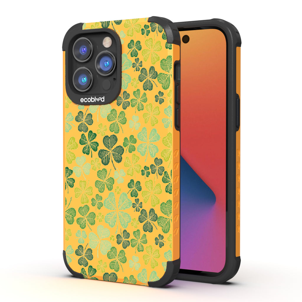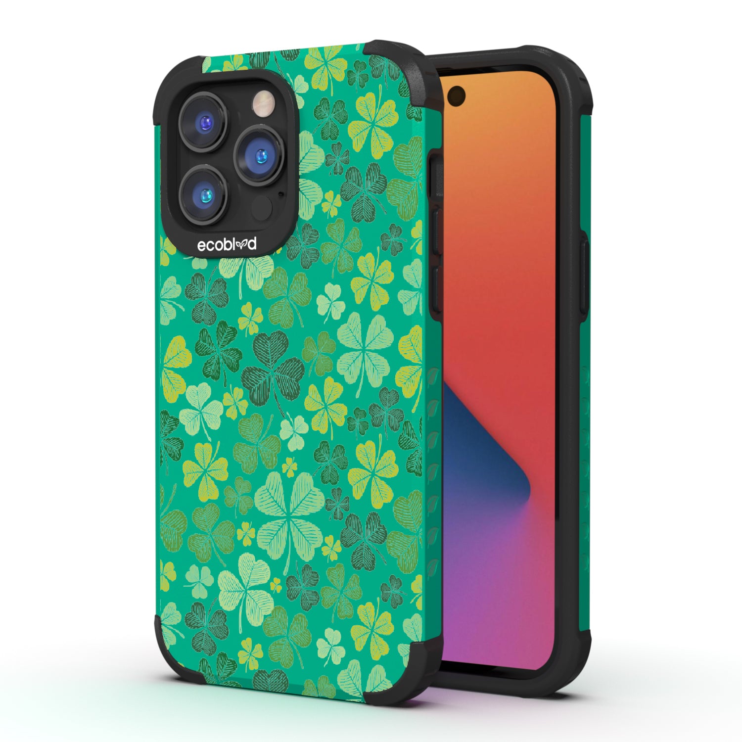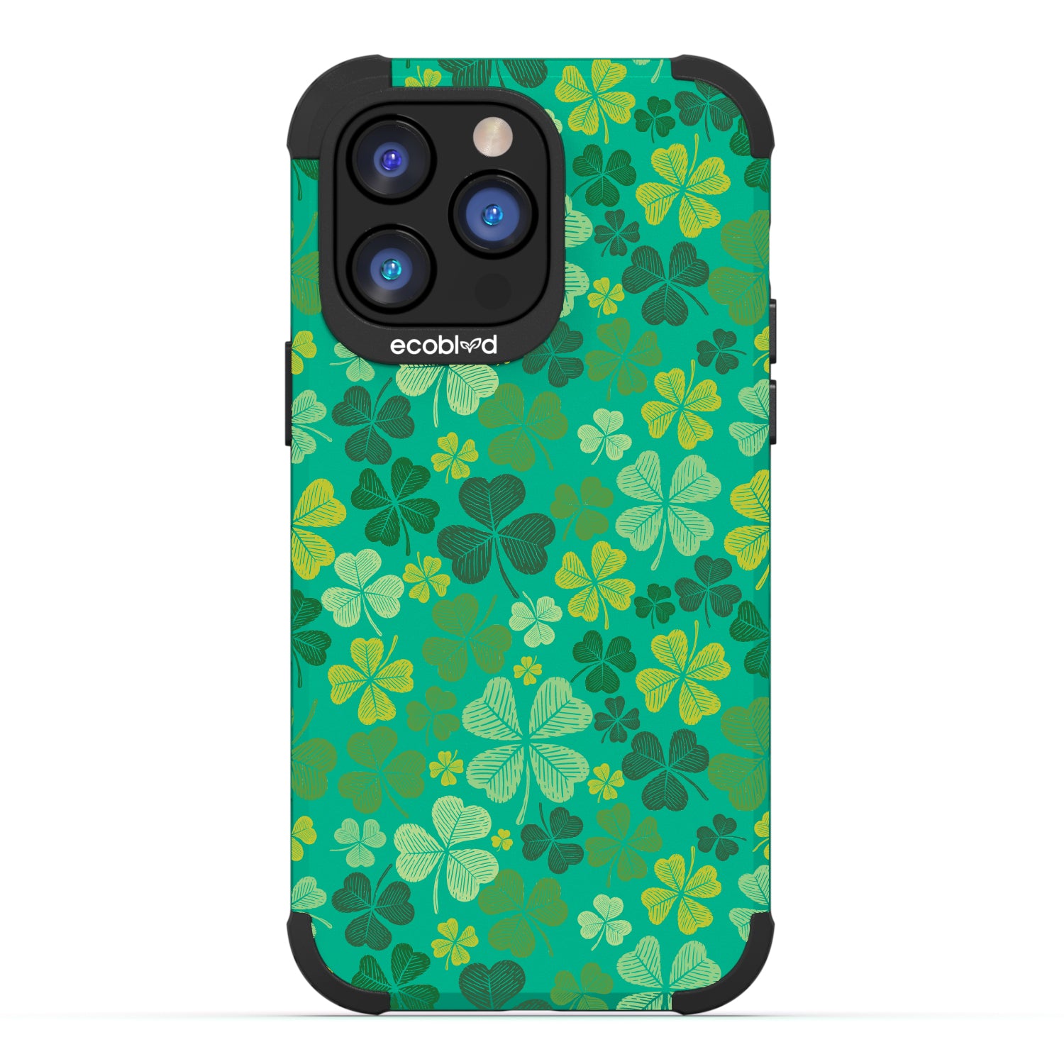 Turn your luck around with the vibrant Shamrock design on our Mojave rugged and compostable iPhone 14 Pro Max case, where every leaf whispers tales of fortune and fate. Adorned with a sea of green four-leaf clovers, this design is a true emblem of luck, designed to bring a touch of charm.