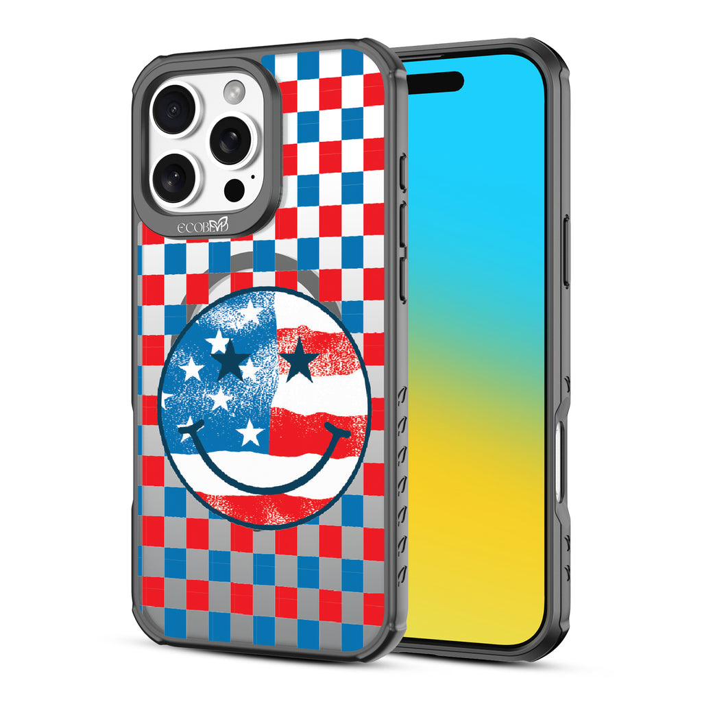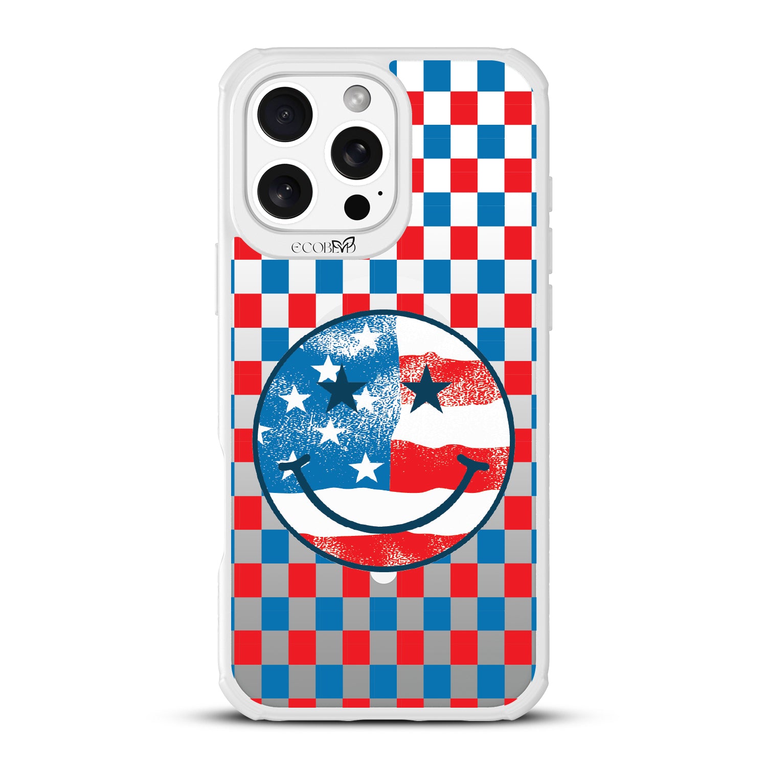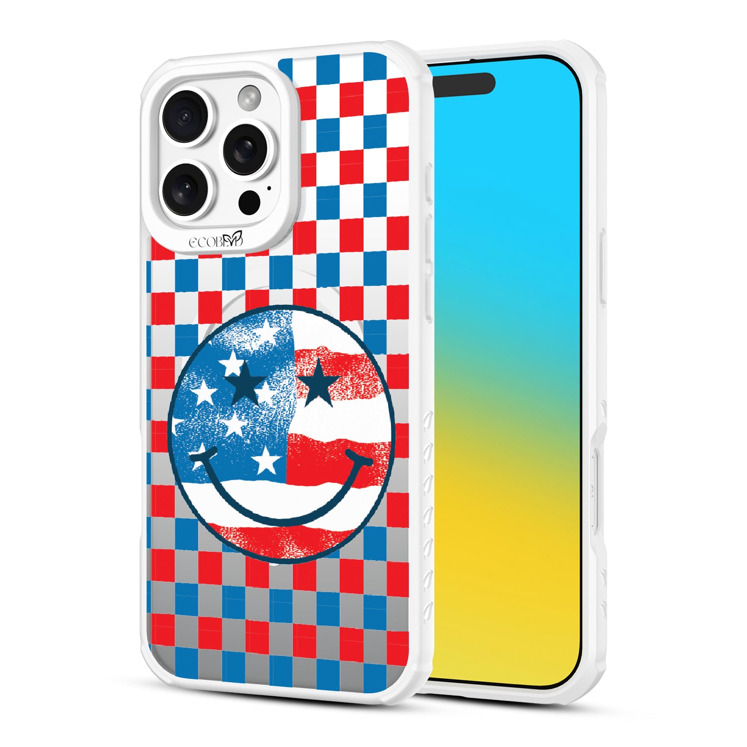 Rock your stars and stripes with The Anthem design on our Revive clear iPhone 16 Pro Max phone case. The edgy red, white, and blue checker print and iconic smiley face embody the punk spirit of freedom. Turn up the volume and let your phone sing its anthem.